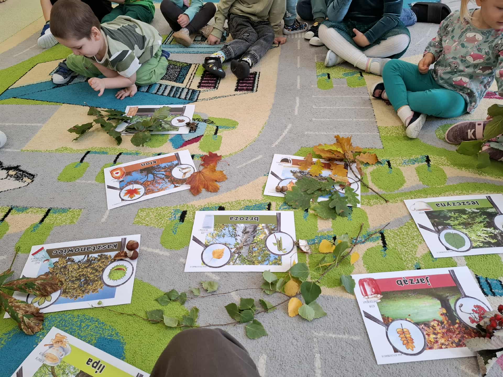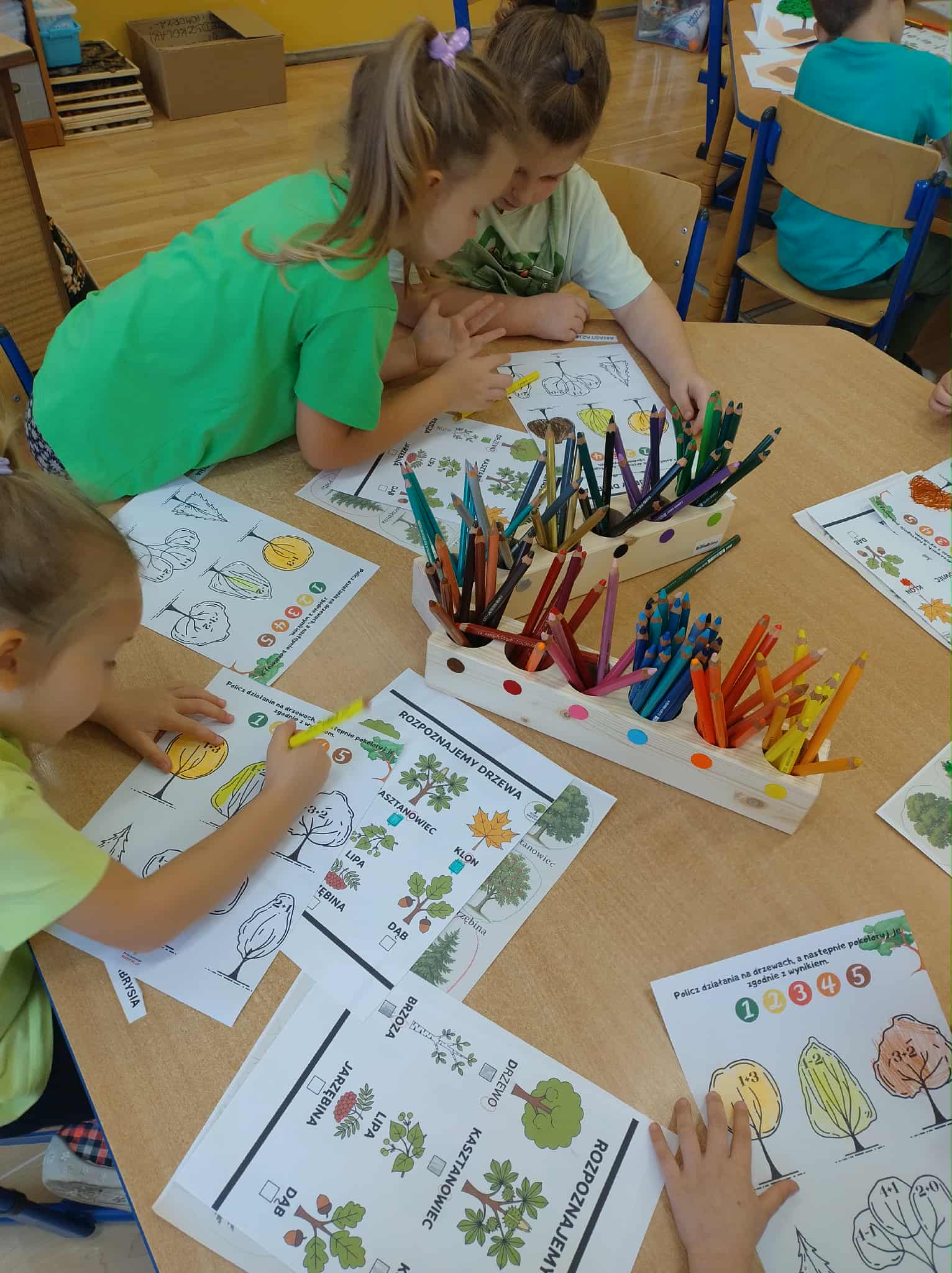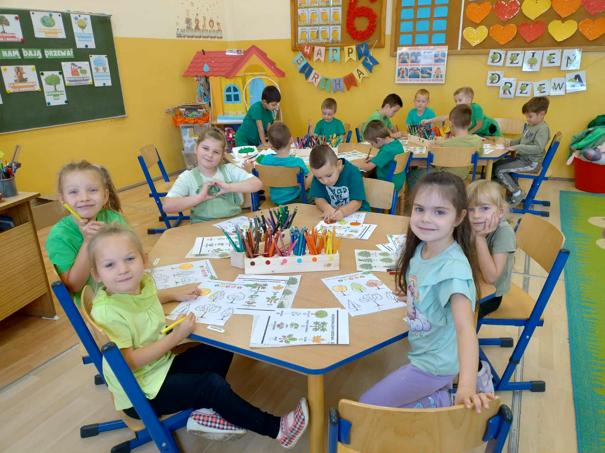 Najstarsze przedszkolaki – Misie – z ogromnym zaangażowaniem poznawały budowę drzewa: korzenie, pień, gałęzie i liście. Rozmawiały także o gatunkach drzew i potrafiły wskazać, czym poszczególne gatunki różnią się między sobą. Misie już doskonale wiedzą, dlaczego drzewa są nam potrzebne. Rozwiązywały też zadania z literkami, tworząc wyrazy związane z lasem i przyrodą, wyszukiwały literki w nazwach drzew itp. Misie, wykorzystując swoją wyobraźnię stworzyły drzewo sensoryczne.
