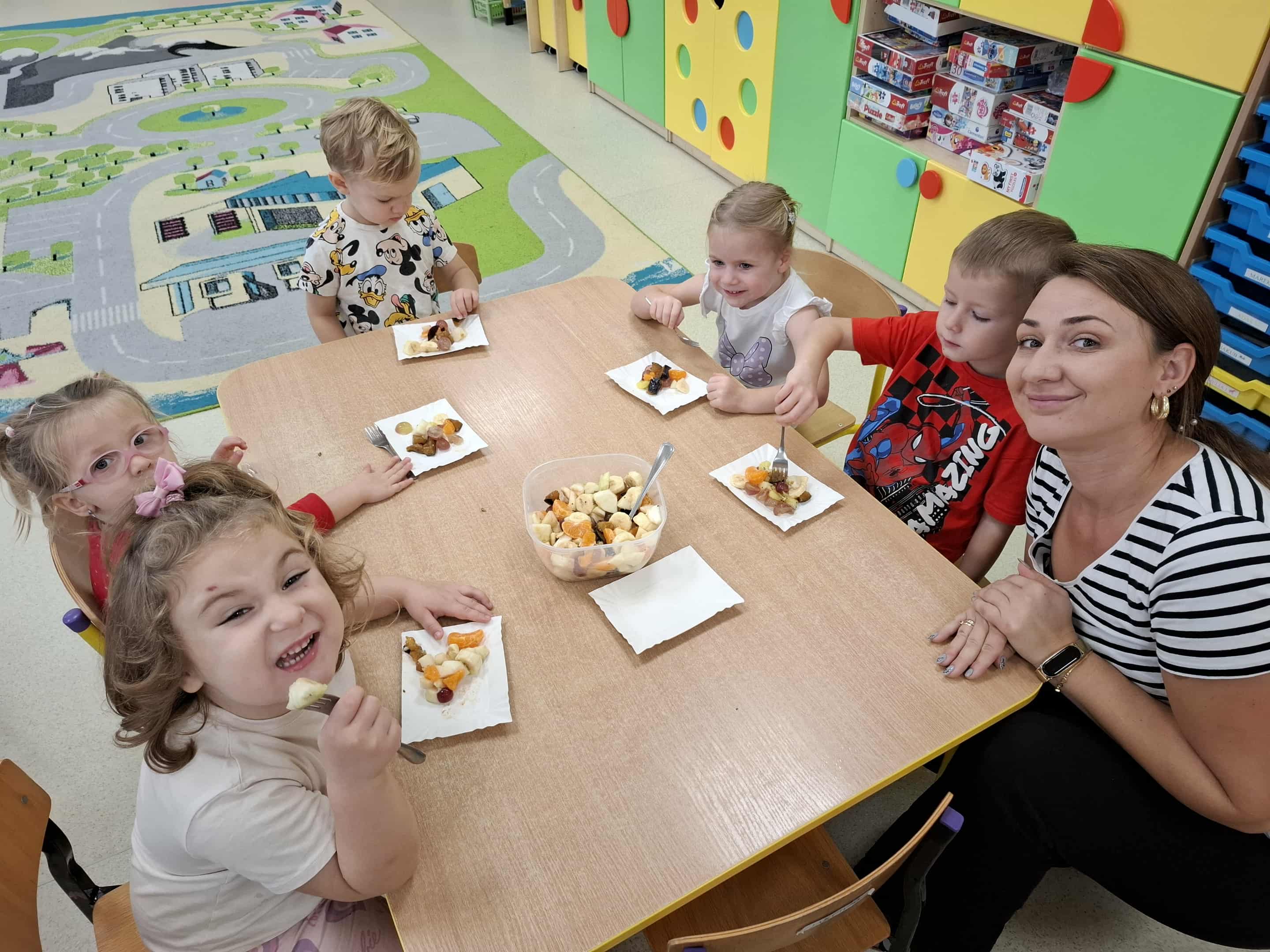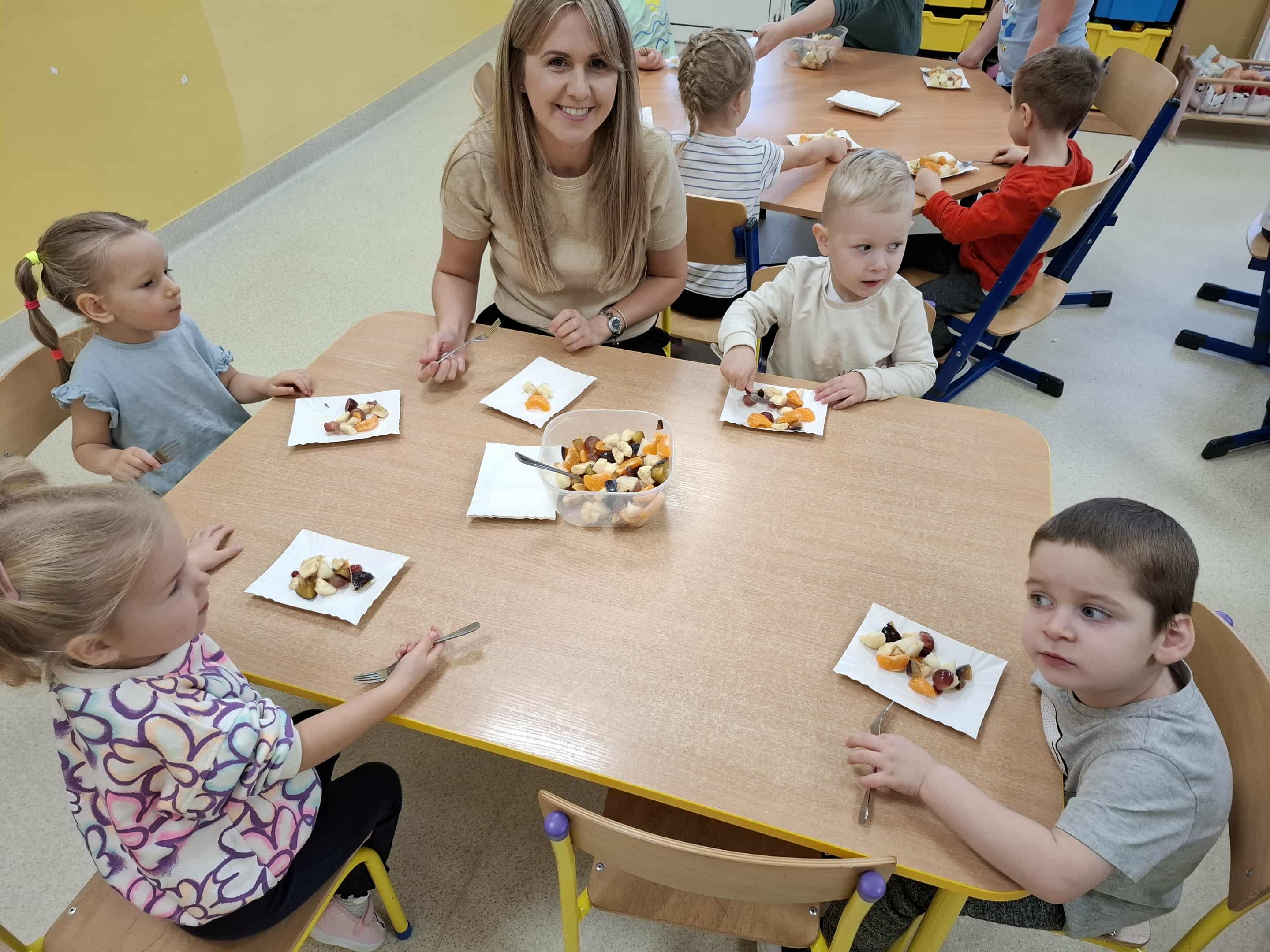 17 października dzieci z grupy Biedronki obchodziły Dzień Owoców i Warzyw – wyjątkowe święto promujące zdrowe odżywianie i wspólne spędzanie czasu. Z tej okazji dzieci wraz z rodzicami przygotowały pyszną, kolorową sałatkę owocową. Wspólne krojenie, mieszanie i dekorowanie przyniosło wszystkim wiele radości, a przygotowane potrawy nie tylko pięknie wyglądały, ale przede wszystkim – wyśmienicie smakowały!
