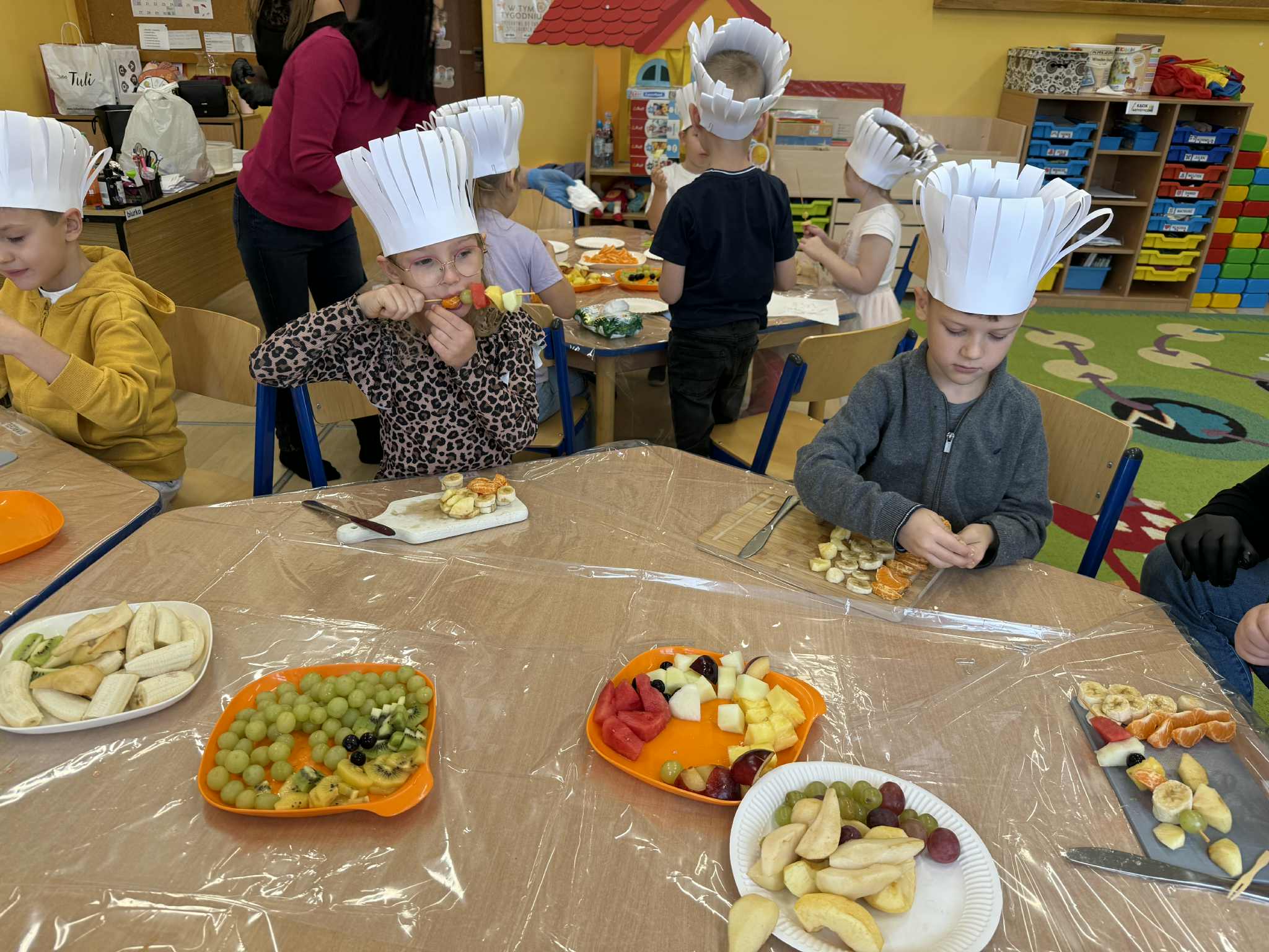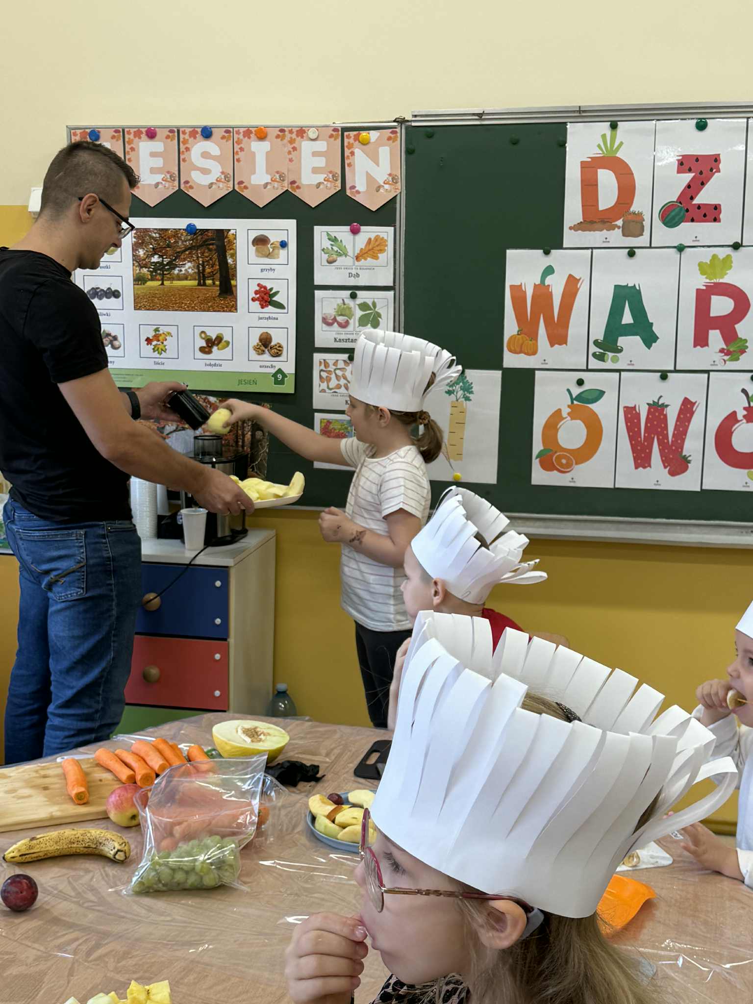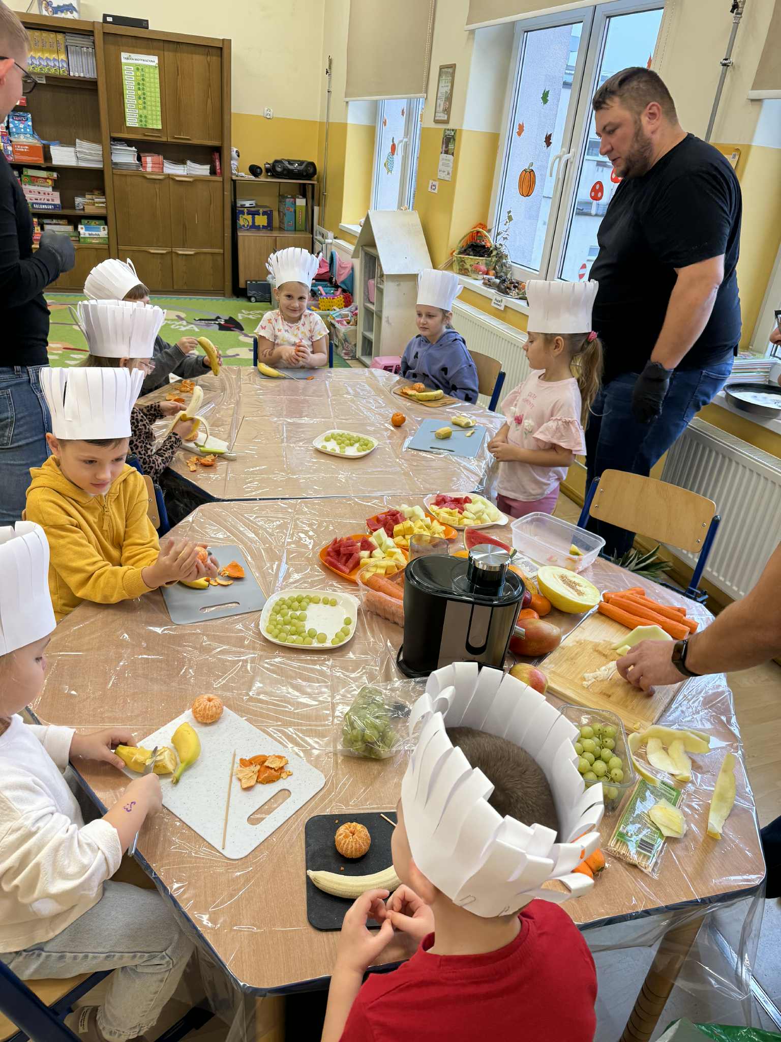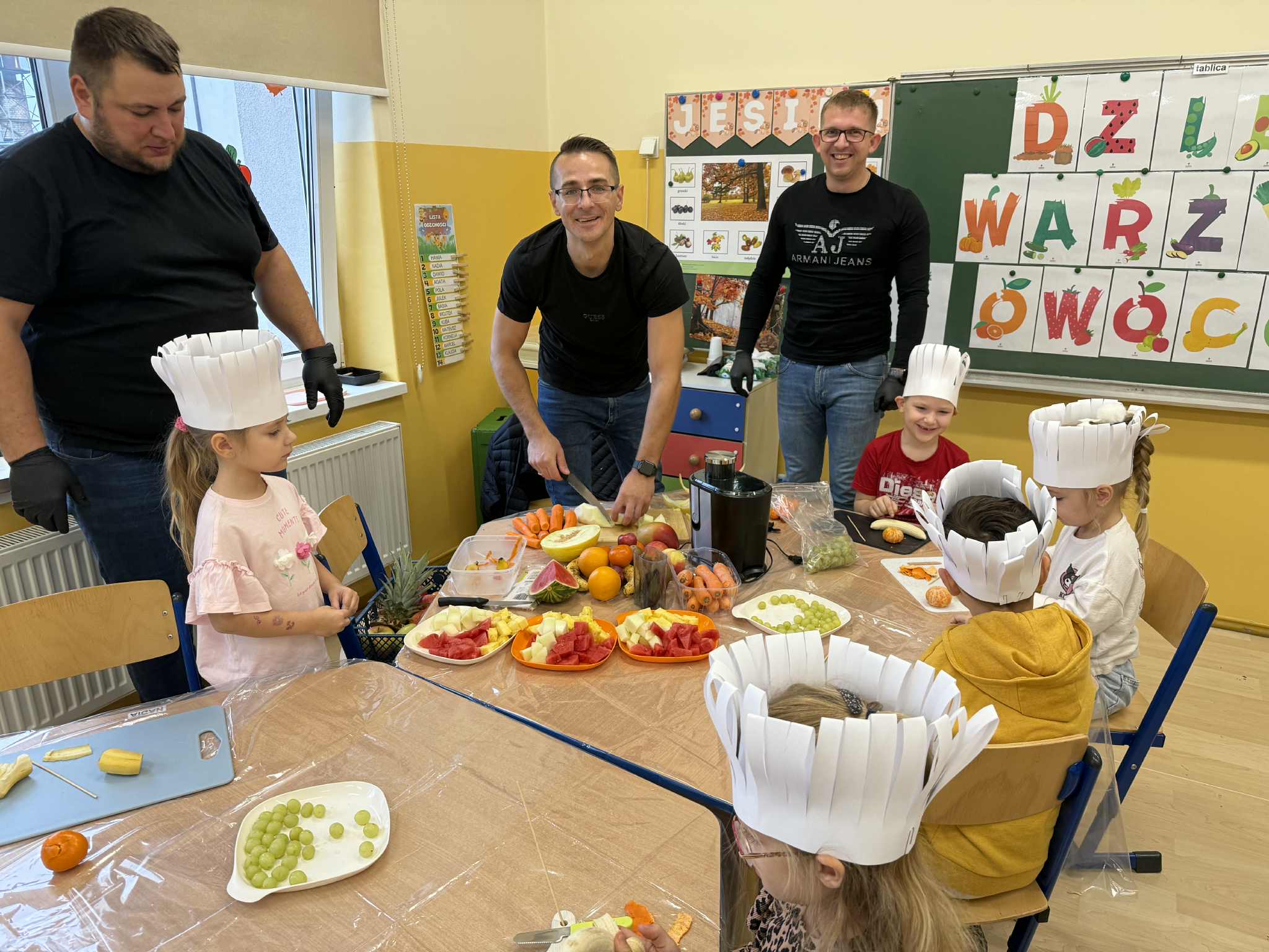 W grupie „Pszczółki” świętowaliśmy Dzień Warzyw i Owoców! Tego dnia w naszej sali było wyjątkowo kolorowo, pachnąco i bardzo wesoło. Dzieci wspólnie z rodzicami uczestniczyły w zabawach ruchowych i konkursach, podczas których odgadywały, jaki to owoc lub warzywo. Było mnóstwo śmiechu i zaskoczeń – nie zawsze łatwo było rozpoznać marchewkę z zamkniętymi oczami! Najwięcej emocji wzbudziły warsztaty kulinarne. Każde dziecko mogło samodzielnie przygotować kolorowe i zdrowe szaszłyki owocowe oraz wycisnąć pyszny sok z ulubionych owoców i warzyw. W całej sali unosił się piękny zapach, a na buziach dzieci gościły szerokie uśmiechy. To był dzień pełen radości, wspólnej zabawy i nauki o tym, jak ważne jest zdrowe odżywianie. „Pszczółki” przekonały się, że warzywa i owoce są nie tylko zdrowe, ale też bardzo smaczne! Serdecznie dziękujemy Rodzicom za zaangażowanie, pomoc i wspólną zabawę. Dzięki Wam ten dzień był jeszcze bardziej wyjątkowy.