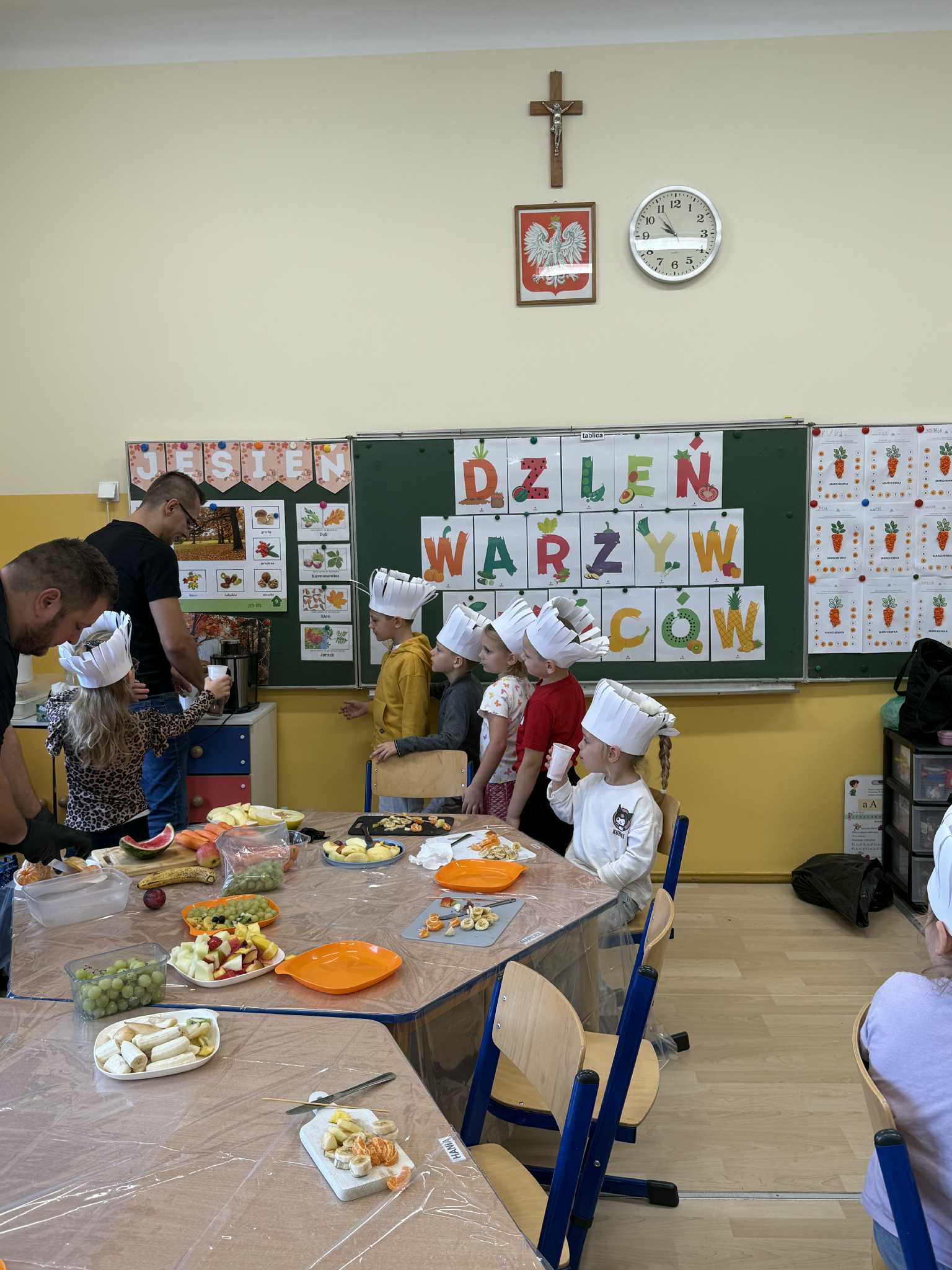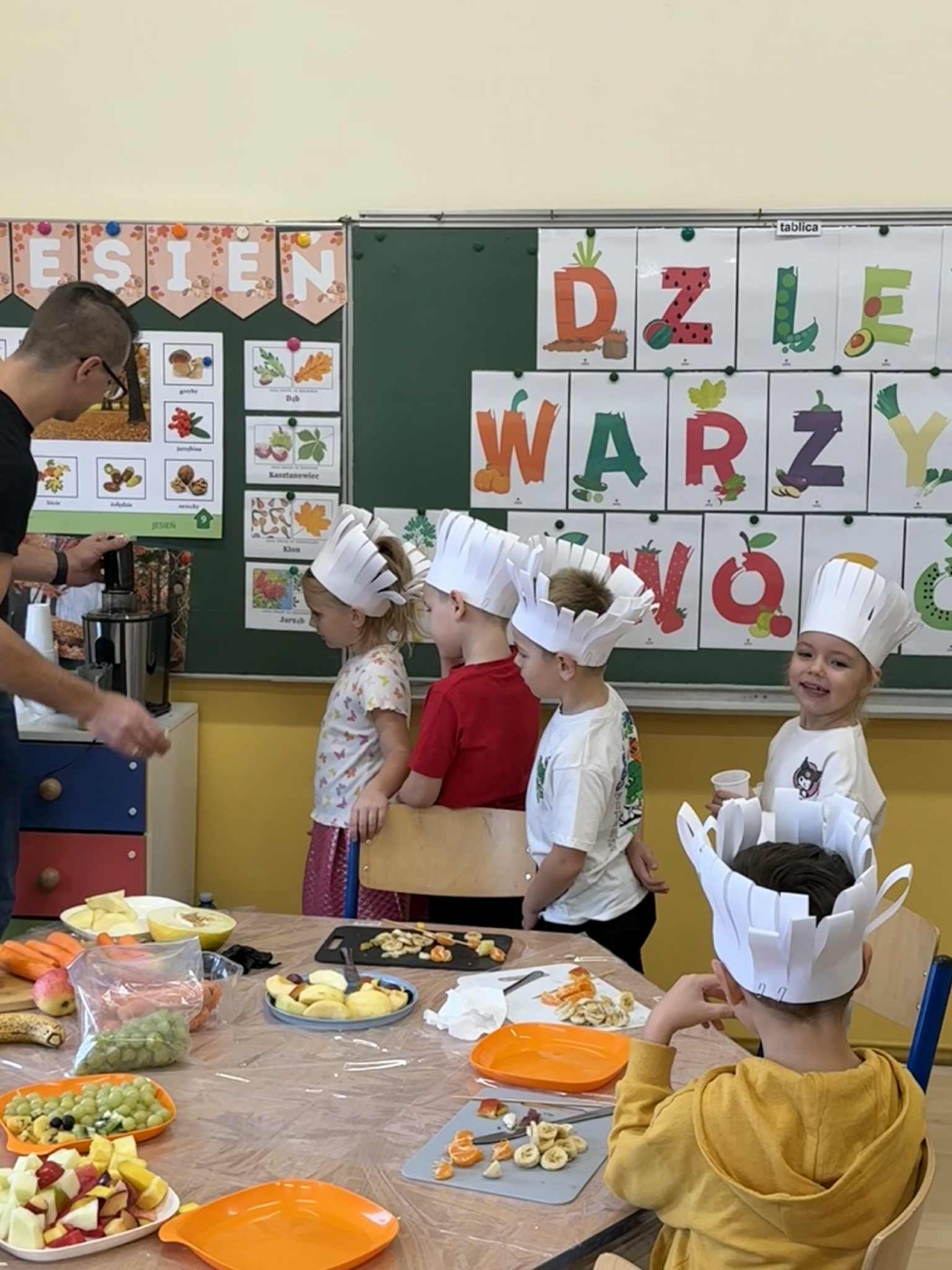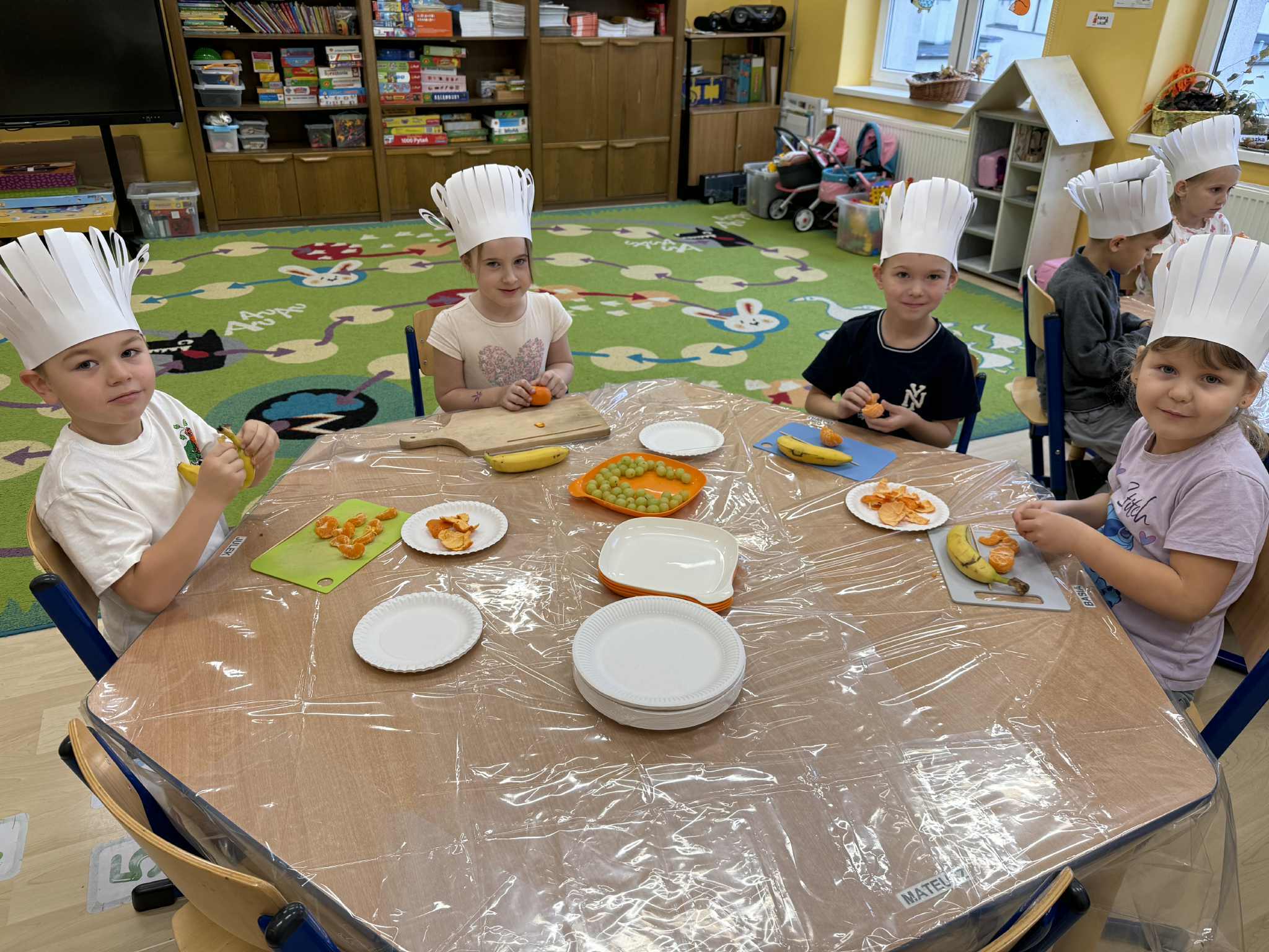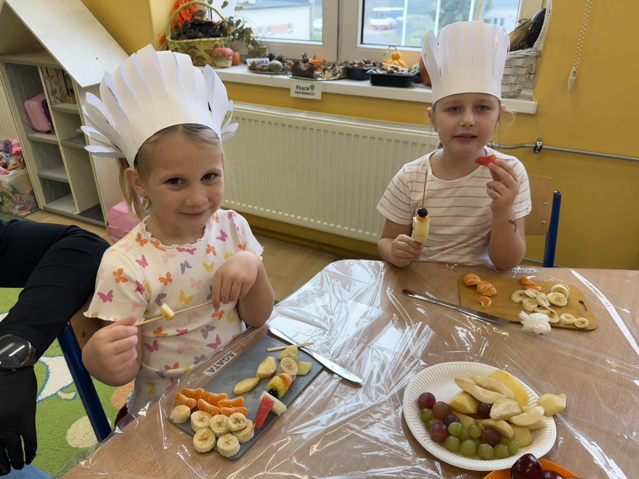 W grupie „Pszczółki” świętowaliśmy Dzień Warzyw i Owoców! Tego dnia w naszej sali było wyjątkowo kolorowo, pachnąco i bardzo wesoło. Dzieci wspólnie z rodzicami uczestniczyły w zabawach ruchowych i konkursach, podczas których odgadywały, jaki to owoc lub warzywo. Było mnóstwo śmiechu i zaskoczeń – nie zawsze łatwo było rozpoznać marchewkę z zamkniętymi oczami! Najwięcej emocji wzbudziły warsztaty kulinarne. Każde dziecko mogło samodzielnie przygotować kolorowe i zdrowe szaszłyki owocowe oraz wycisnąć pyszny sok z ulubionych owoców i warzyw. W całej sali unosił się piękny zapach, a na buziach dzieci gościły szerokie uśmiechy. To był dzień pełen radości, wspólnej zabawy i nauki o tym, jak ważne jest zdrowe odżywianie. „Pszczółki” przekonały się, że warzywa i owoce są nie tylko zdrowe, ale też bardzo smaczne! Serdecznie dziękujemy Rodzicom za zaangażowanie, pomoc i wspólną zabawę. Dzięki Wam ten dzień był jeszcze bardziej wyjątkowy.