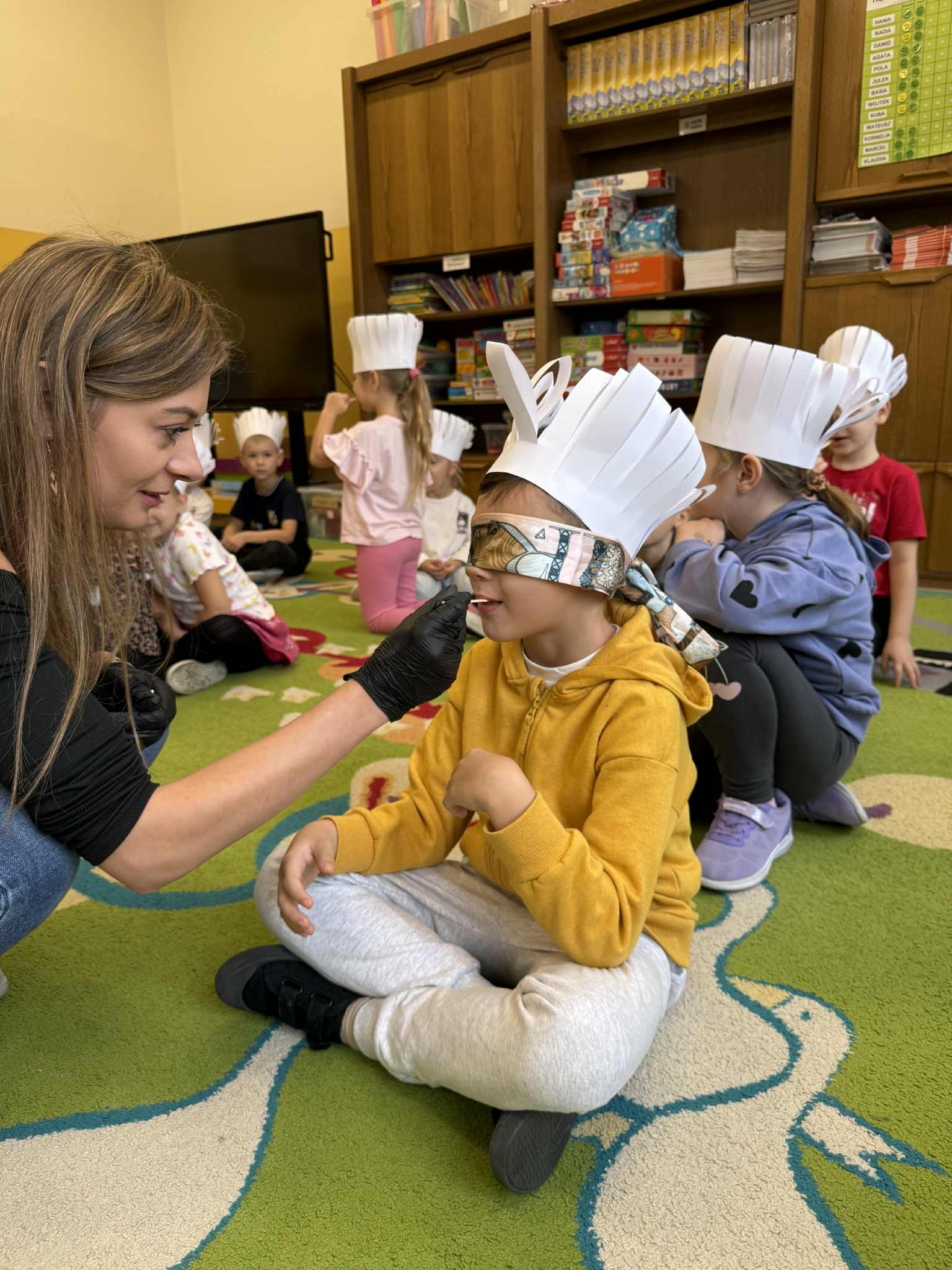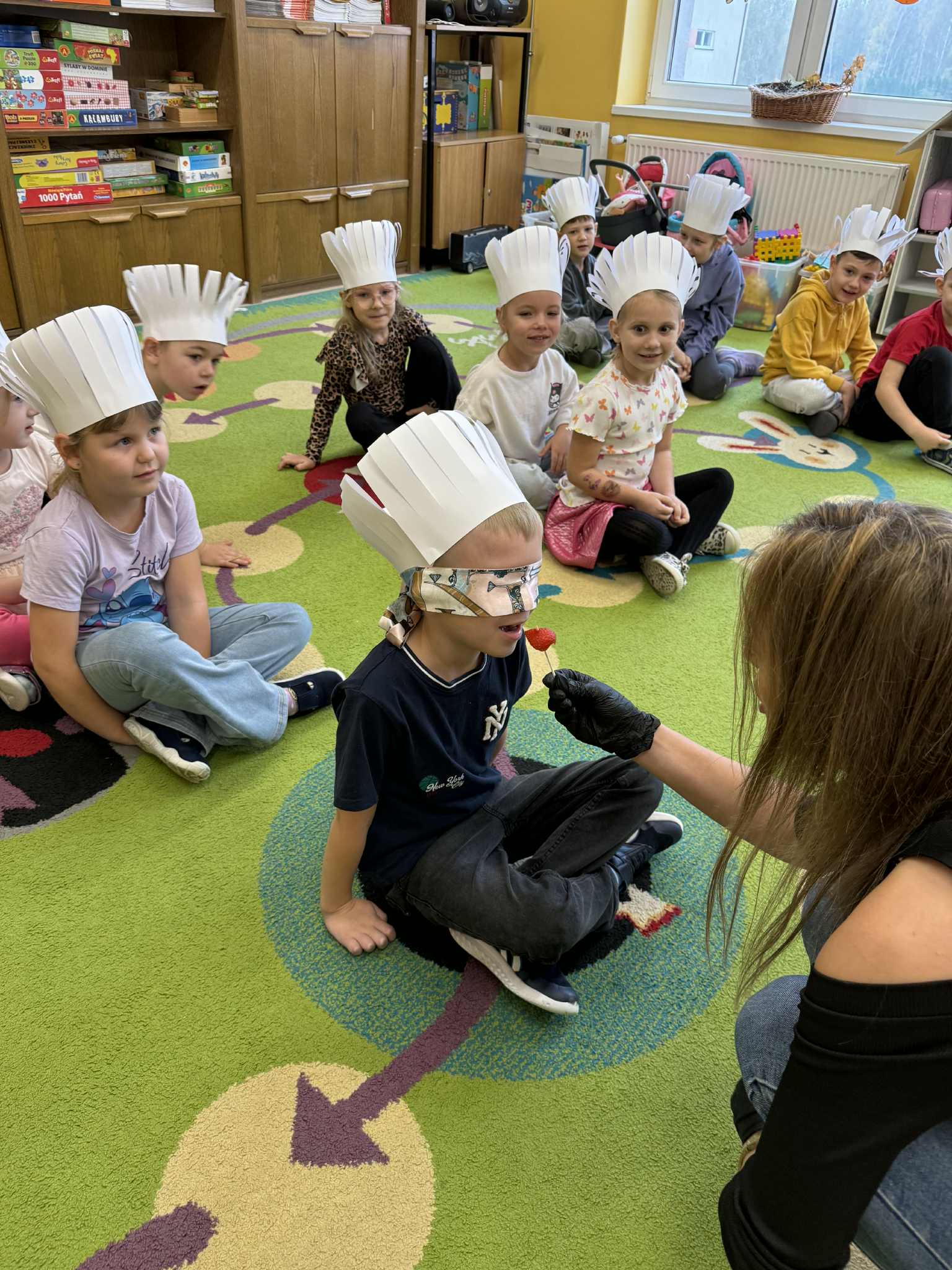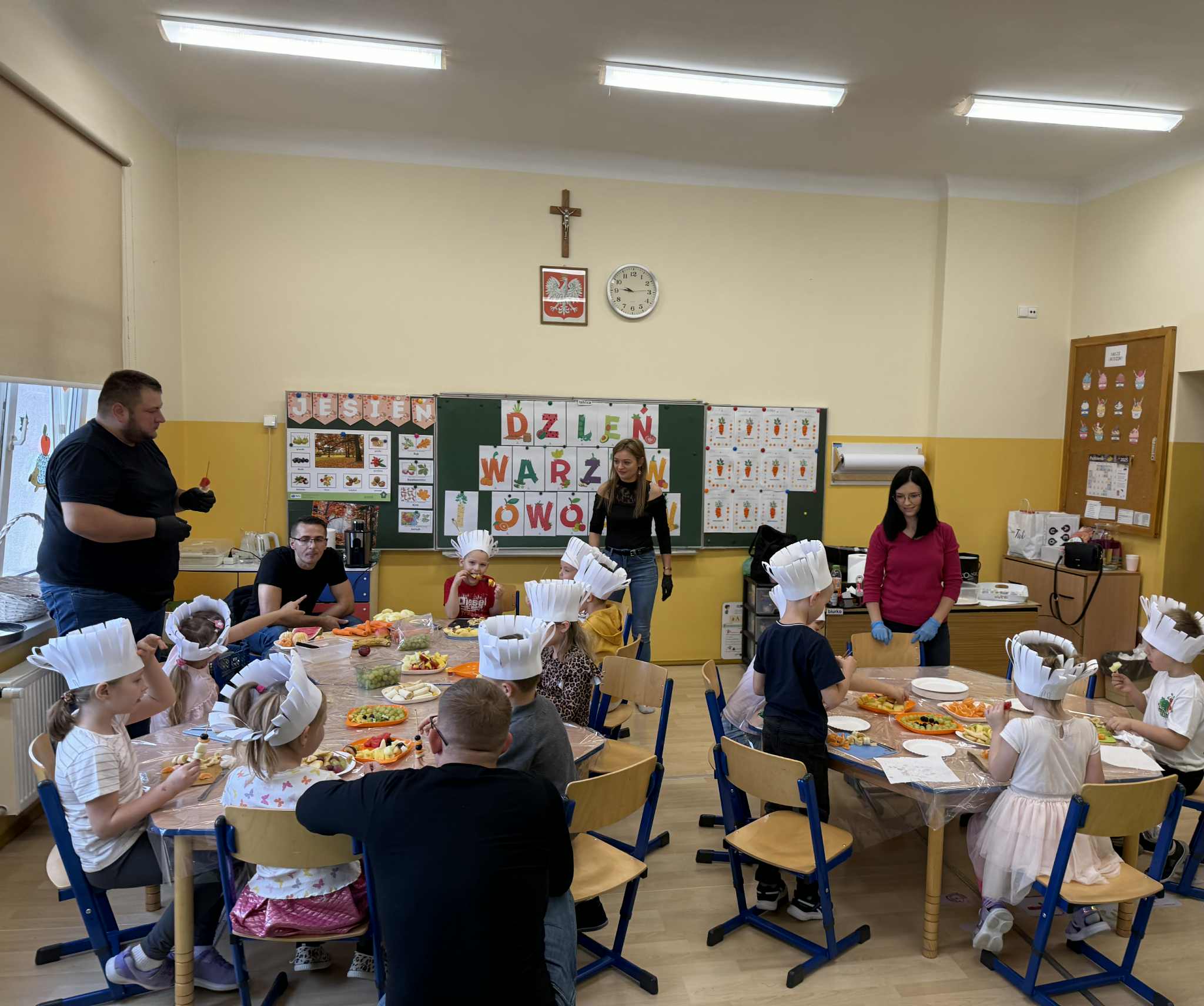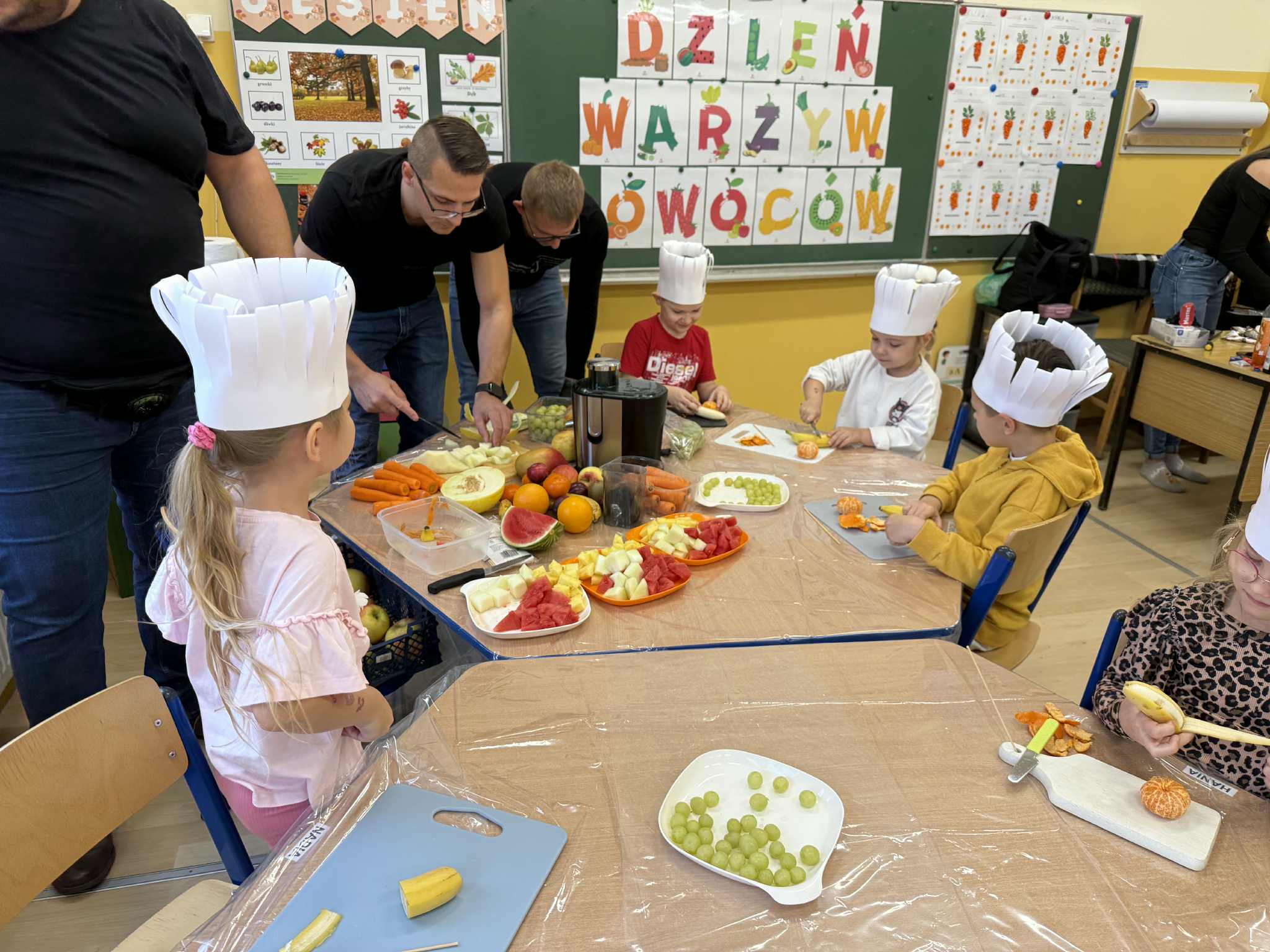 W grupie „Pszczółki” świętowaliśmy Dzień Warzyw i Owoców! Tego dnia w naszej sali było wyjątkowo kolorowo, pachnąco i bardzo wesoło. Dzieci wspólnie z rodzicami uczestniczyły w zabawach ruchowych i konkursach, podczas których odgadywały, jaki to owoc lub warzywo. Było mnóstwo śmiechu i zaskoczeń – nie zawsze łatwo było rozpoznać marchewkę z zamkniętymi oczami! Najwięcej emocji wzbudziły warsztaty kulinarne. Każde dziecko mogło samodzielnie przygotować kolorowe i zdrowe szaszłyki owocowe oraz wycisnąć pyszny sok z ulubionych owoców i warzyw. W całej sali unosił się piękny zapach, a na buziach dzieci gościły szerokie uśmiechy. To był dzień pełen radości, wspólnej zabawy i nauki o tym, jak ważne jest zdrowe odżywianie. „Pszczółki” przekonały się, że warzywa i owoce są nie tylko zdrowe, ale też bardzo smaczne! Serdecznie dziękujemy Rodzicom za zaangażowanie, pomoc i wspólną zabawę. Dzięki Wam ten dzień był jeszcze bardziej wyjątkowy.