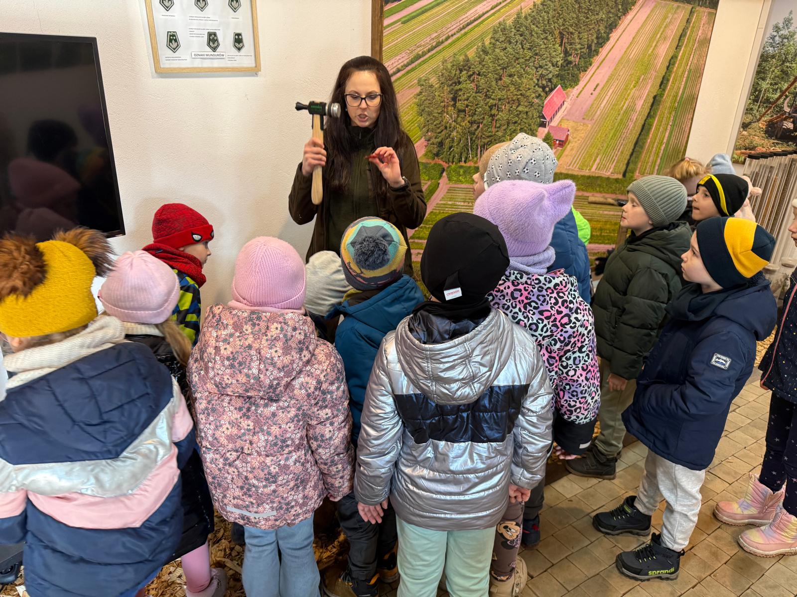 Następnie przedszkolaki wzięły udział w zajęciach w izbie edukacyjnej, podczas których dowiedziały się wielu nowych rzeczy o roślinach, zwierzętach oraz pracy leśnika. Była to także doskonała okazja do przypomnienia i podsumowania wiedzy, którą dzieci zdobywały wcześniej podczas zajęć w przedszkolu.