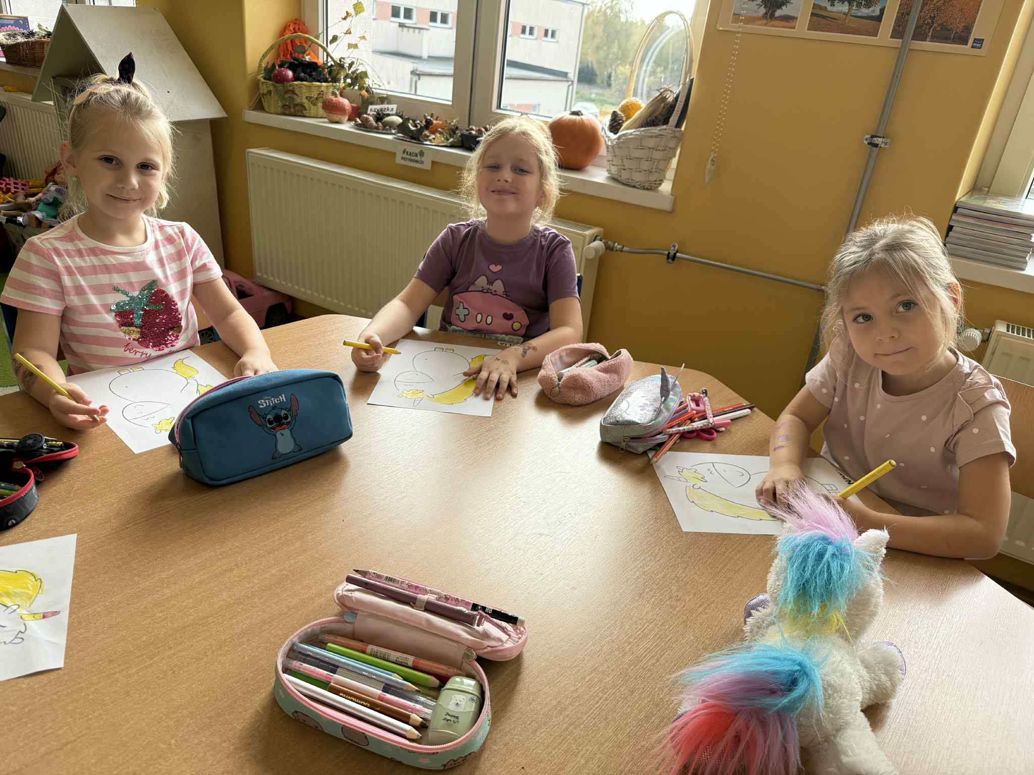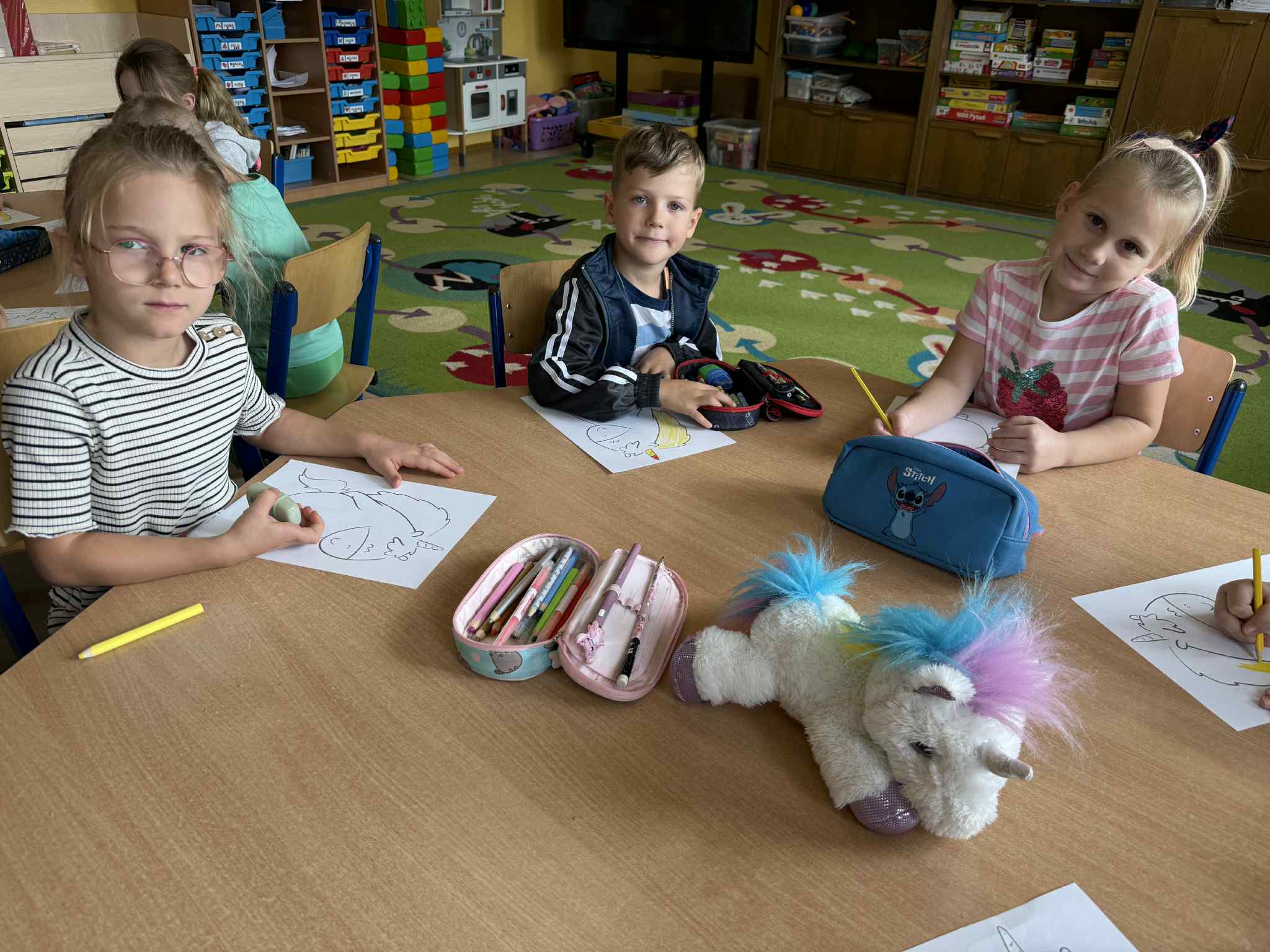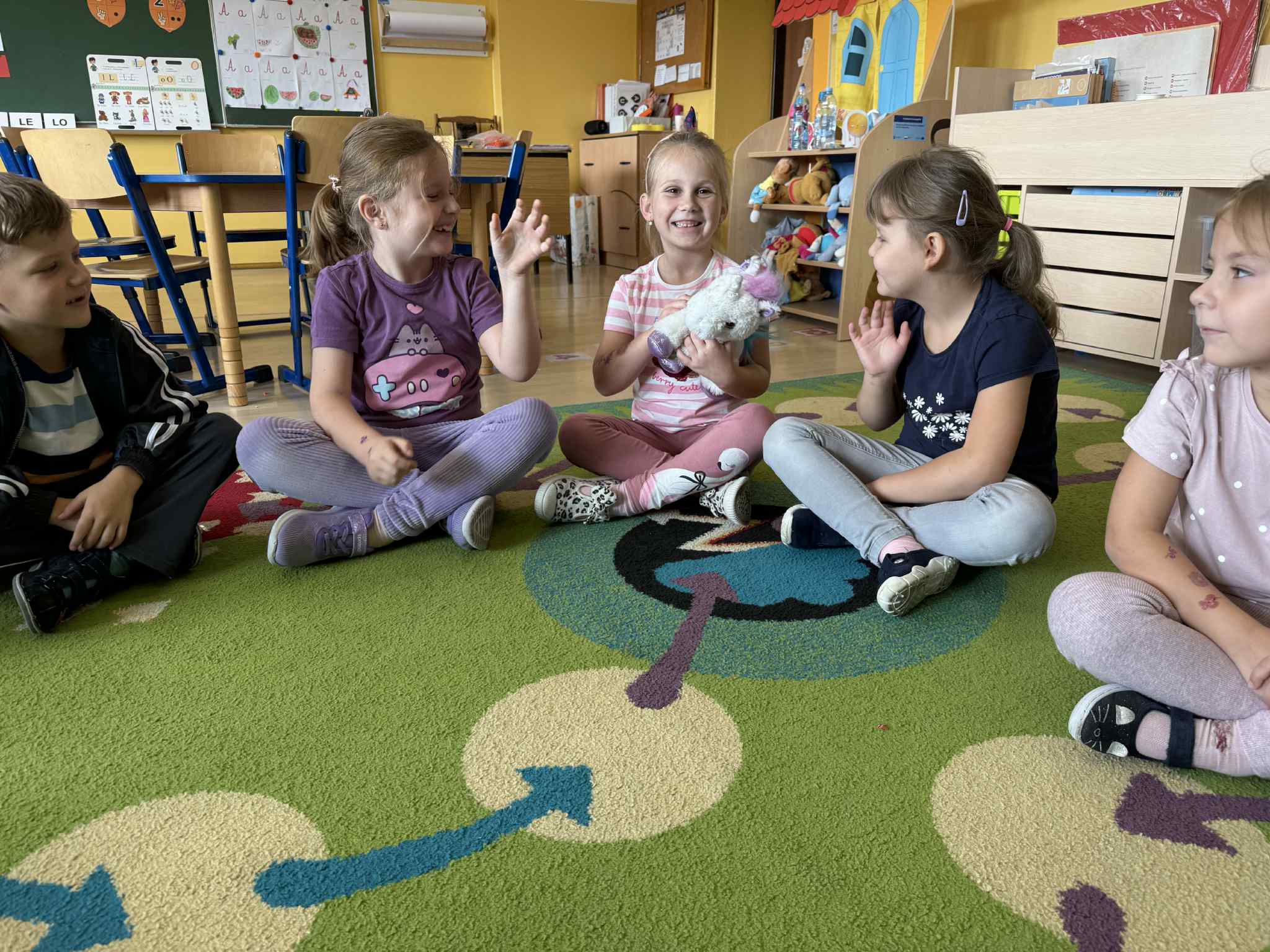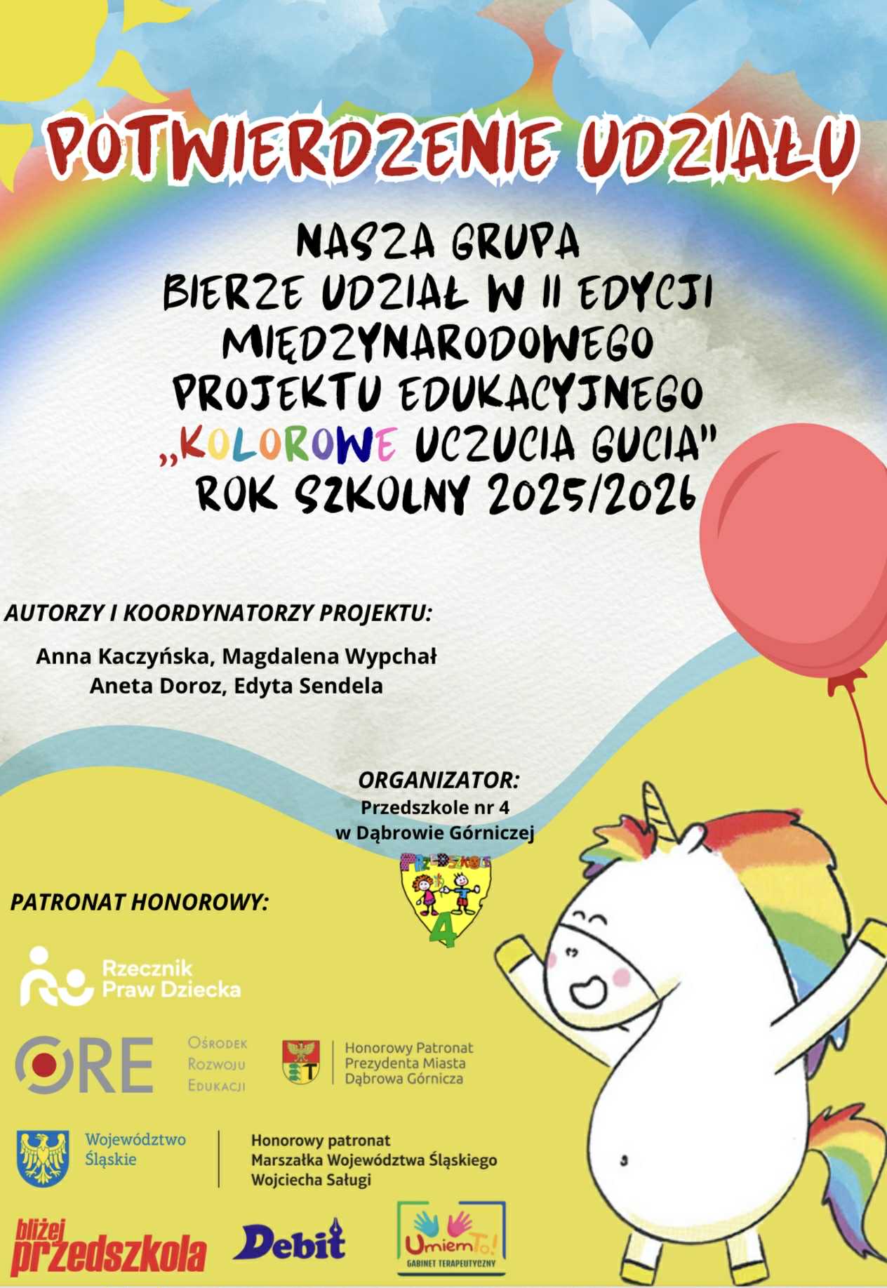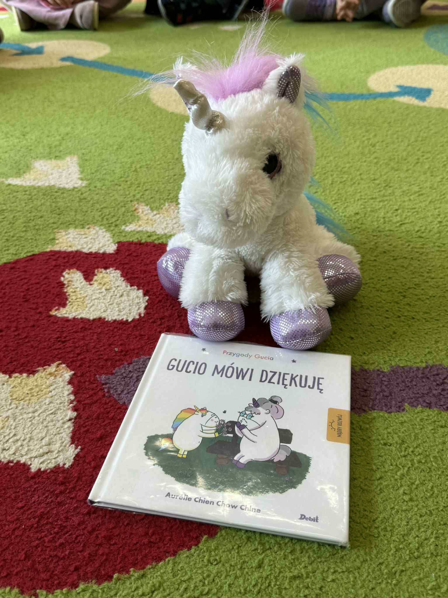 W roku szkolnym 2025/2026 grupa Pszczółki bierze udział w Międzynarodowym Projekcie Edukacyjnym "Kolorowe uczucia Gucia". Głównym założeniem projektu jest wspieranie rozwoju emocjonalnego dzieci, kształtowanie umiejętności rozpoznawania, nazywania i okazywania własnych emocji, dostrzegania ich u innych, a także budowania relacji opartych na wzajemnym szacunku i zrozumieniu. W realizacji tych zadań dzieciom towarzyszy Gucio - sympatyczny jednorożec, który jest głównym bohaterem książeczek. Dzieci chętnie przywitały się z Guciem i z zainteresowaniem wysłuchały opowiadania - „Gucio mówi dziękuję”. Po wysłuchaniu bajki omawiały emocje bohatera, rozwijając umiejętność rozpoznawania i nazywania uczuć, a także wykonały pracę plastyczną.