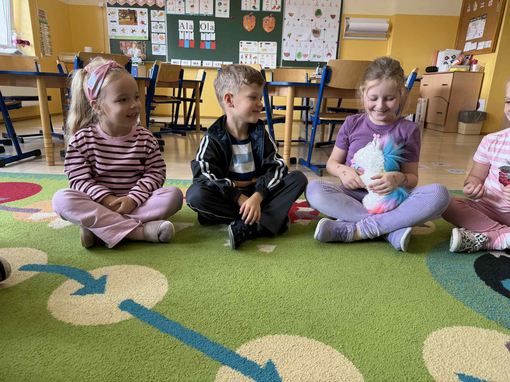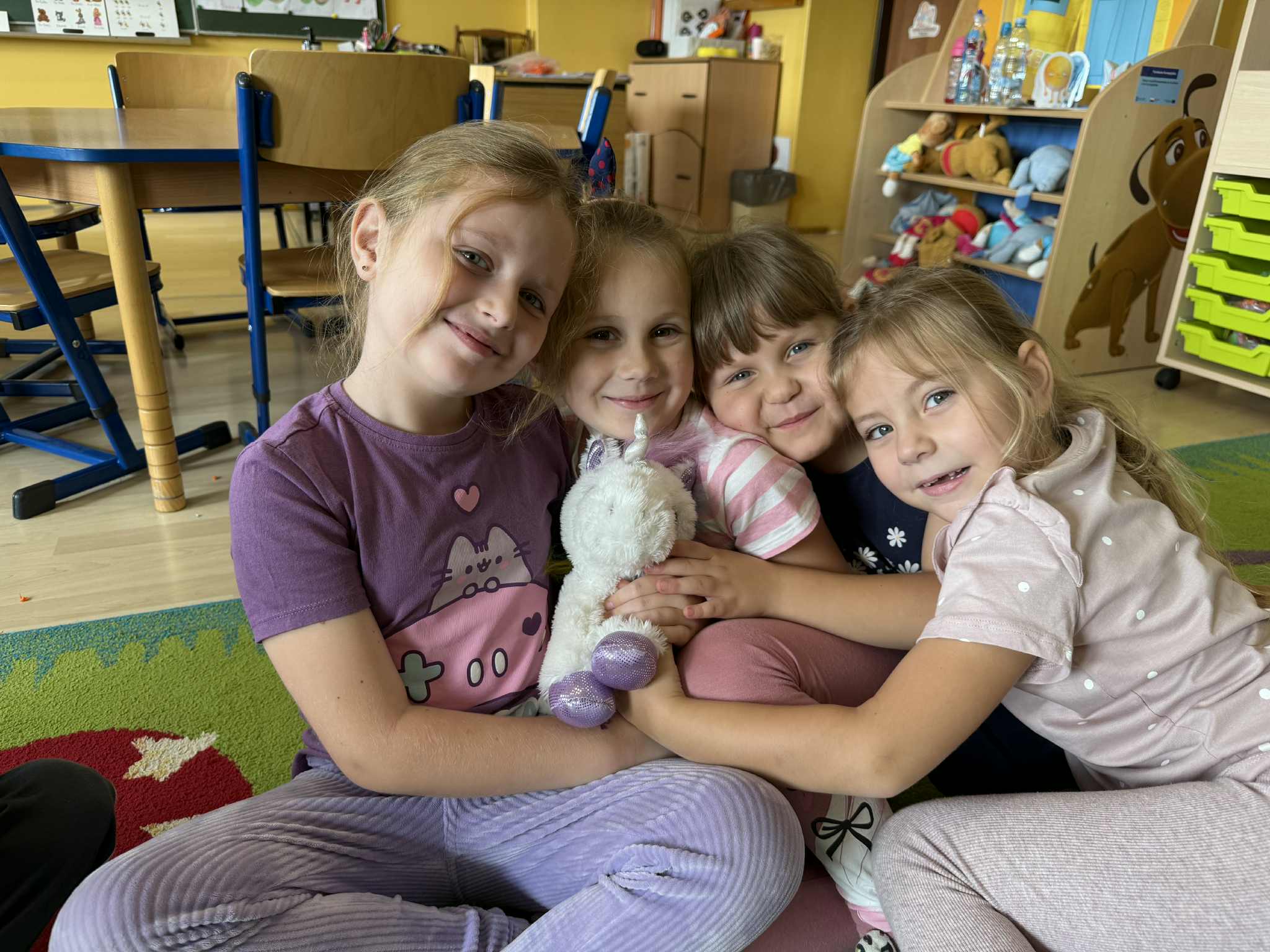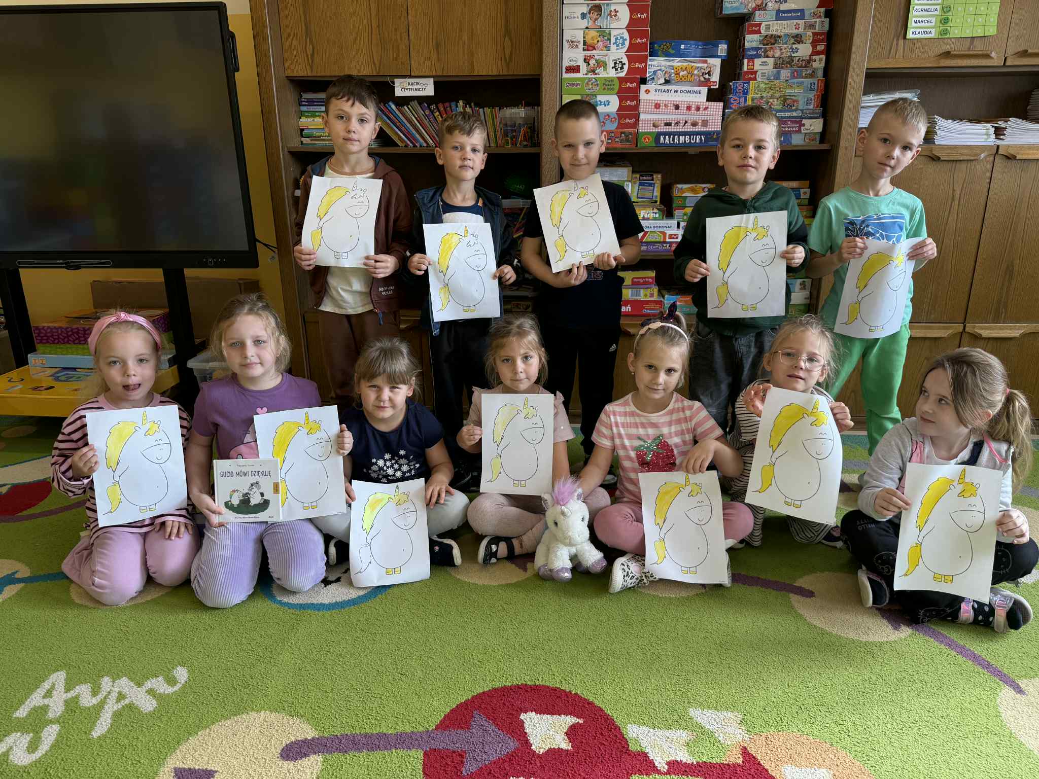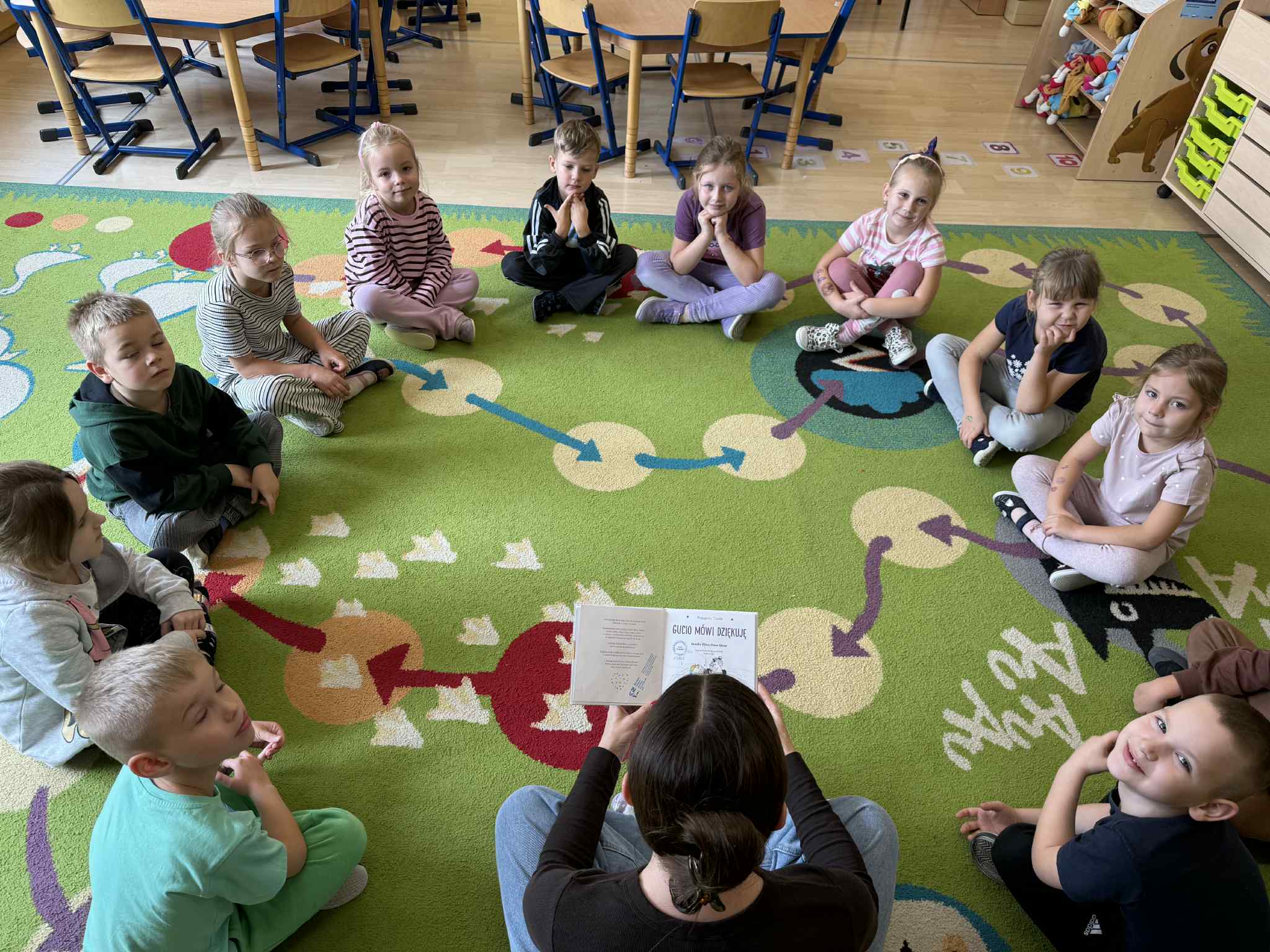 W roku szkolnym 2025/2026 grupa Pszczółki bierze udział w Międzynarodowym Projekcie Edukacyjnym "Kolorowe uczucia Gucia". Głównym założeniem projektu jest wspieranie rozwoju emocjonalnego dzieci, kształtowanie umiejętności rozpoznawania, nazywania i okazywania własnych emocji, dostrzegania ich u innych, a także budowania relacji opartych na wzajemnym szacunku i zrozumieniu. W realizacji tych zadań dzieciom towarzyszy Gucio - sympatyczny jednorożec, który jest głównym bohaterem książeczek. Dzieci chętnie przywitały się z Guciem i z zainteresowaniem wysłuchały opowiadania - „Gucio mówi dziękuję”. Po wysłuchaniu bajki omawiały emocje bohatera, rozwijając umiejętność rozpoznawania i nazywania uczuć, a także wykonały pracę plastyczną.
