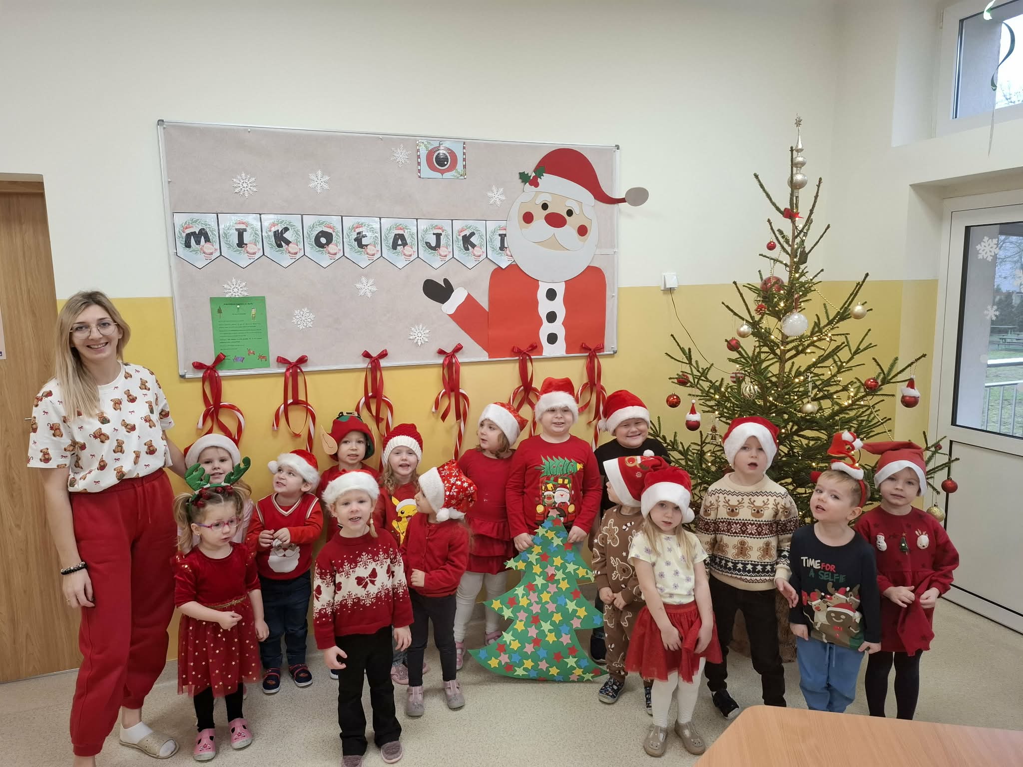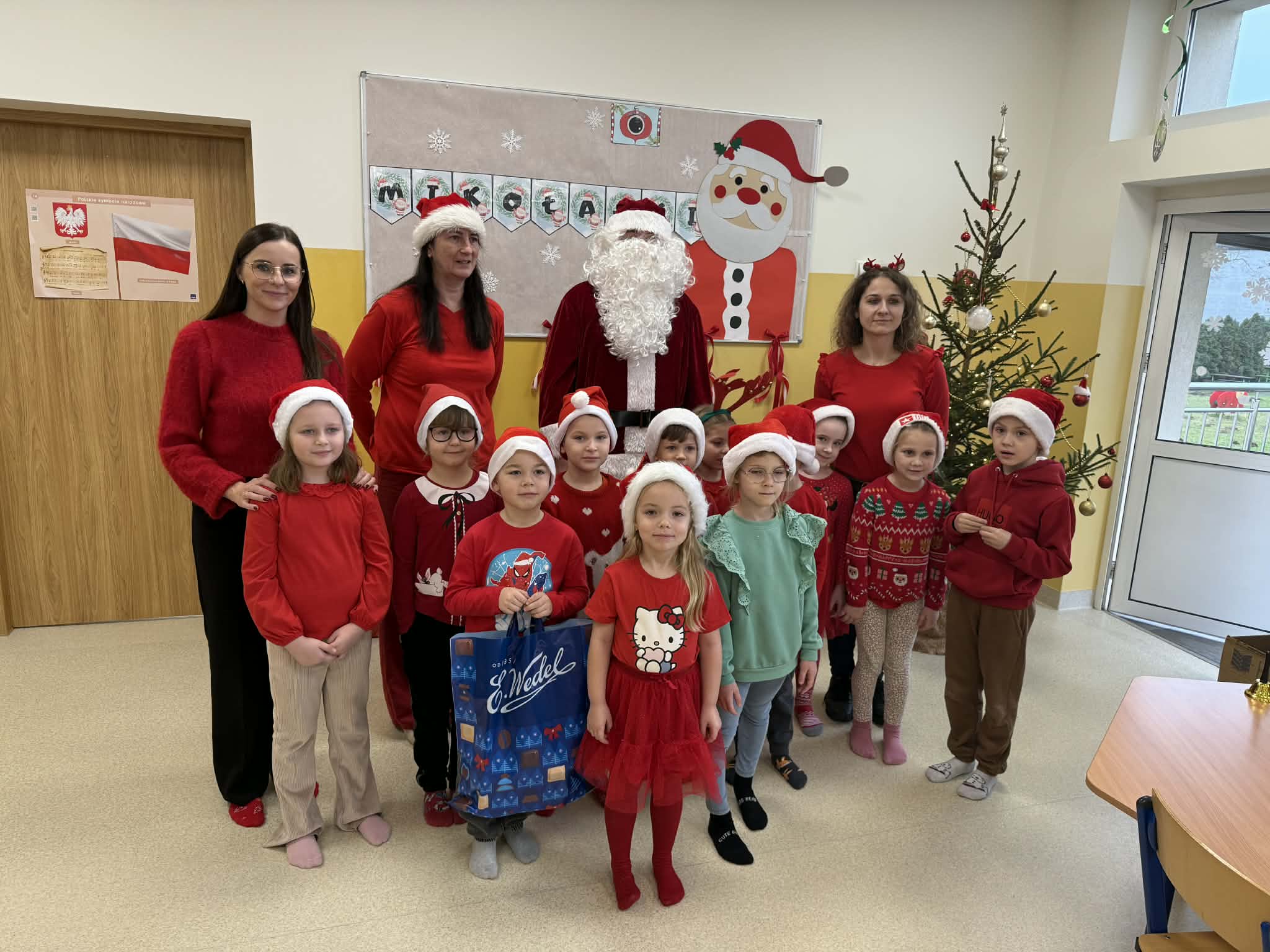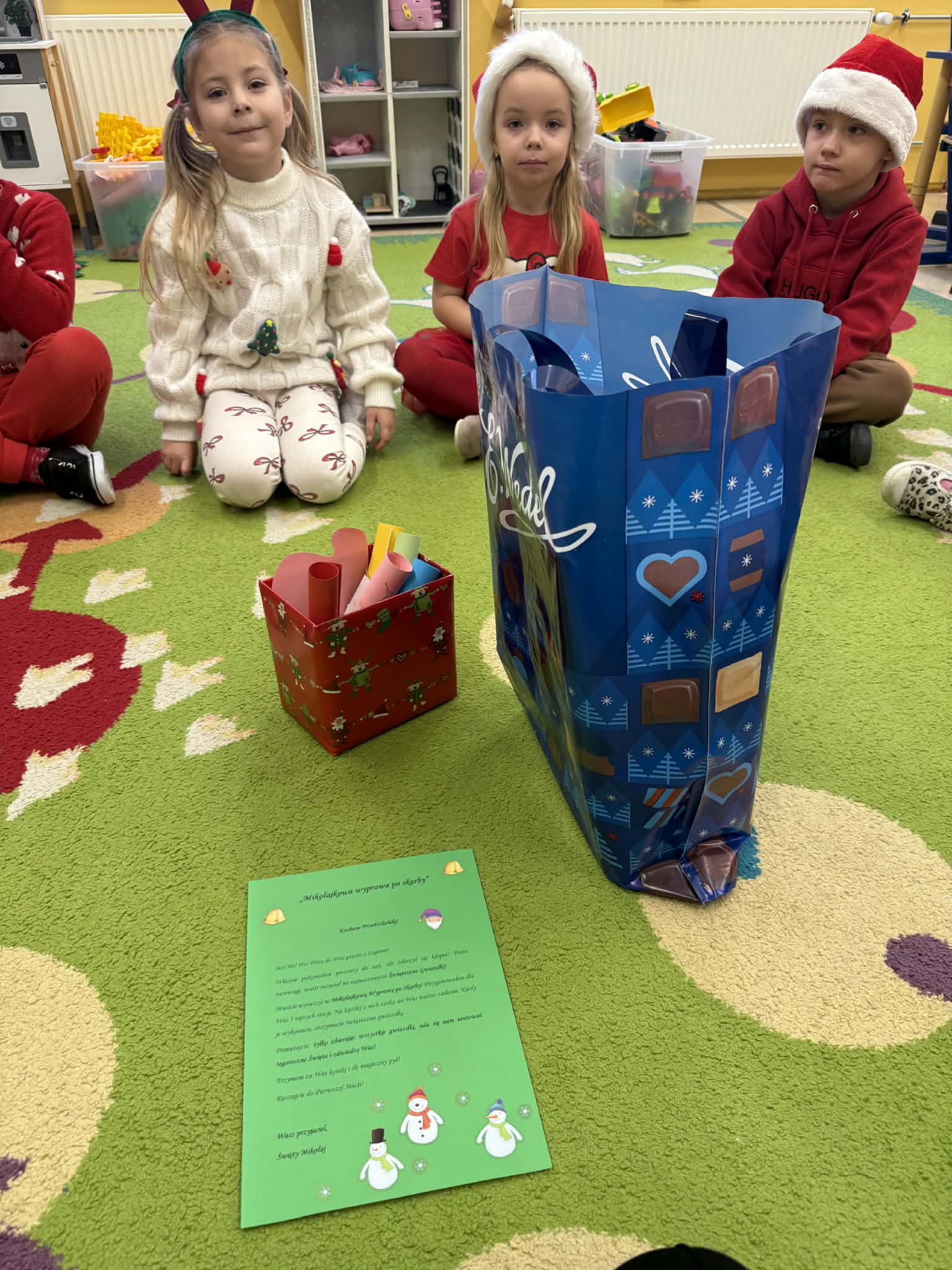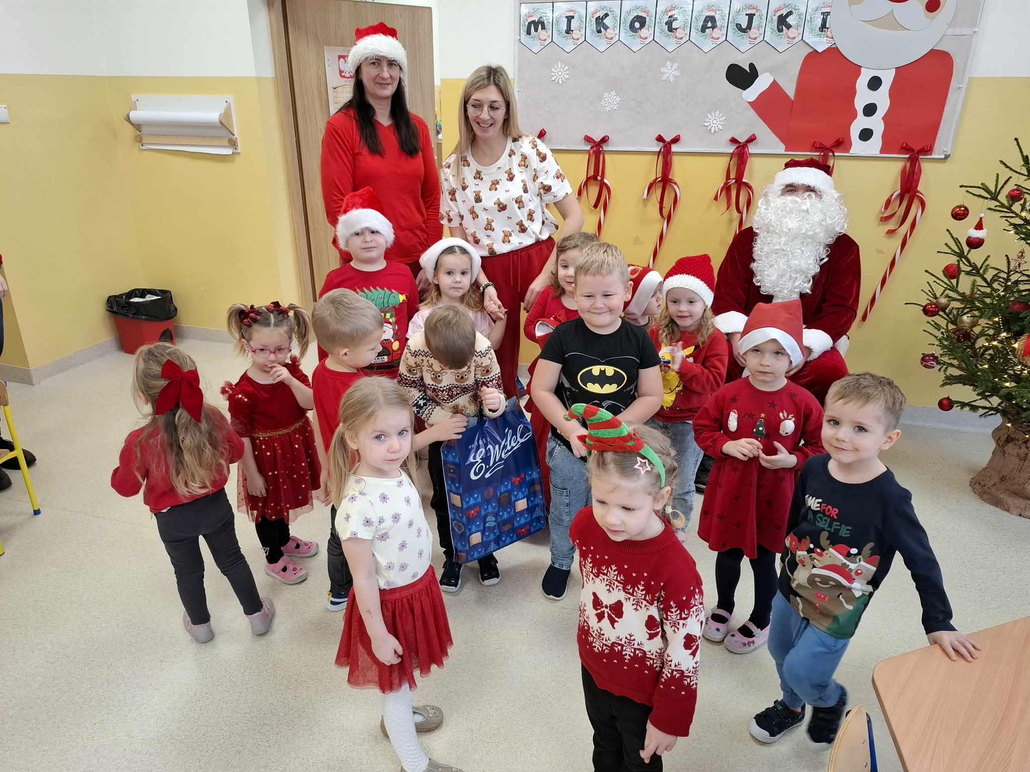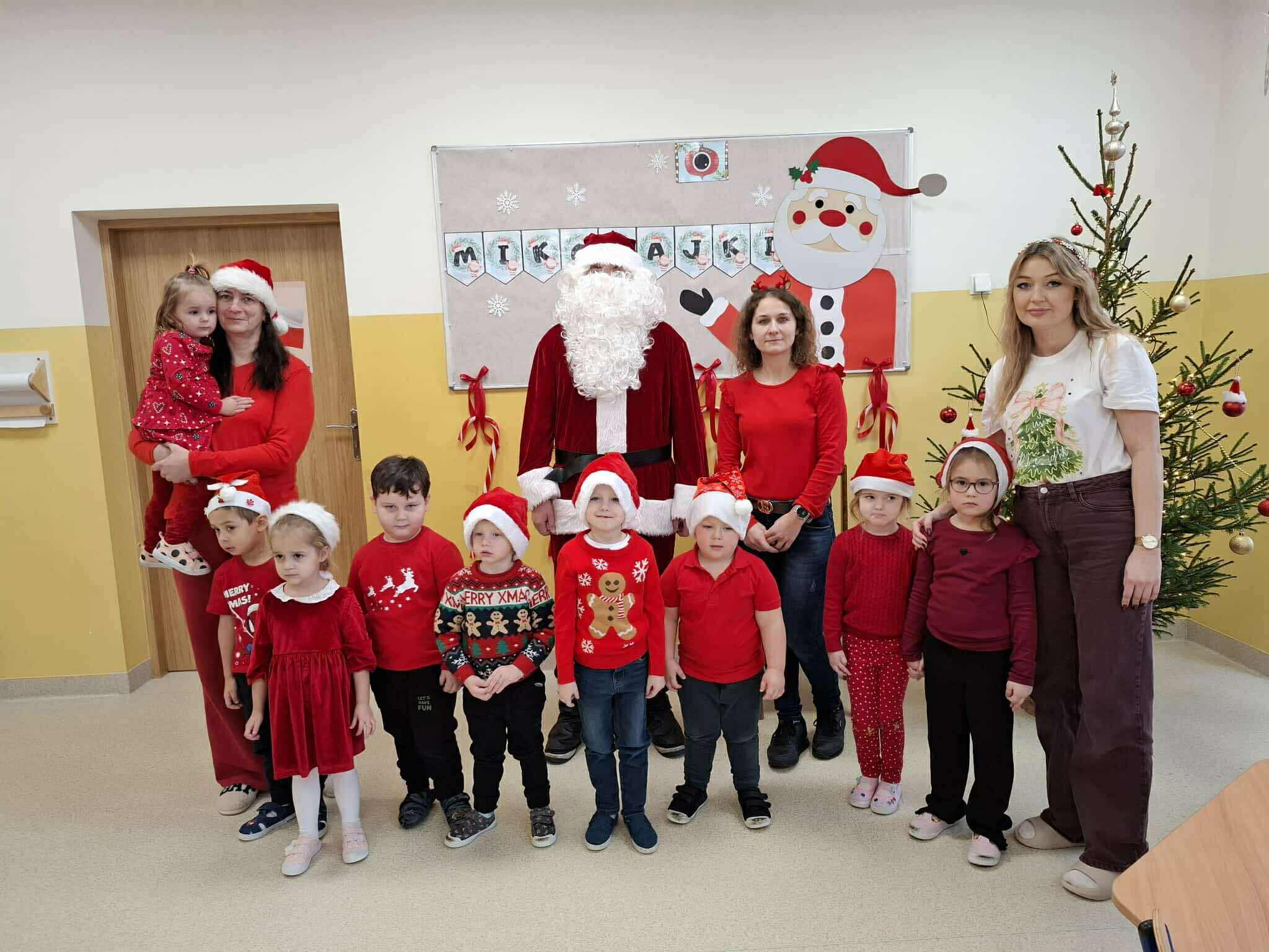 Tegoroczne Mikołajki były dla dzieci niezwykle ekscytujące. Choć zaplanowana gra terenowa odbyła się wyjątkowo w salach, zyskała nową, magiczną formę — nazwaliśmy ją „Mikołajkową Wyprawą po Skarby”. Okazało się, że sam Mikołaj zostawił w każdej sali specjalne zadania do wykonania. Dzieci z ogromnym zapałem podejmowały kolejne wyzwania: wykonywały zadania ruchowe, tworzyły pracę plastyczną dla Mikołaja, a także rozwiązywały świąteczne zagadki, które prowadziły je krok po kroku do kolejnych wskazówek. Po wykonaniu wszystkich zadań nadszedł najbardziej oczekiwany moment — spotkanie z Mikołajem. Dzieci z błyszczącymi oczami przywitały wyjątkowego gościa, a Mikołaj z radością wręczył każdej grupie świąteczny prezent. To był dzień pełen uśmiechów, niespodzianek i prawdziwej, mikołajkowej magii. ![]()