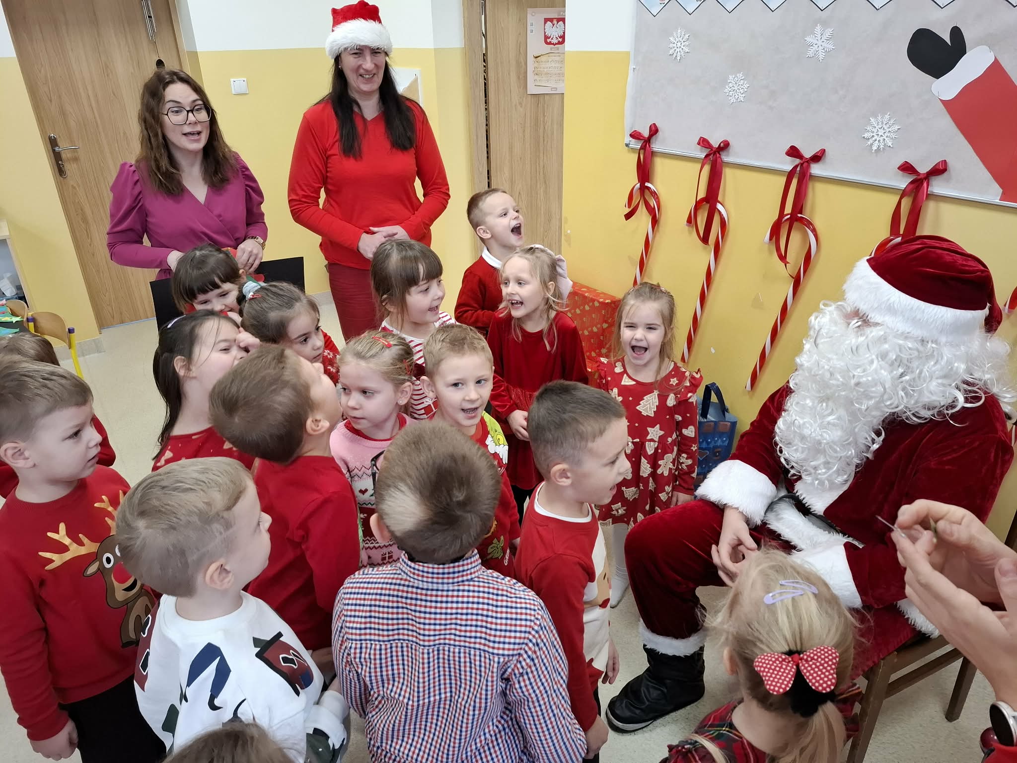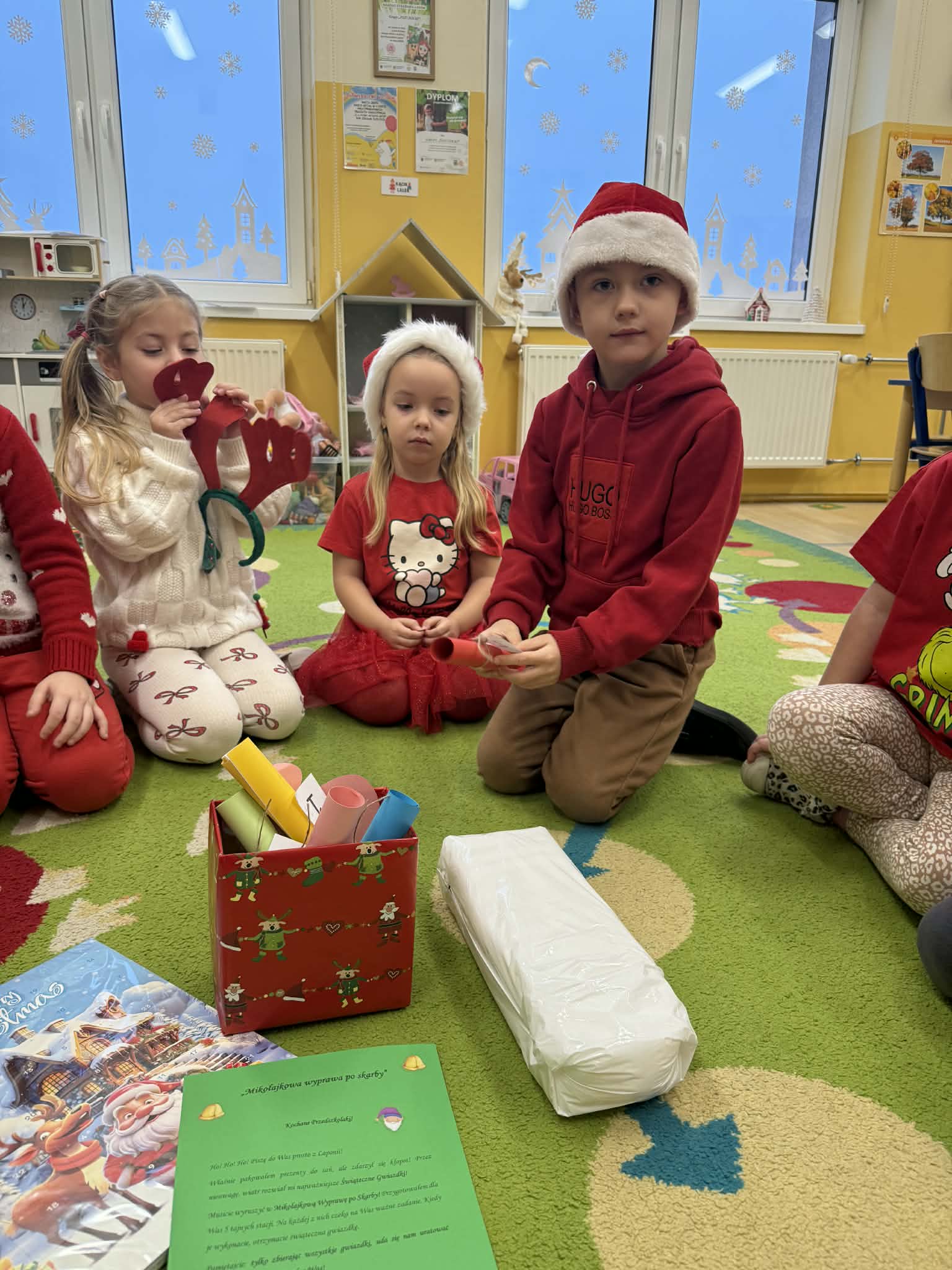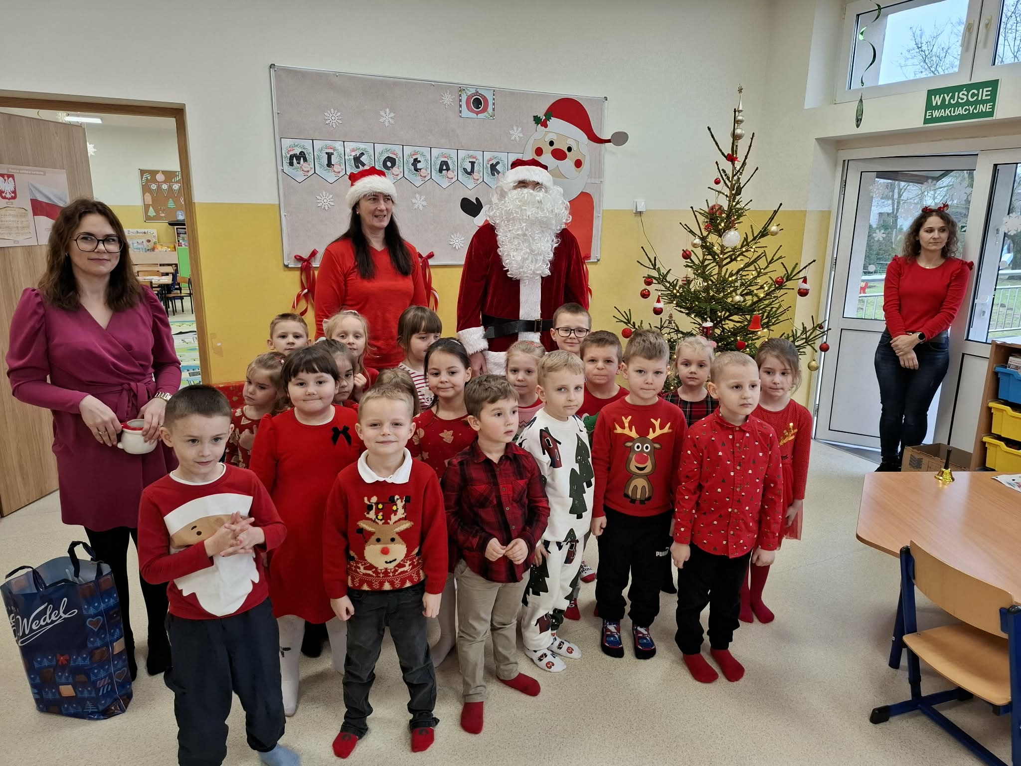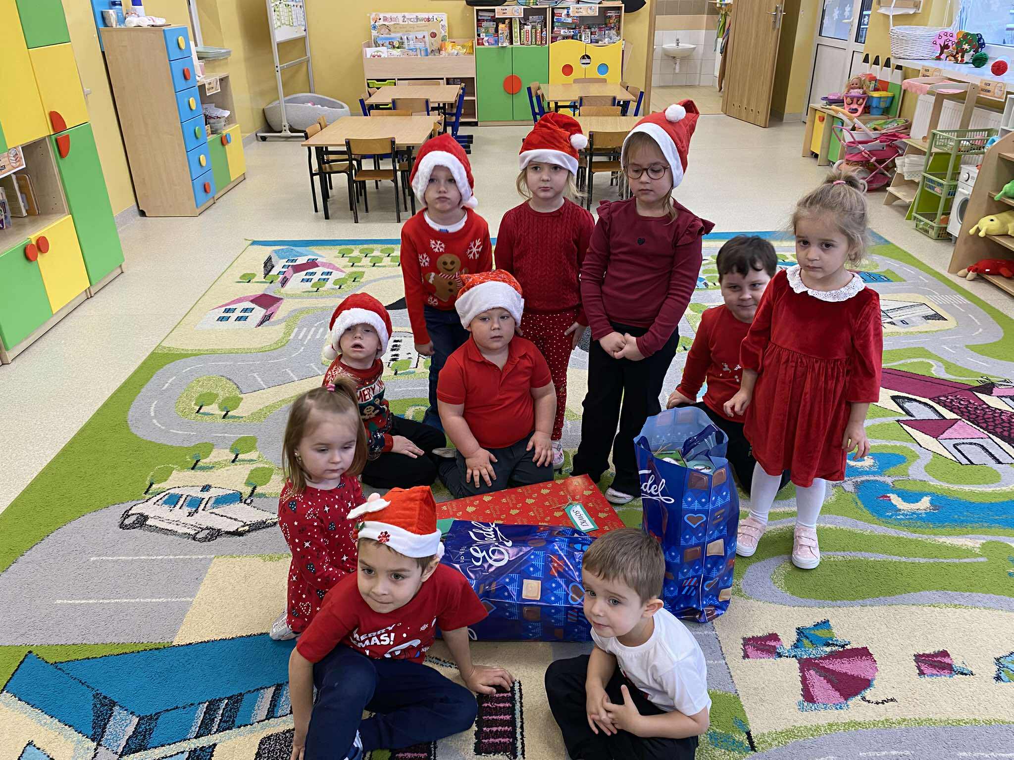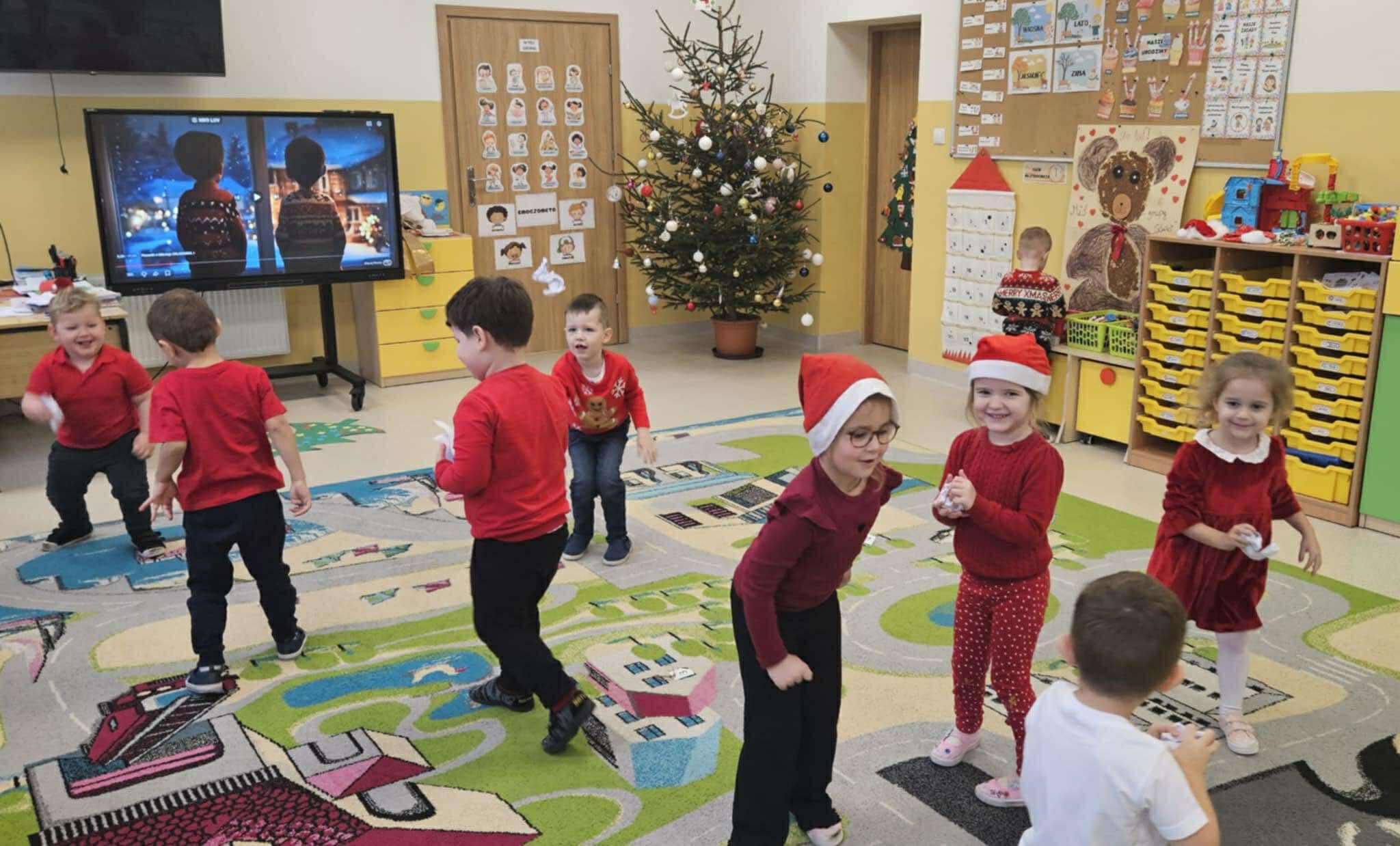 Tegoroczne Mikołajki były dla dzieci niezwykle ekscytujące. Choć zaplanowana gra terenowa odbyła się wyjątkowo w salach, zyskała nową, magiczną formę — nazwaliśmy ją „Mikołajkową Wyprawą po Skarby”. Okazało się, że sam Mikołaj zostawił w każdej sali specjalne zadania do wykonania. Dzieci z ogromnym zapałem podejmowały kolejne wyzwania: wykonywały zadania ruchowe, tworzyły pracę plastyczną dla Mikołaja, a także rozwiązywały świąteczne zagadki, które prowadziły je krok po kroku do kolejnych wskazówek. Po wykonaniu wszystkich zadań nadszedł najbardziej oczekiwany moment — spotkanie z Mikołajem. Dzieci z błyszczącymi oczami przywitały wyjątkowego gościa, a Mikołaj z radością wręczył każdej grupie świąteczny prezent. To był dzień pełen uśmiechów, niespodzianek i prawdziwej, mikołajkowej magii. ![]()