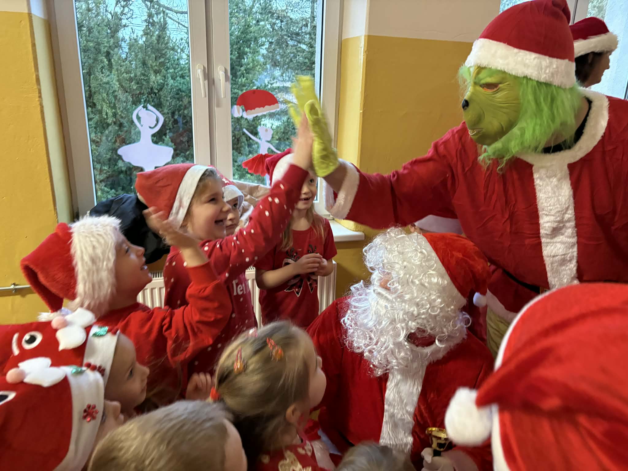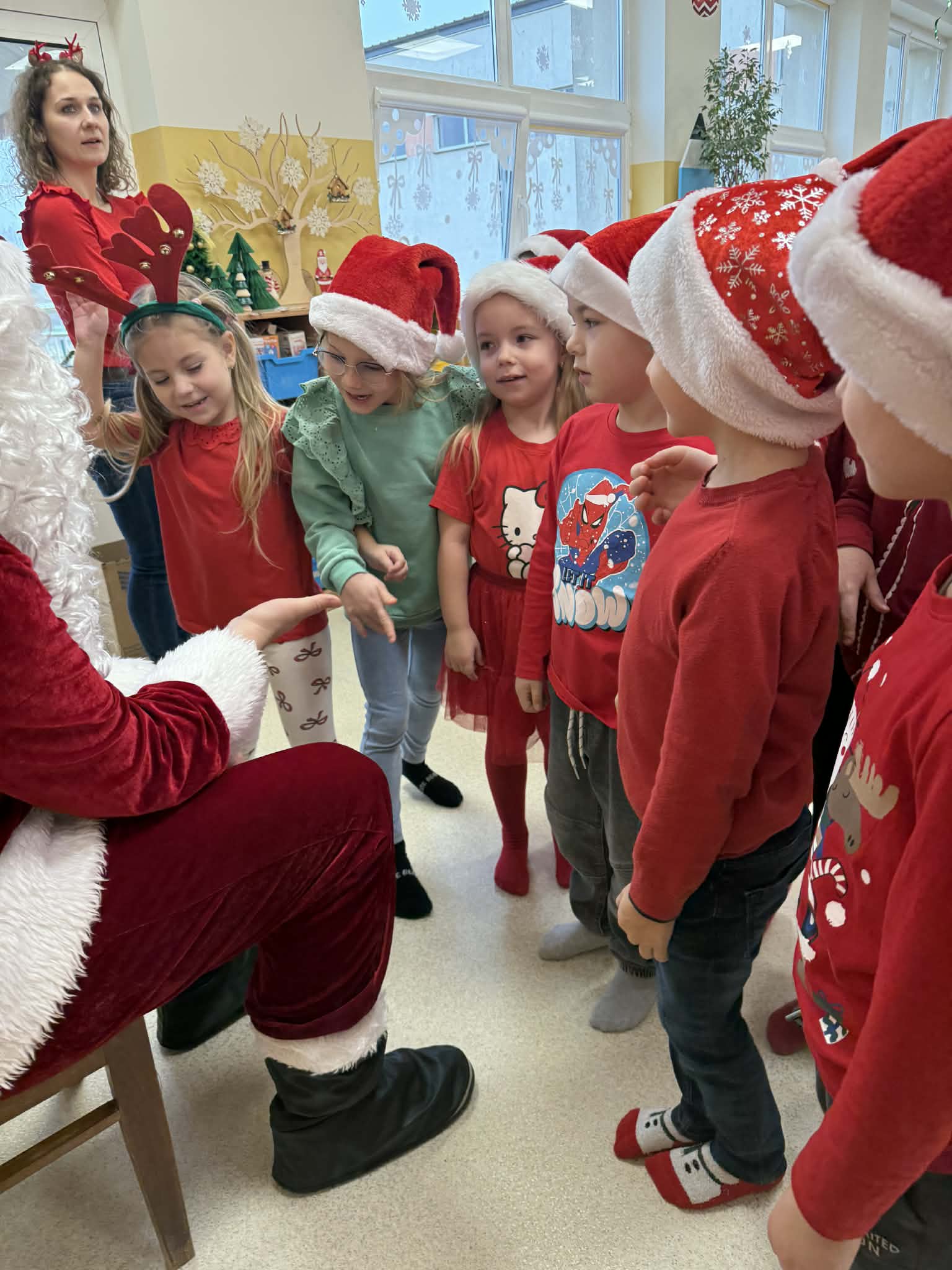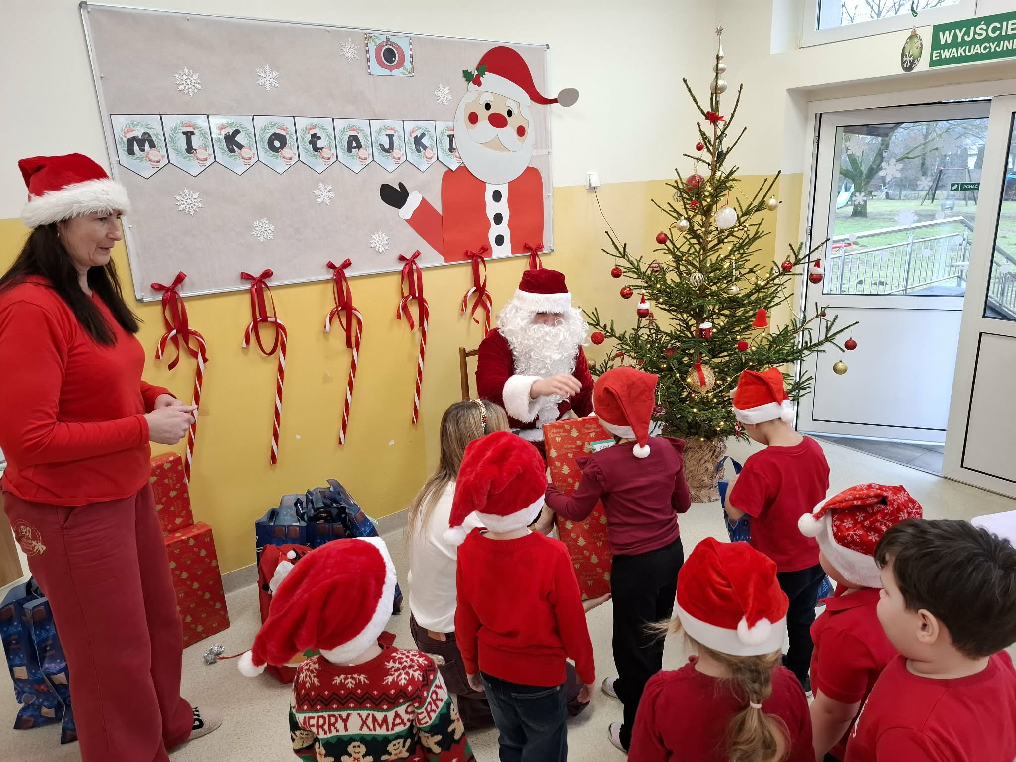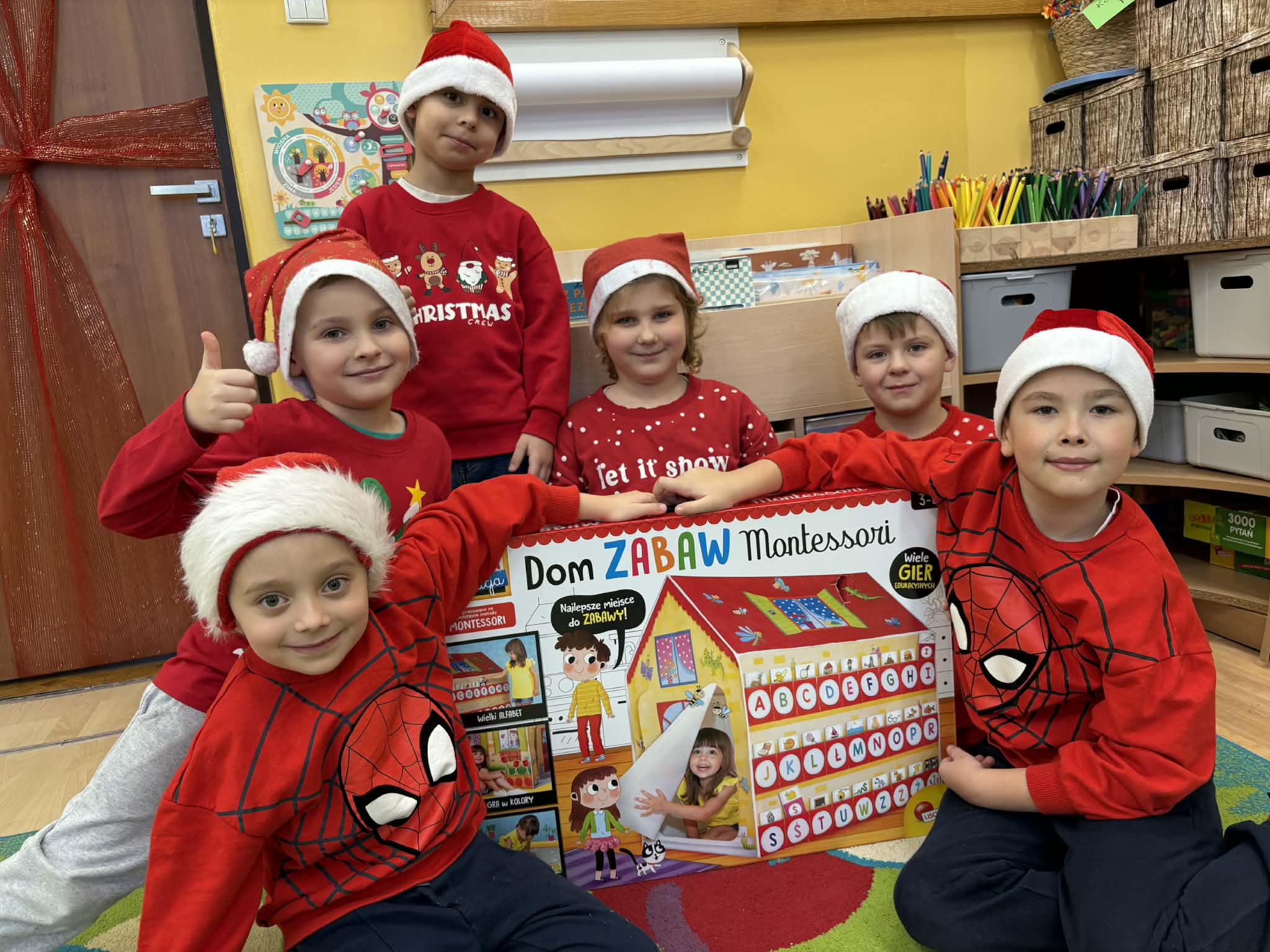Tegoroczne Mikołajki były dla dzieci niezwykle ekscytujące. Choć zaplanowana gra terenowa odbyła się wyjątkowo w salach, zyskała nową, magiczną formę — nazwaliśmy ją „Mikołajkową Wyprawą po Skarby”. Okazało się, że sam Mikołaj zostawił w każdej sali specjalne zadania do wykonania. Dzieci z ogromnym zapałem podejmowały kolejne wyzwania: wykonywały zadania ruchowe, tworzyły pracę plastyczną dla Mikołaja, a także rozwiązywały świąteczne zagadki, które prowadziły je krok po kroku do kolejnych wskazówek. Po wykonaniu wszystkich zadań nadszedł najbardziej oczekiwany moment — spotkanie z Mikołajem. Dzieci z błyszczącymi oczami przywitały wyjątkowego gościa, a Mikołaj z radością wręczył każdej grupie świąteczny prezent. To był dzień pełen uśmiechów, niespodzianek i prawdziwej, mikołajkowej magii. ![]()