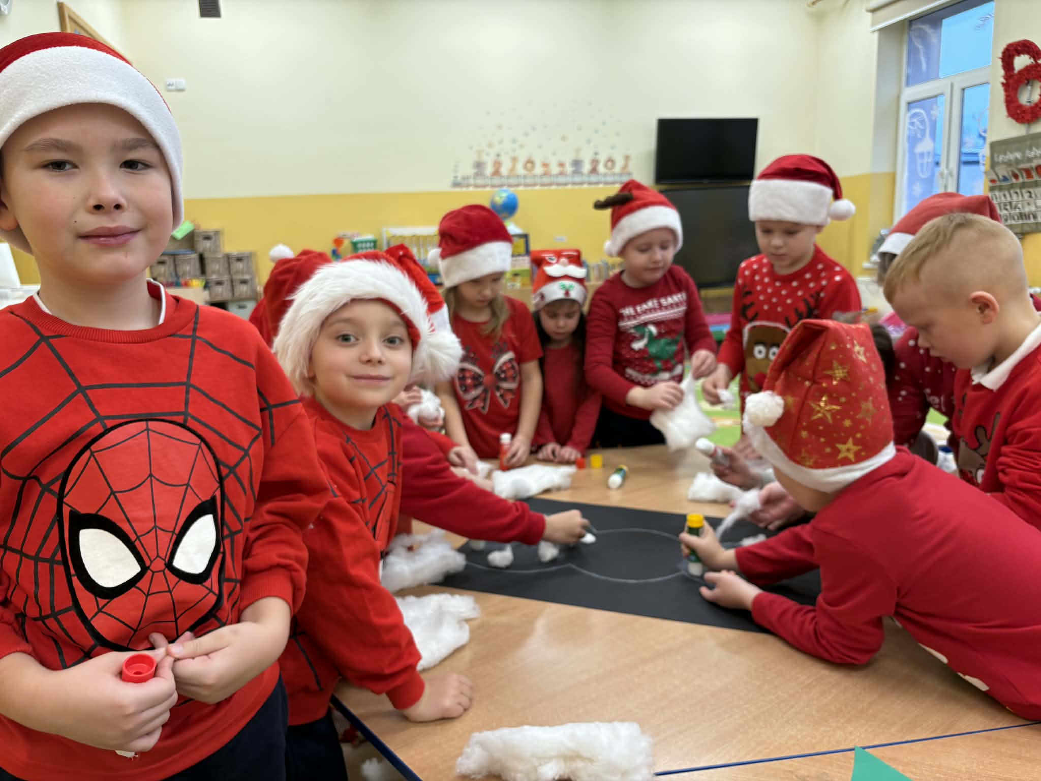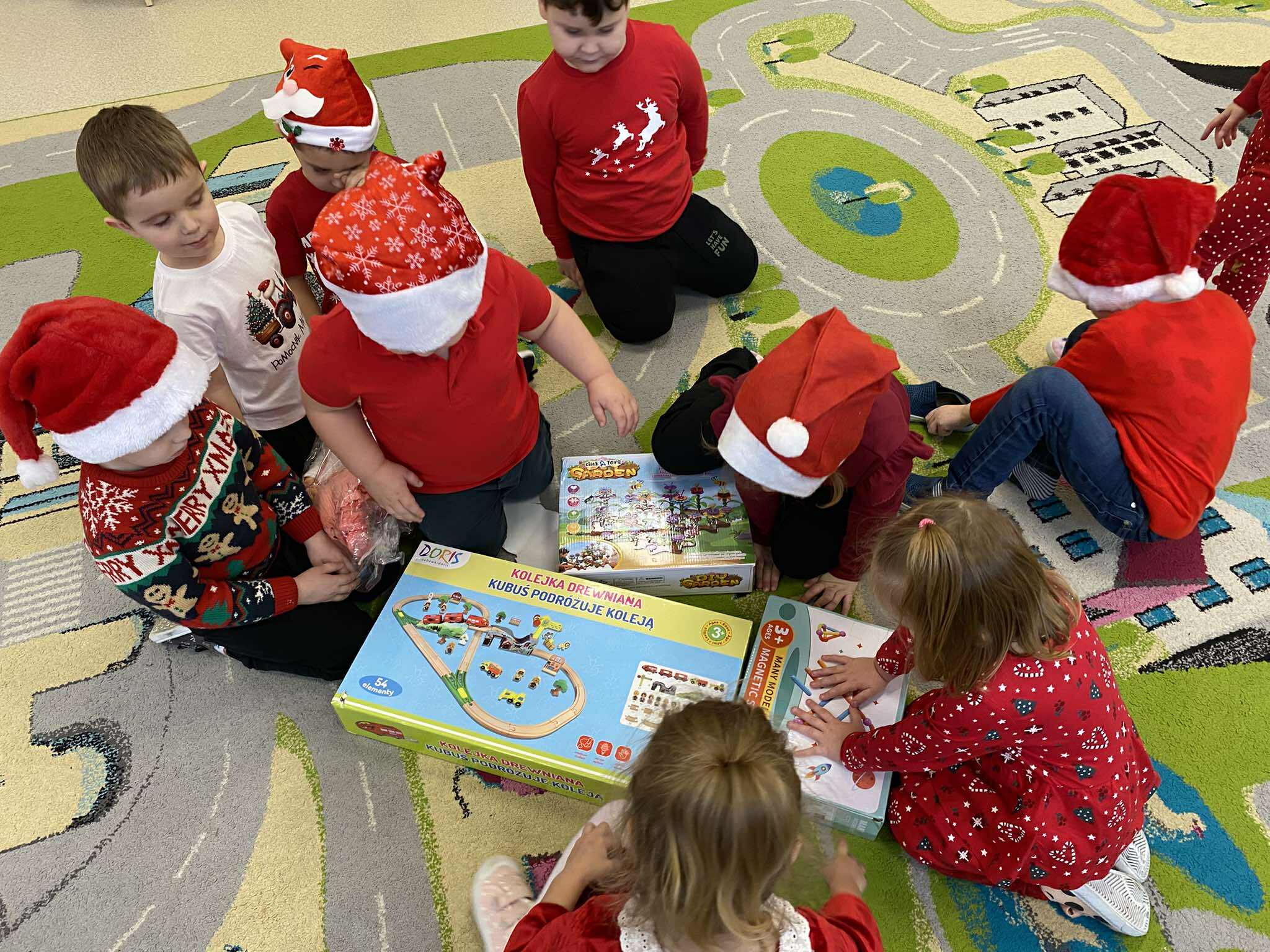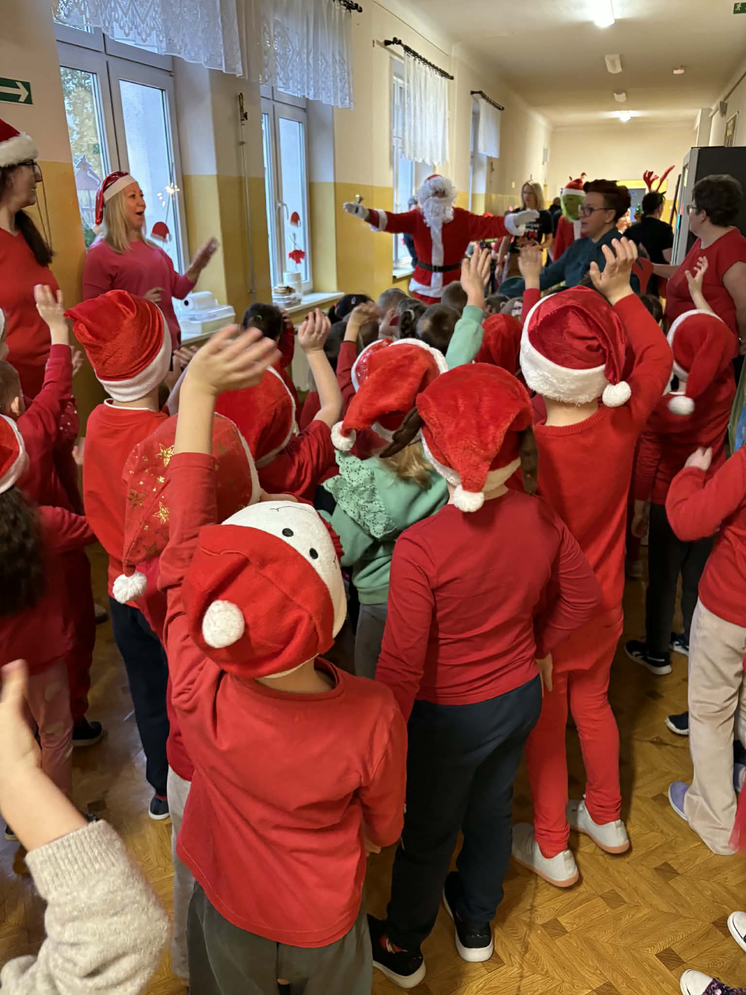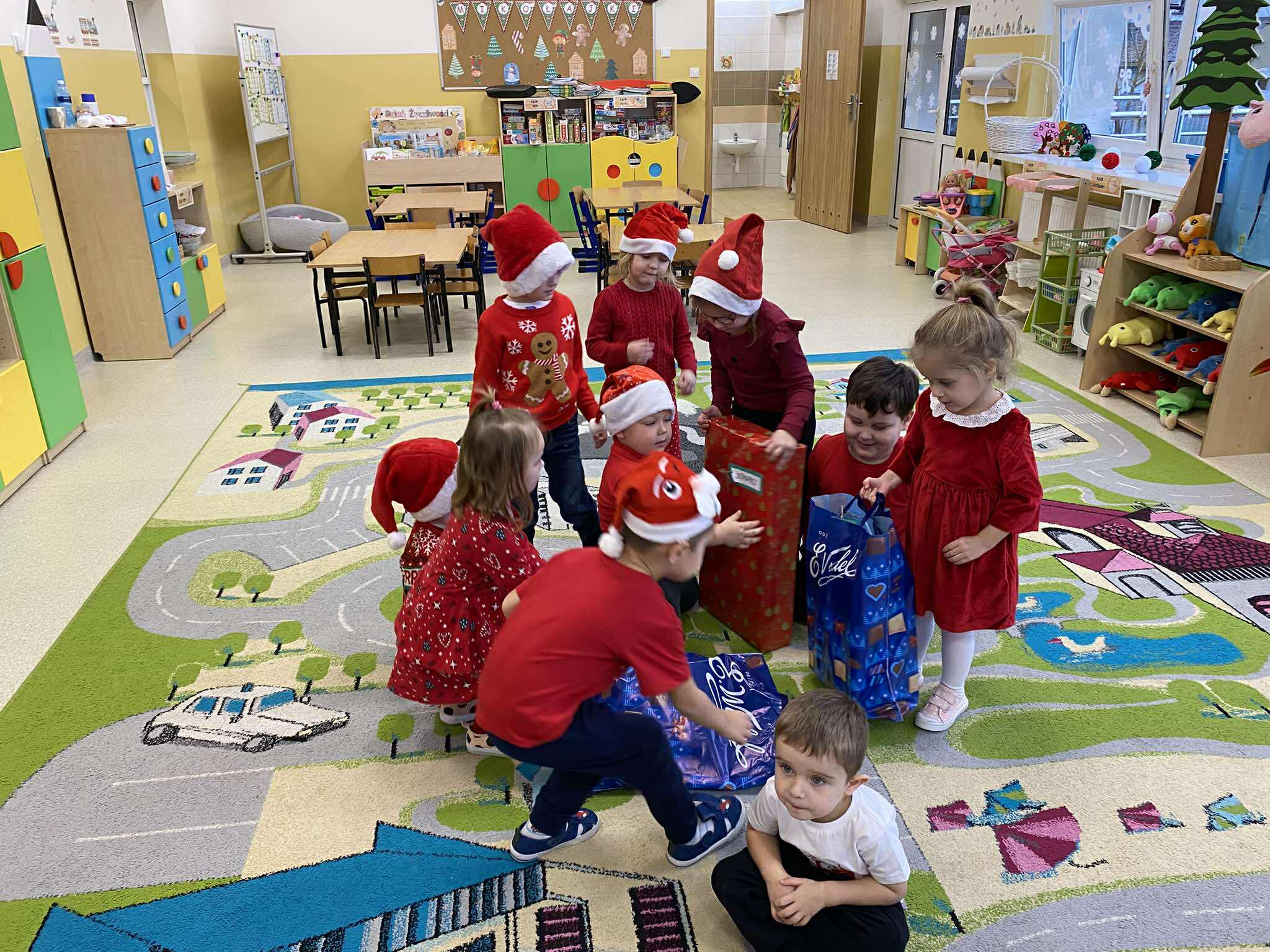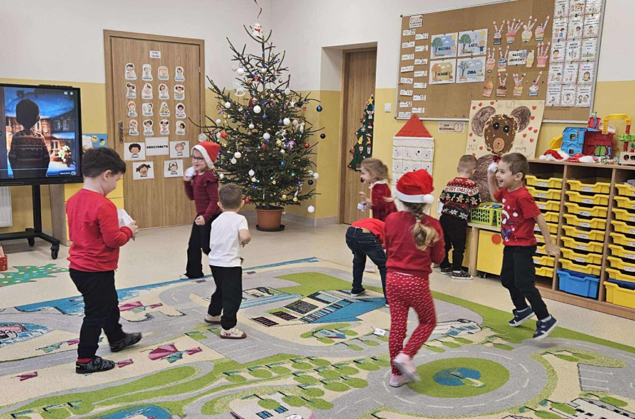 Tegoroczne Mikołajki były dla dzieci niezwykle ekscytujące. Choć zaplanowana gra terenowa odbyła się wyjątkowo w salach, zyskała nową, magiczną formę — nazwaliśmy ją „Mikołajkową Wyprawą po Skarby”. Okazało się, że sam Mikołaj zostawił w każdej sali specjalne zadania do wykonania. Dzieci z ogromnym zapałem podejmowały kolejne wyzwania: wykonywały zadania ruchowe, tworzyły pracę plastyczną dla Mikołaja, a także rozwiązywały świąteczne zagadki, które prowadziły je krok po kroku do kolejnych wskazówek. Po wykonaniu wszystkich zadań nadszedł najbardziej oczekiwany moment — spotkanie z Mikołajem. Dzieci z błyszczącymi oczami przywitały wyjątkowego gościa, a Mikołaj z radością wręczył każdej grupie świąteczny prezent. To był dzień pełen uśmiechów, niespodzianek i prawdziwej, mikołajkowej magii. ![]()