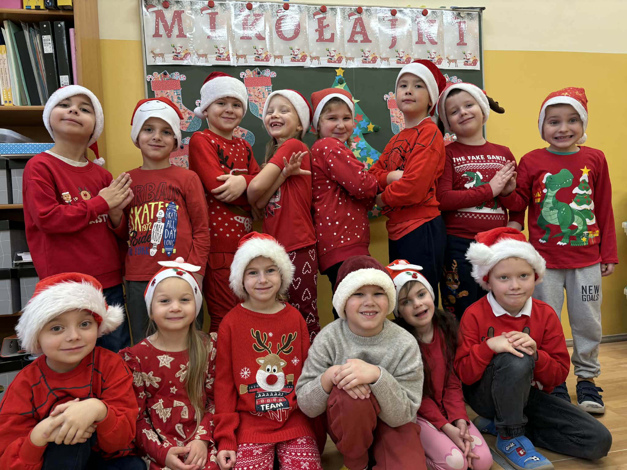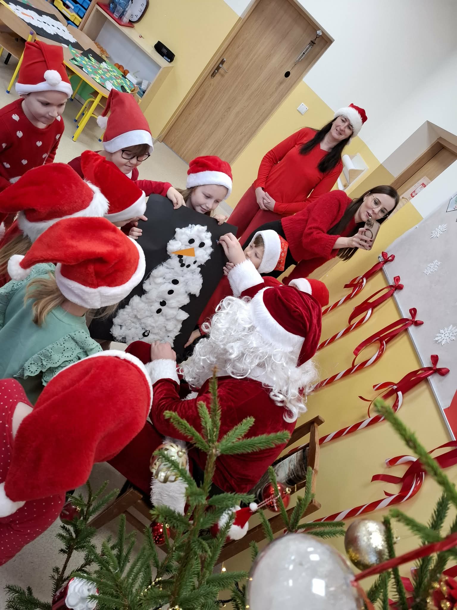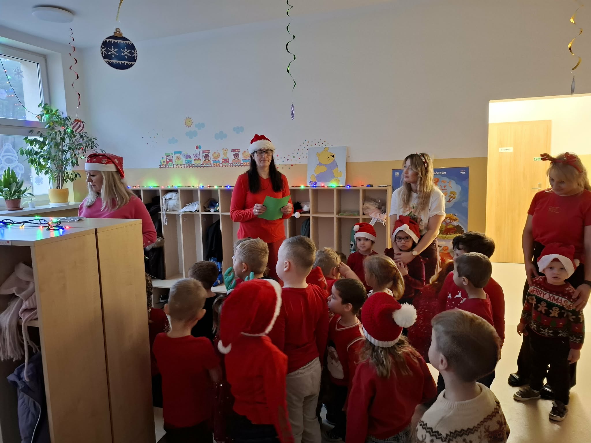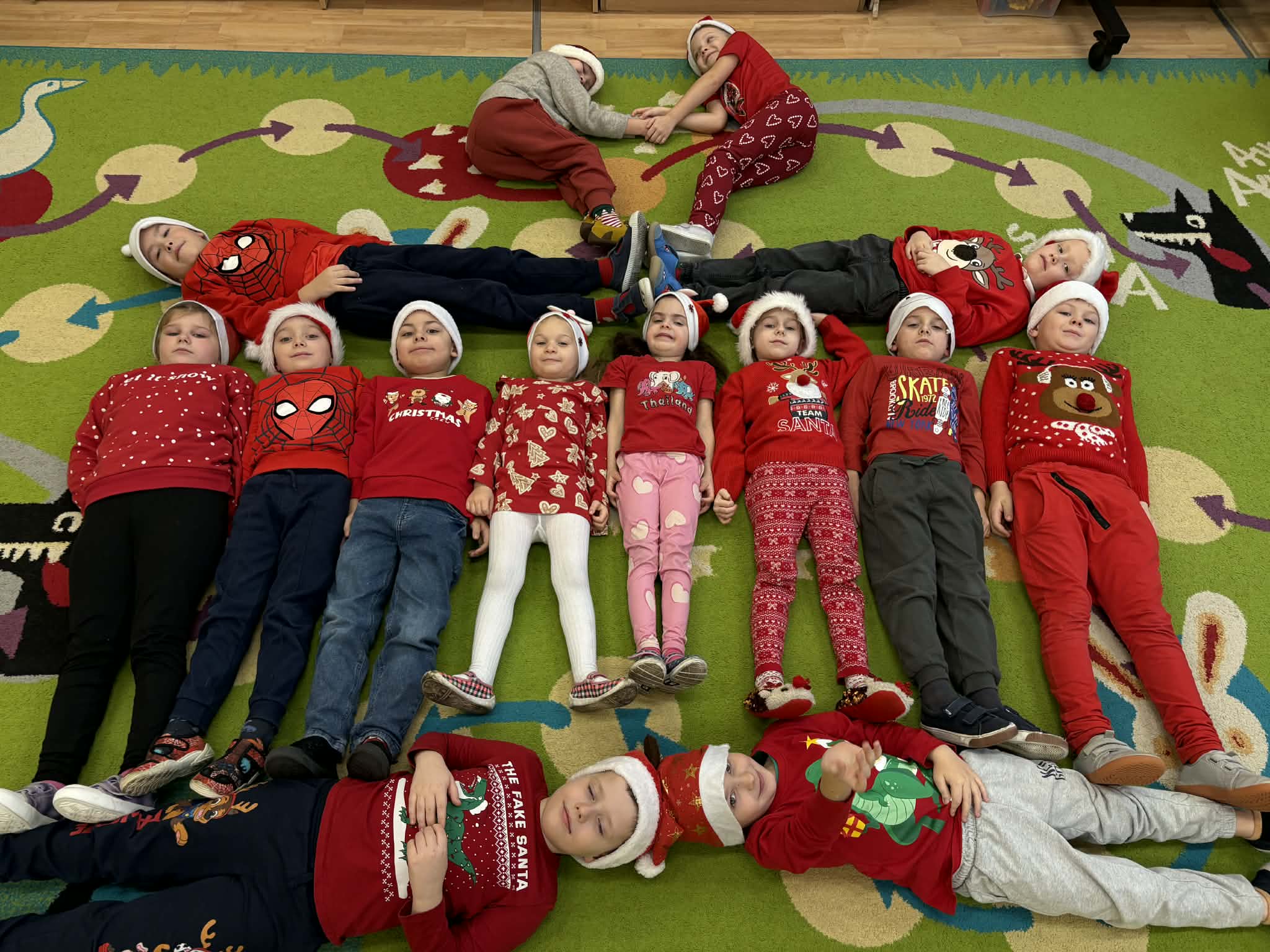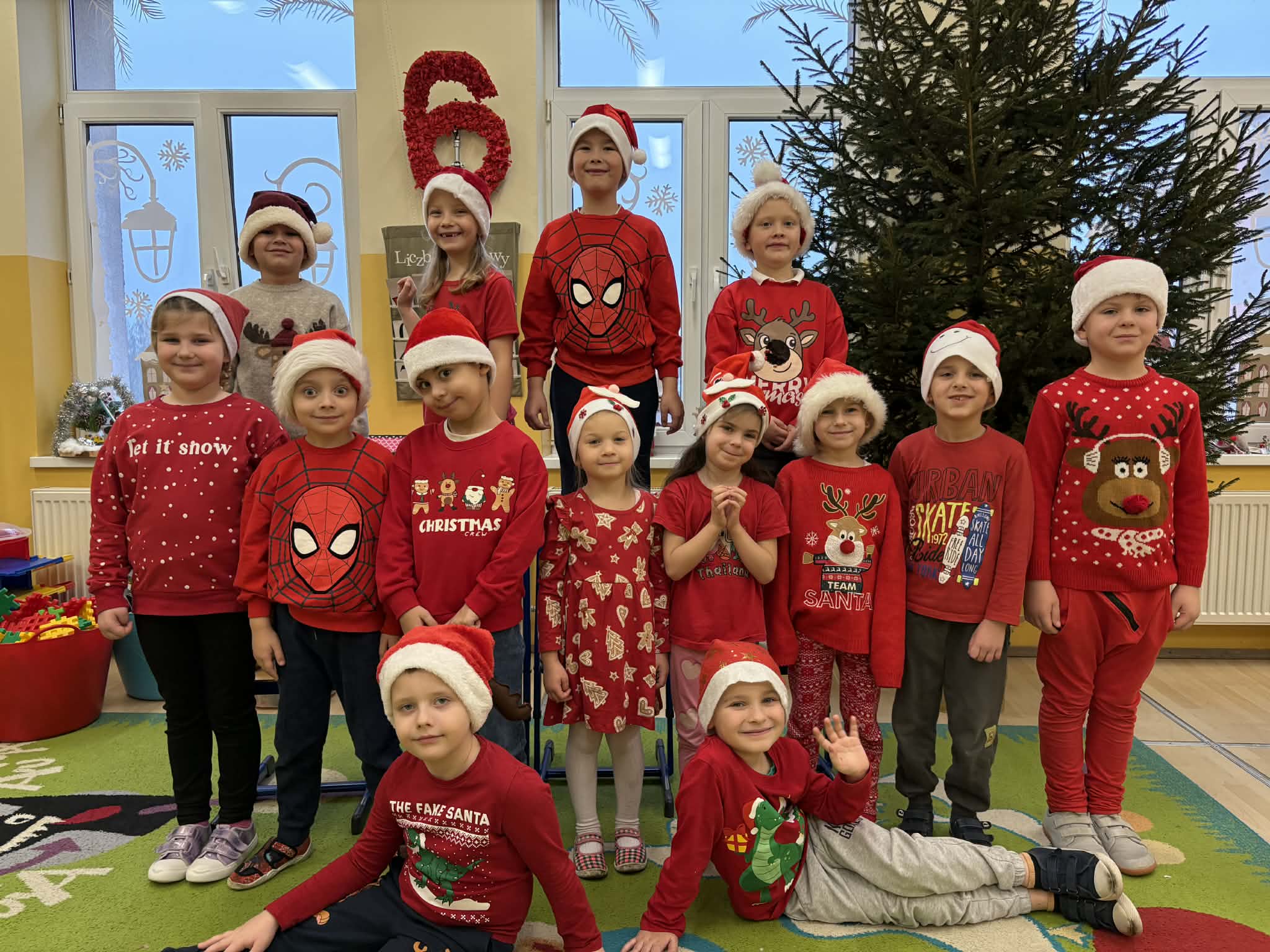 Tegoroczne Mikołajki były dla dzieci niezwykle ekscytujące. Choć zaplanowana gra terenowa odbyła się wyjątkowo w salach, zyskała nową, magiczną formę — nazwaliśmy ją „Mikołajkową Wyprawą po Skarby”. Okazało się, że sam Mikołaj zostawił w każdej sali specjalne zadania do wykonania. Dzieci z ogromnym zapałem podejmowały kolejne wyzwania: wykonywały zadania ruchowe, tworzyły pracę plastyczną dla Mikołaja, a także rozwiązywały świąteczne zagadki, które prowadziły je krok po kroku do kolejnych wskazówek. Po wykonaniu wszystkich zadań nadszedł najbardziej oczekiwany moment — spotkanie z Mikołajem. Dzieci z błyszczącymi oczami przywitały wyjątkowego gościa, a Mikołaj z radością wręczył każdej grupie świąteczny prezent. To był dzień pełen uśmiechów, niespodzianek i prawdziwej, mikołajkowej magii. ![]()
