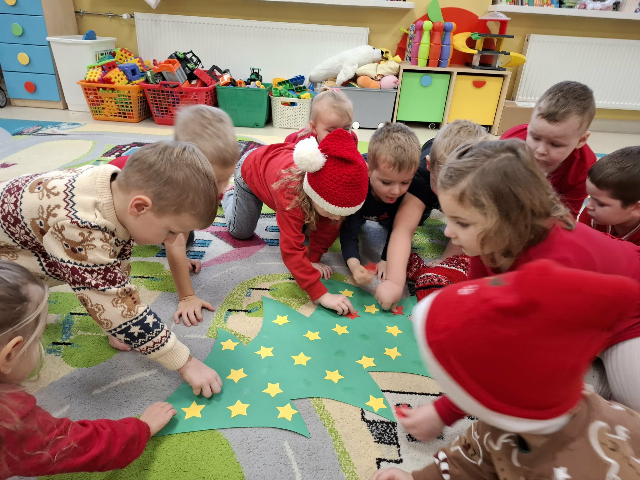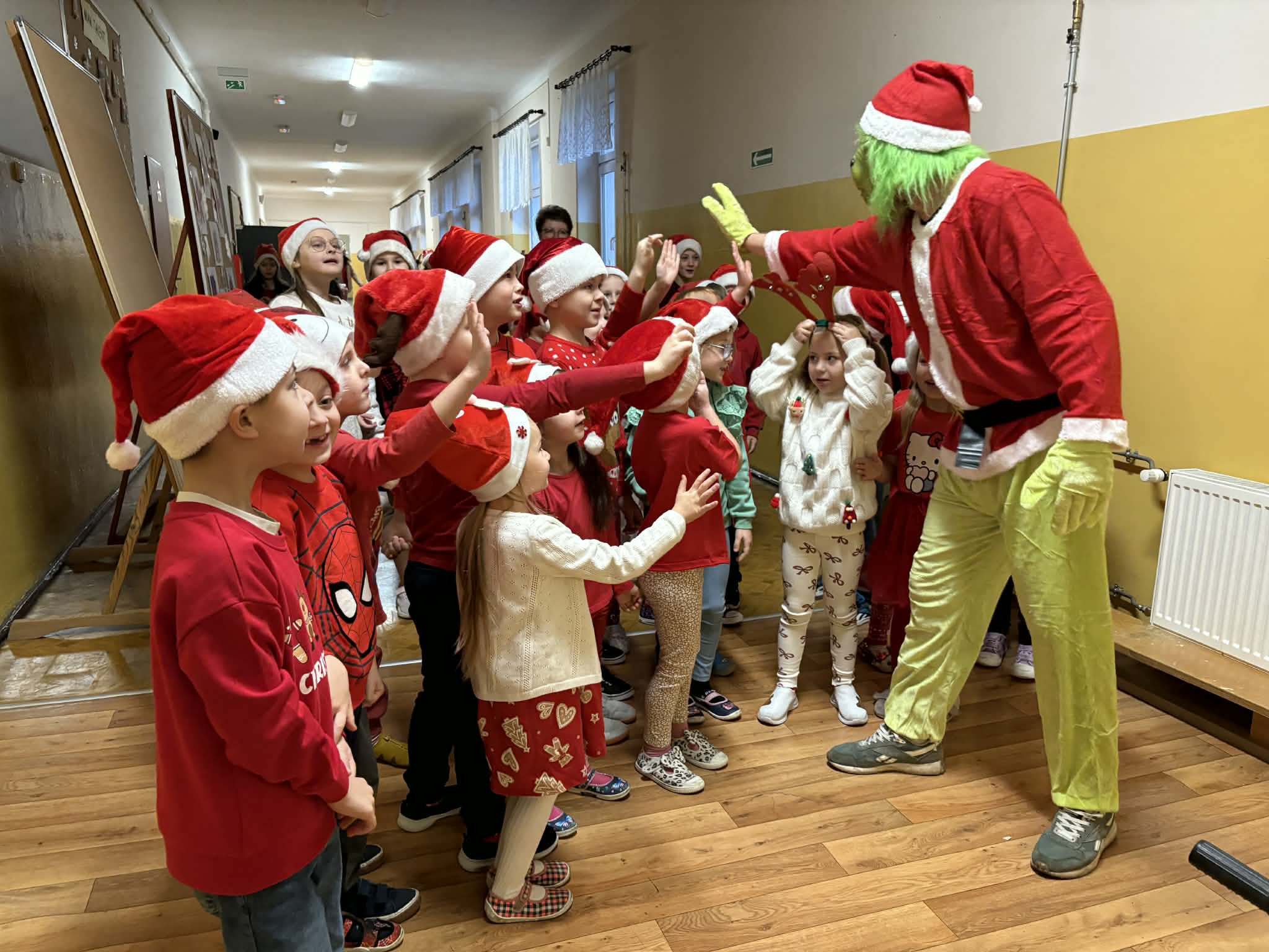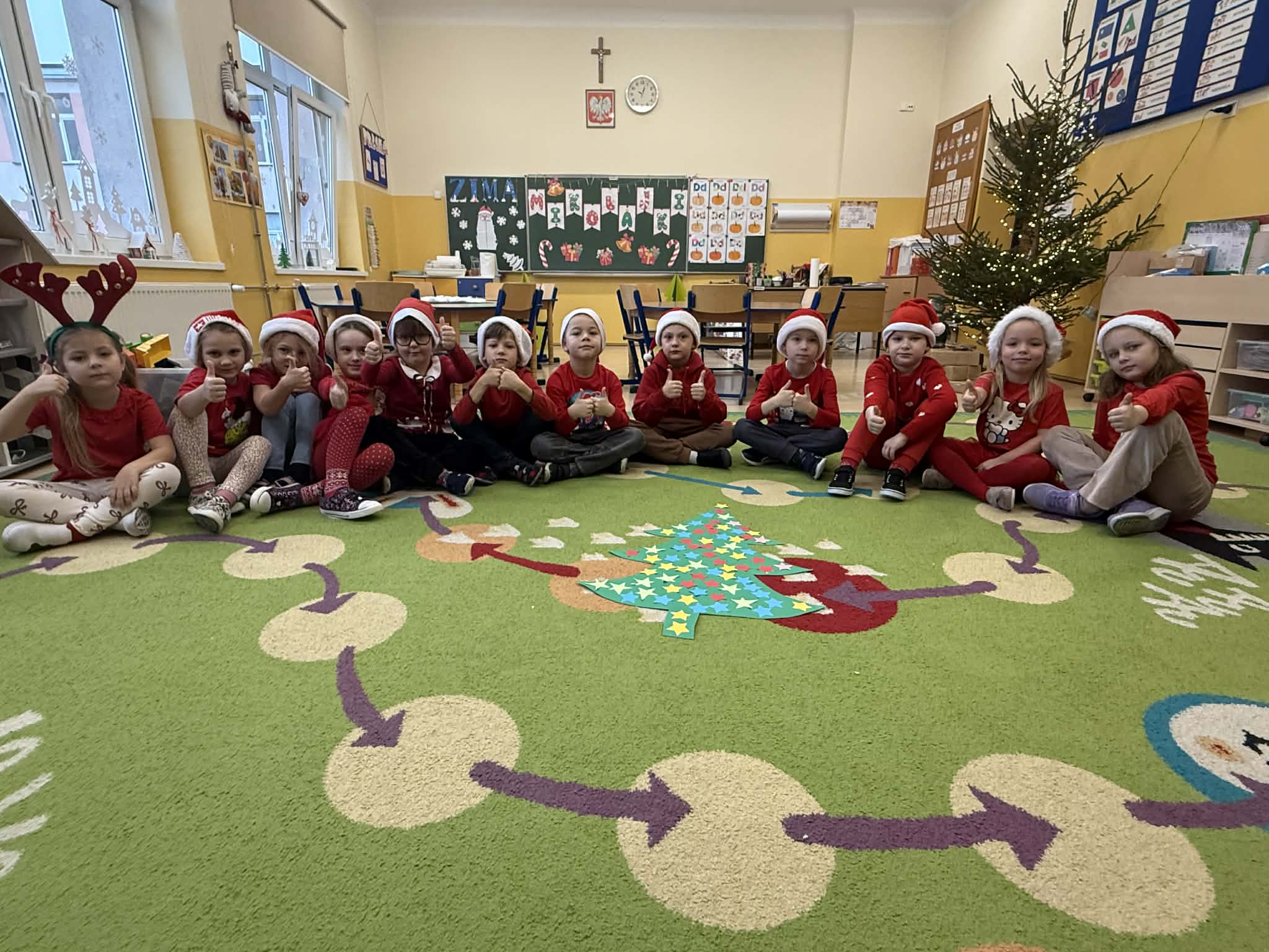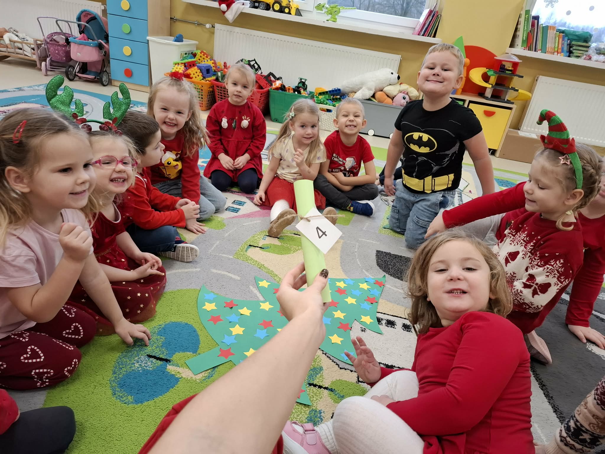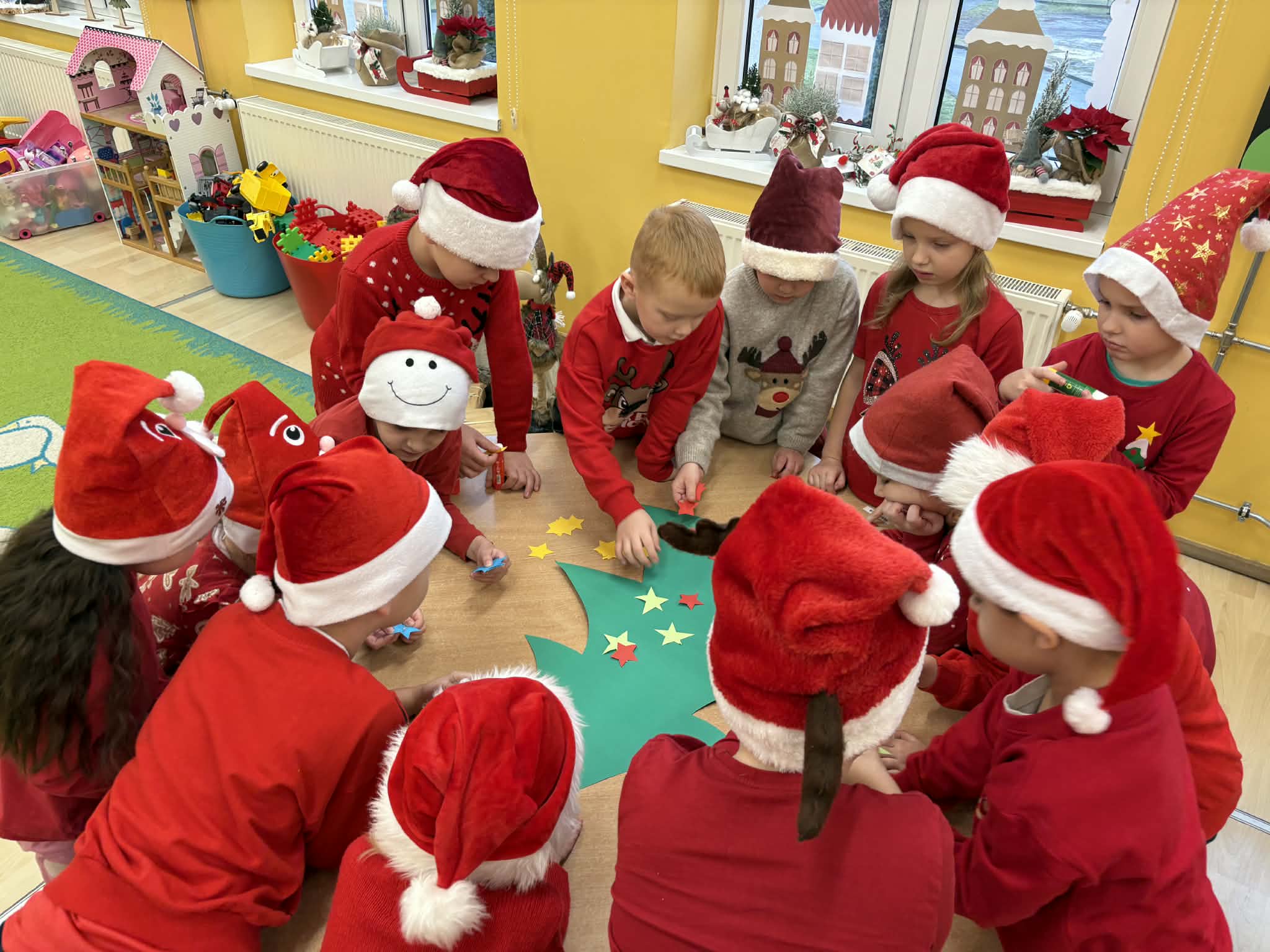 Tegoroczne Mikołajki były dla dzieci niezwykle ekscytujące. Choć zaplanowana gra terenowa odbyła się wyjątkowo w salach, zyskała nową, magiczną formę — nazwaliśmy ją „Mikołajkową Wyprawą po Skarby”. Okazało się, że sam Mikołaj zostawił w każdej sali specjalne zadania do wykonania. Dzieci z ogromnym zapałem podejmowały kolejne wyzwania: wykonywały zadania ruchowe, tworzyły pracę plastyczną dla Mikołaja, a także rozwiązywały świąteczne zagadki, które prowadziły je krok po kroku do kolejnych wskazówek. Po wykonaniu wszystkich zadań nadszedł najbardziej oczekiwany moment — spotkanie z Mikołajem. Dzieci z błyszczącymi oczami przywitały wyjątkowego gościa, a Mikołaj z radością wręczył każdej grupie świąteczny prezent. To był dzień pełen uśmiechów, niespodzianek i prawdziwej, mikołajkowej magii. ![]()