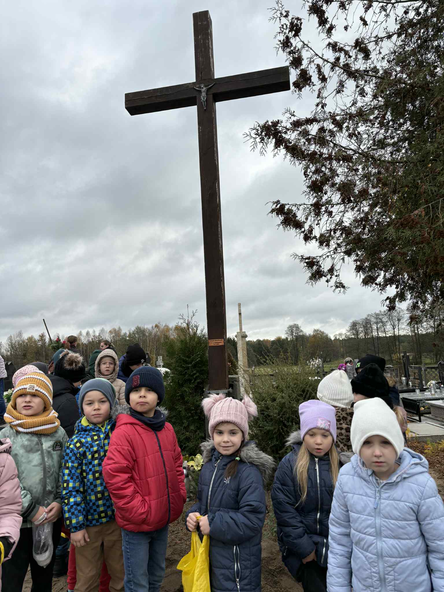 Grupy zerówkowe odwiedziły natomiast cmentarz parafialny w Skrwilnie. Dzieci pomodliły się przy Grobie Powstańców Styczniowych oraz zapaliły tam znicze. Płomień pamięci zapłonął również na grobach opuszczonych, pod krzyżem oraz pod Dębem Pamięci poświęconym św. Janowi Pawłowi II.