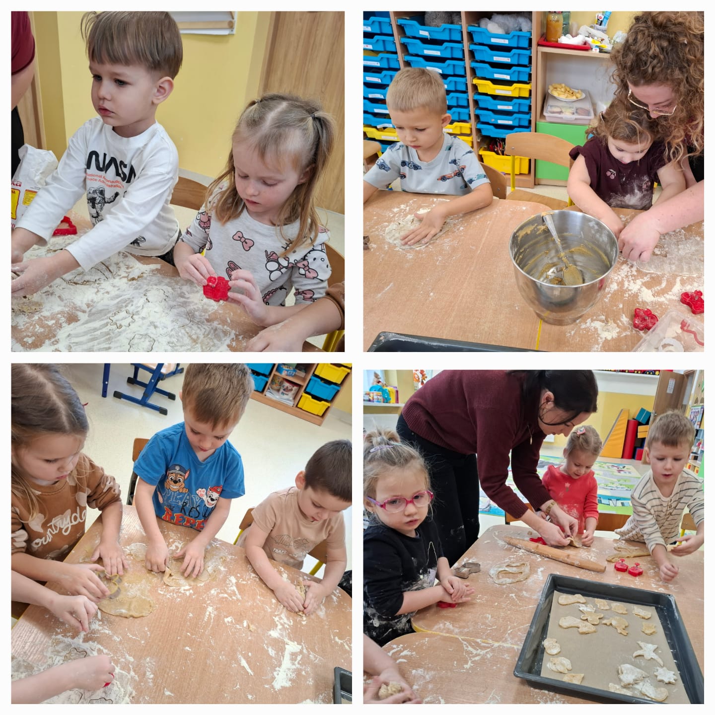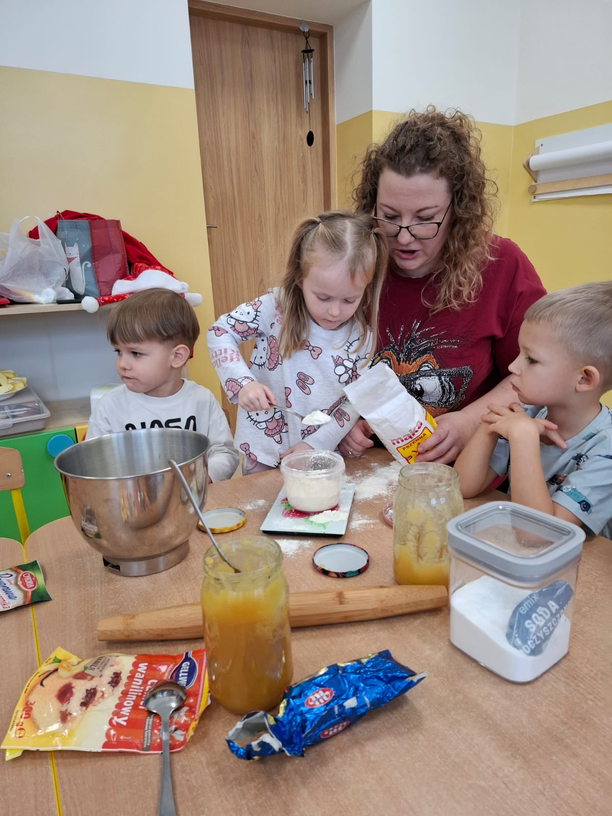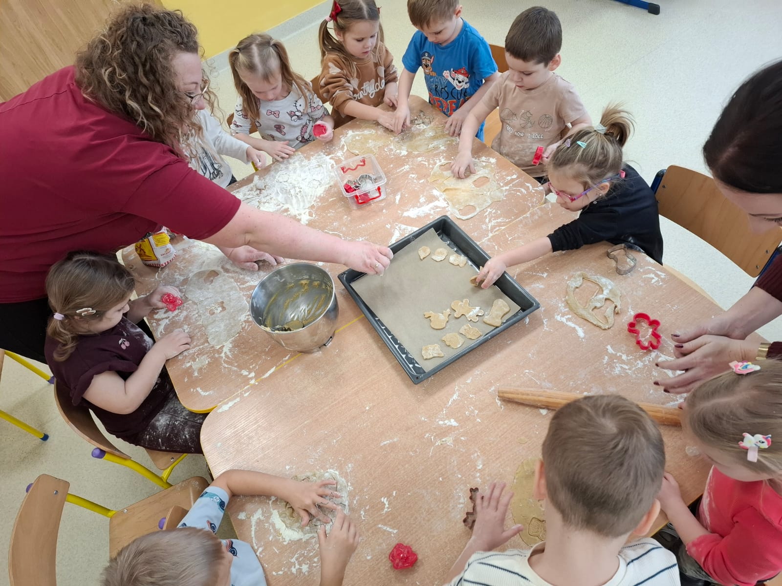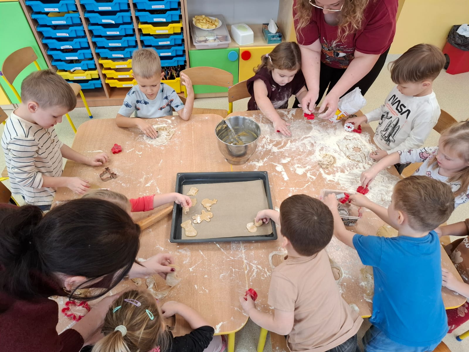 W przedszkolu odbyło się wyjątkowe wydarzenie - Pierniczki z Rodzicami! Dzieci wraz z dwiema mamami wzięły udział w warsztatach kulinarnych, podczas których wspólnie piekły pierniczki. Maluchy miały okazję pomóc w mieszaniu ciasta, wykładaniu pierniczków na blasze i dekorowaniu ich cukierkami.