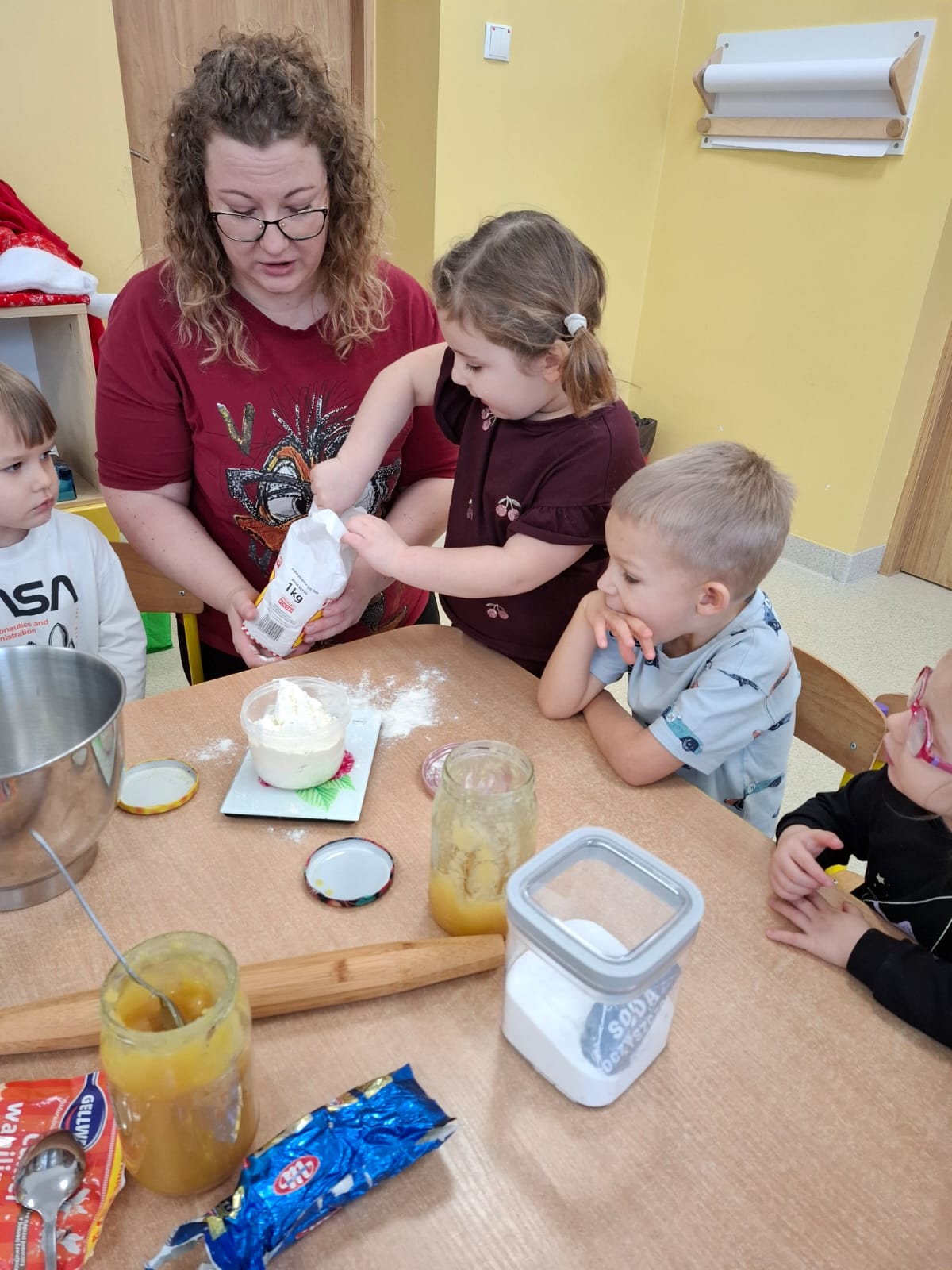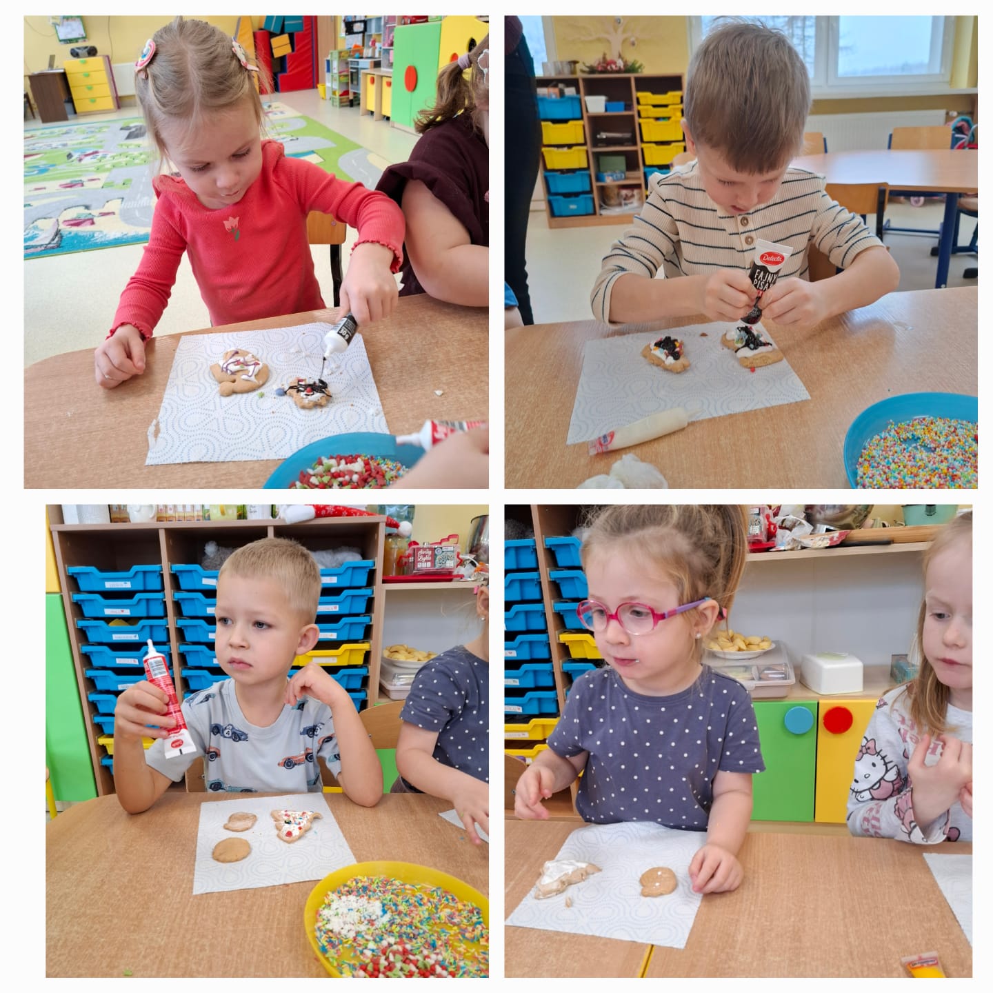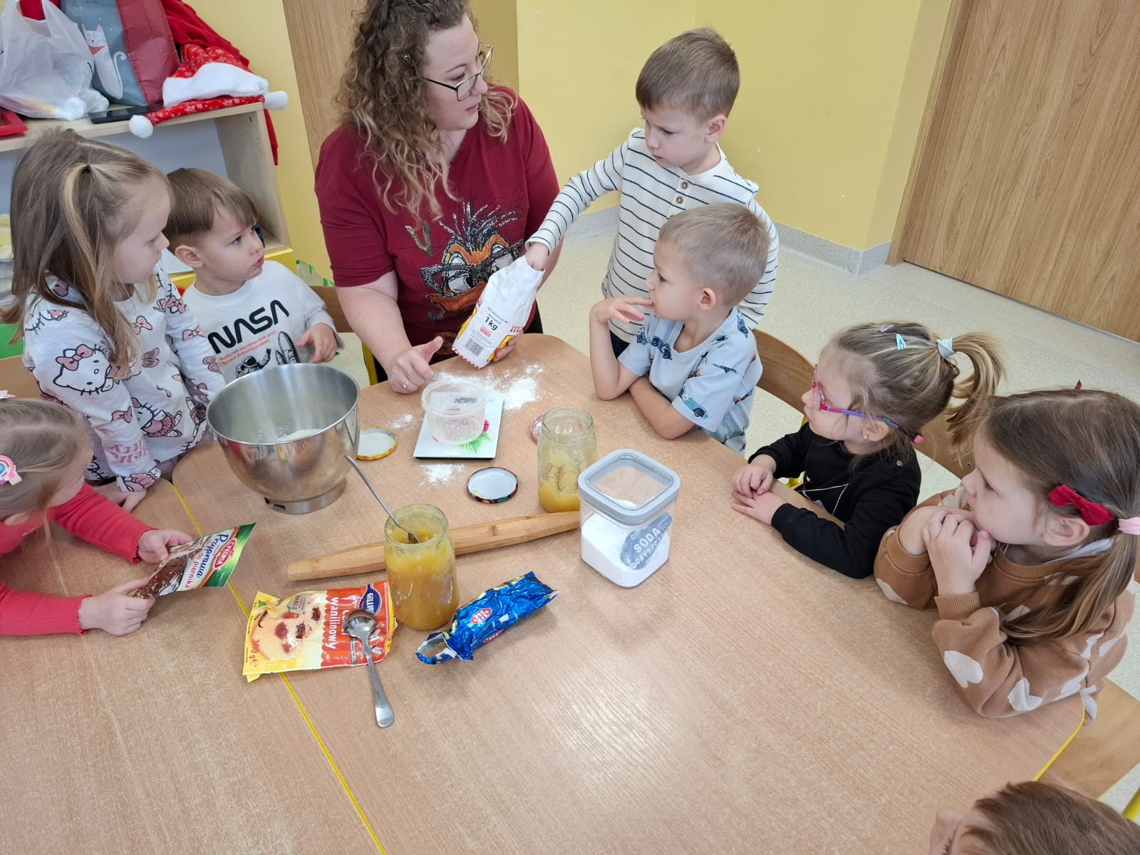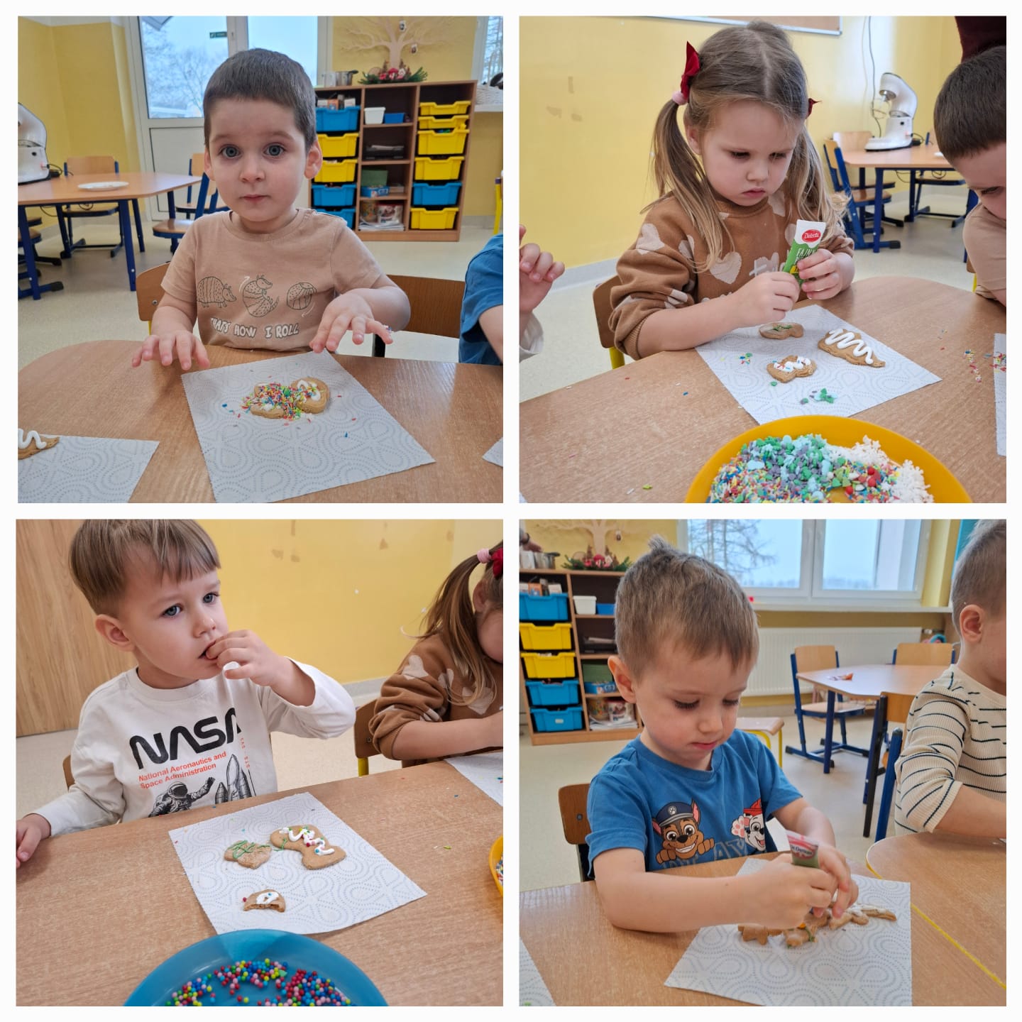 W przedszkolu odbyło się wyjątkowe wydarzenie - Pierniczki z Rodzicami! Dzieci wraz z dwiema mamami wzięły udział w warsztatach kulinarnych, podczas których wspólnie piekły pierniczki. Maluchy miały okazję pomóc w mieszaniu ciasta, wykładaniu pierniczków na blasze i dekorowaniu ich cukierkami.