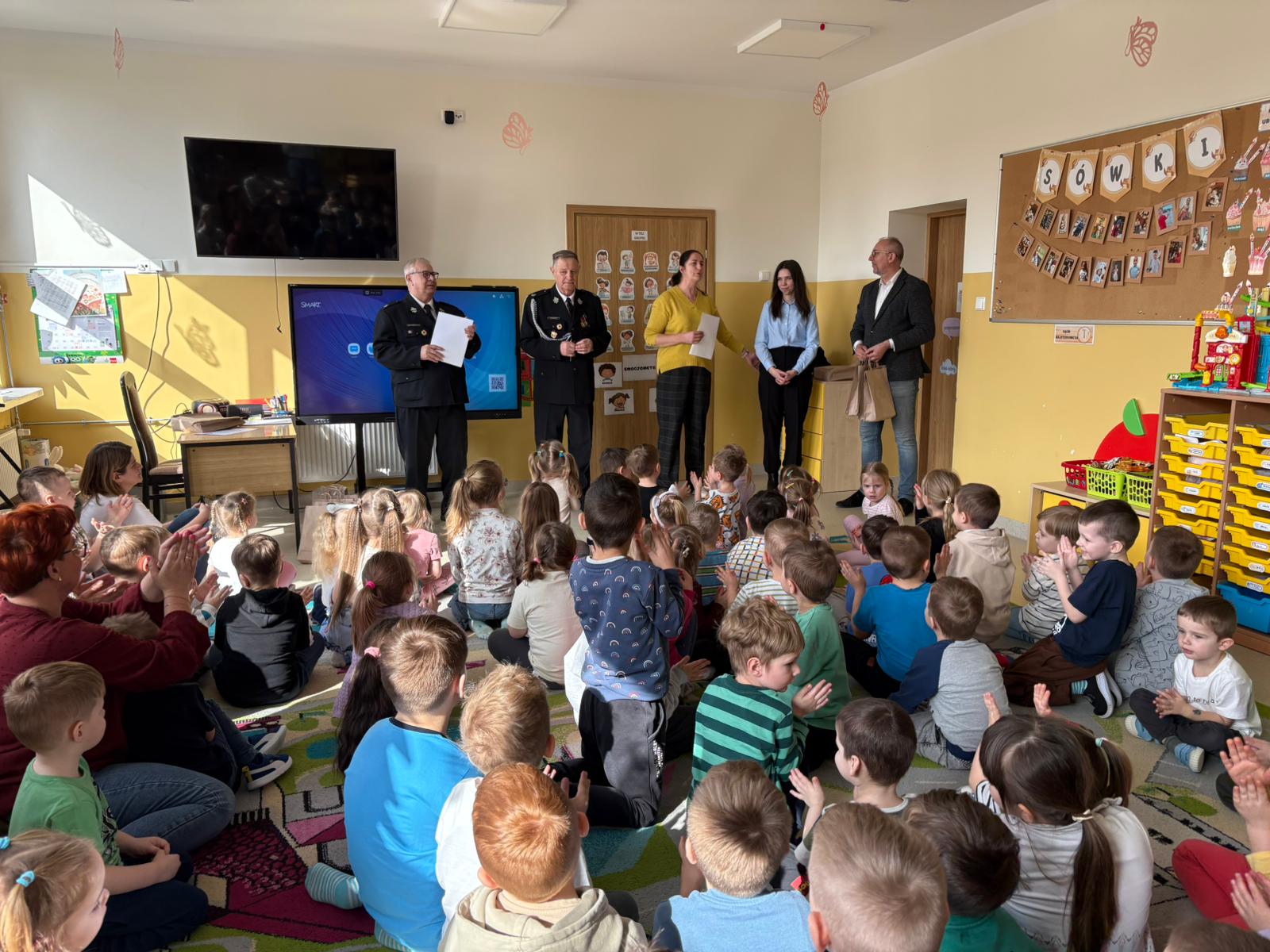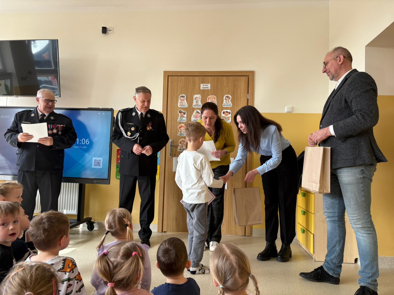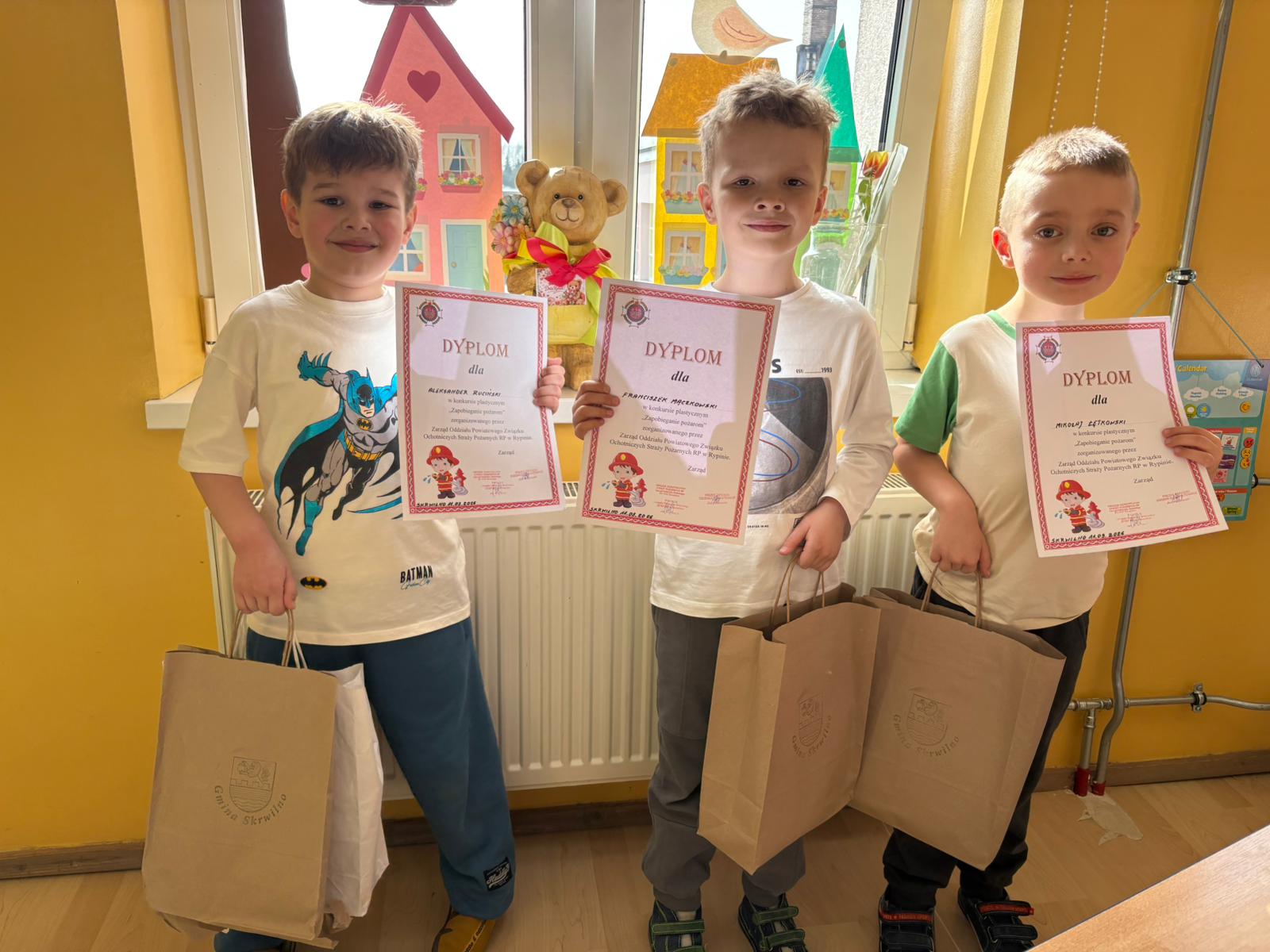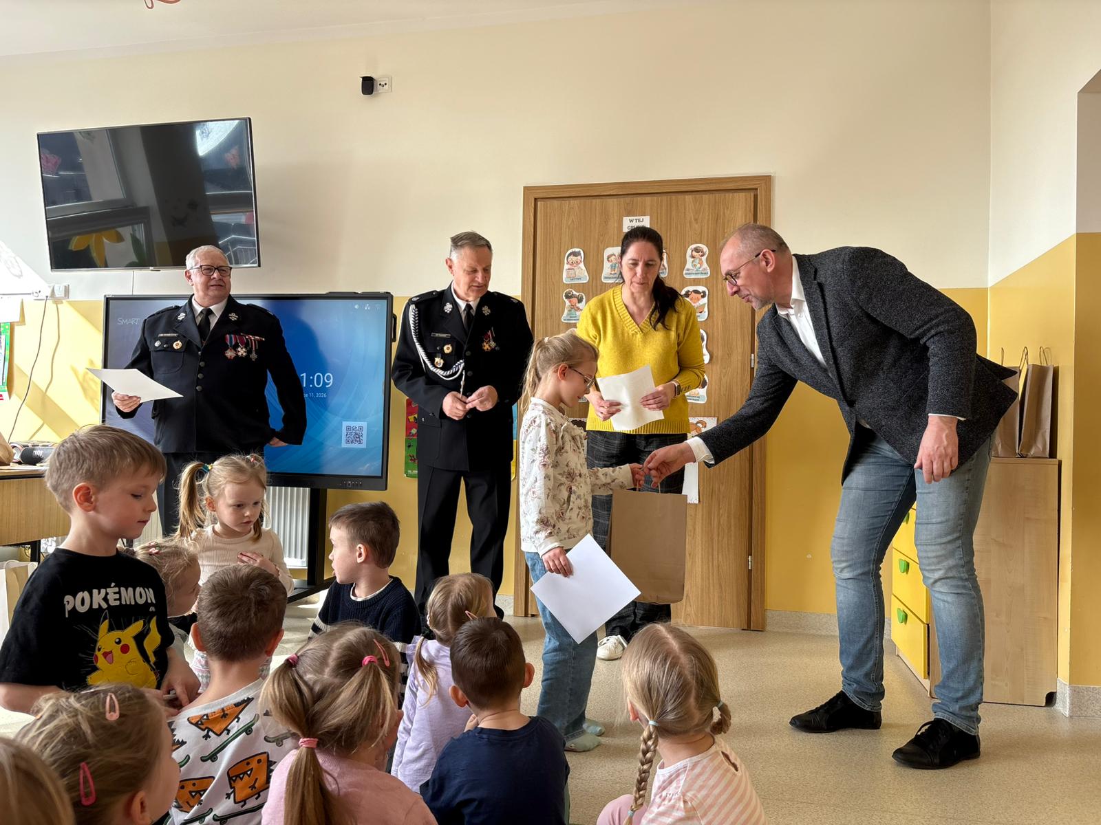 Z tej okazji odwiedzili nas Wójt Gminy Skrwilno- pan Dariusz Kolczyński, panowie strażacy oraz pani z Urzędu Gminy którzy wspólnie z Panią Dyrektor wręczyli dzieciom nagrody i wyróżnienia. Zostały one przyznane za prace plastyczne, które szczególnie wyróżniły się pomysłowością, kreatywnością oraz starannością wykonania.
