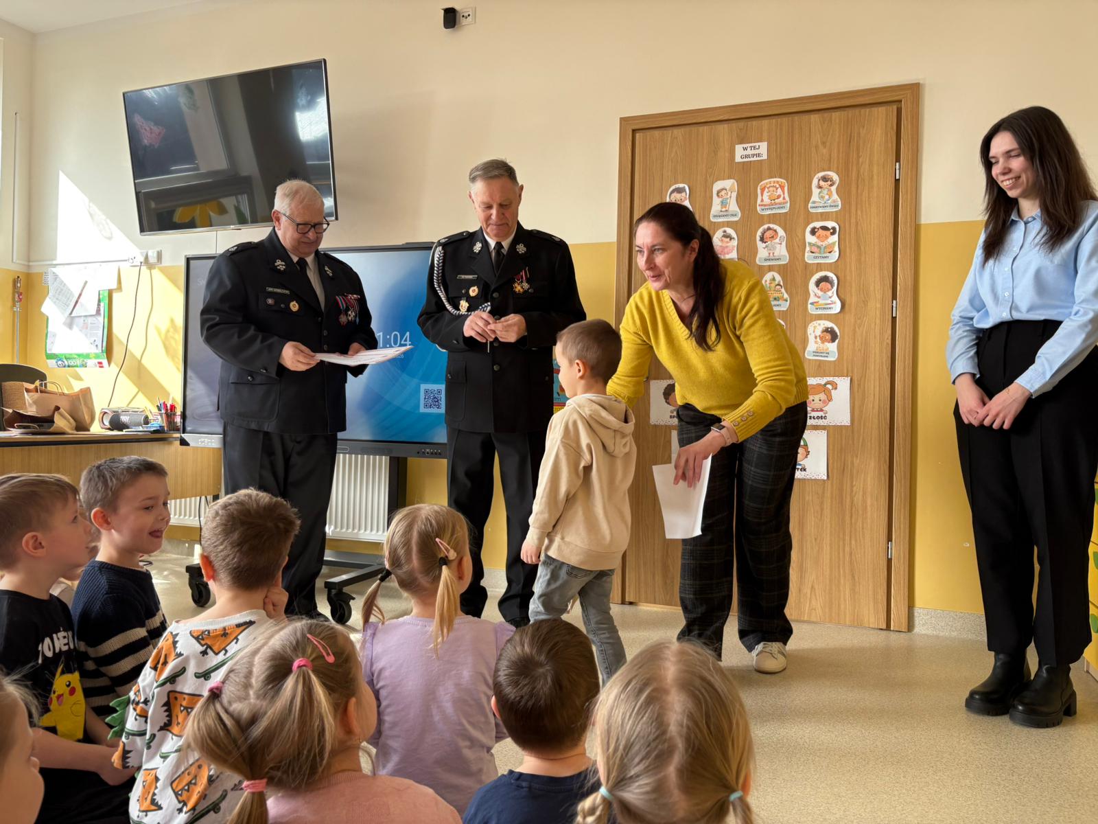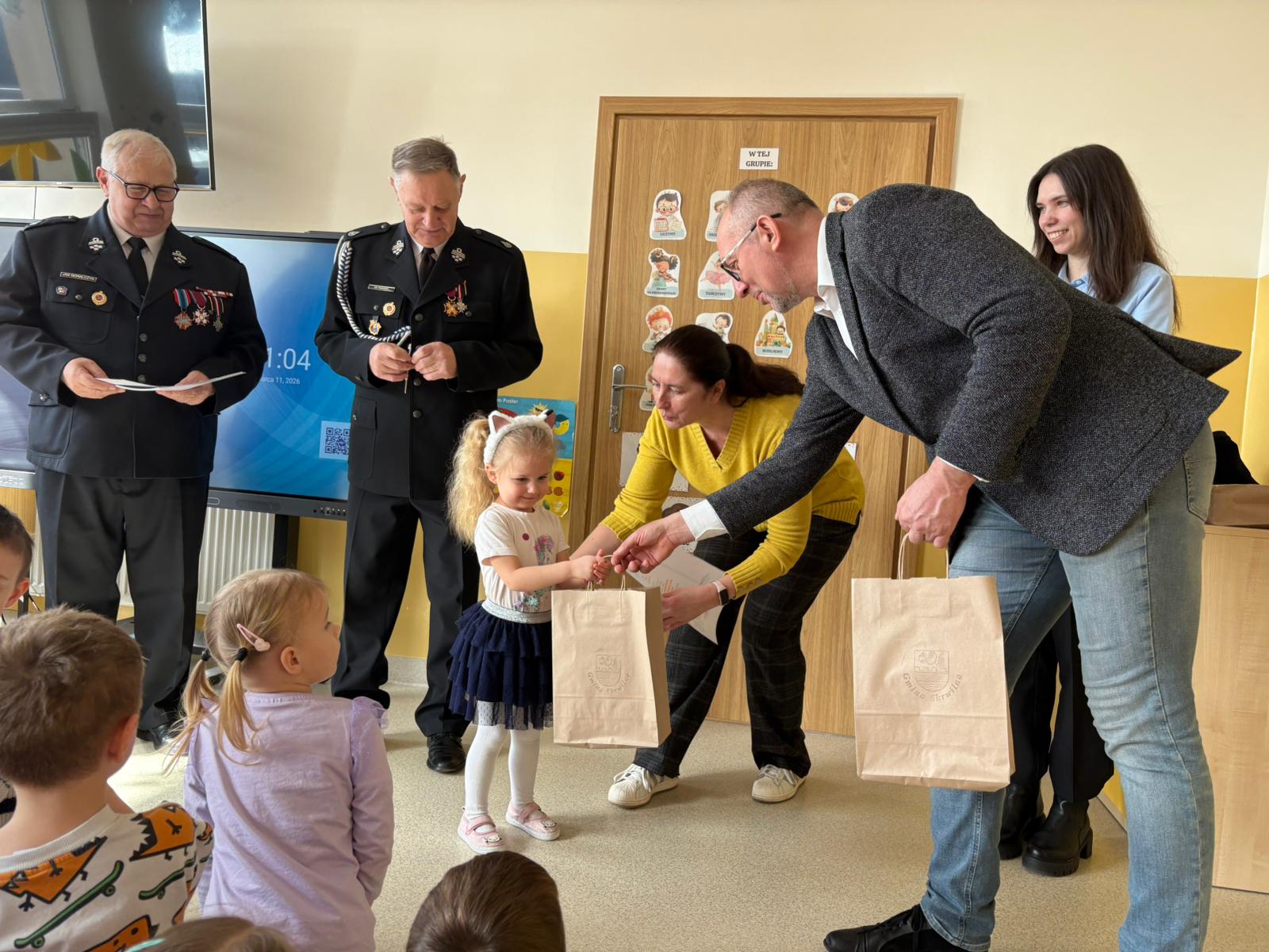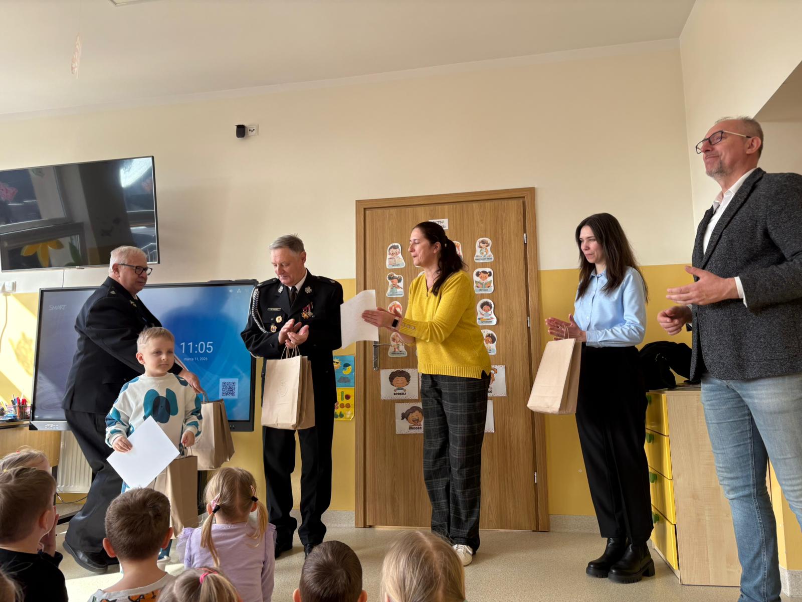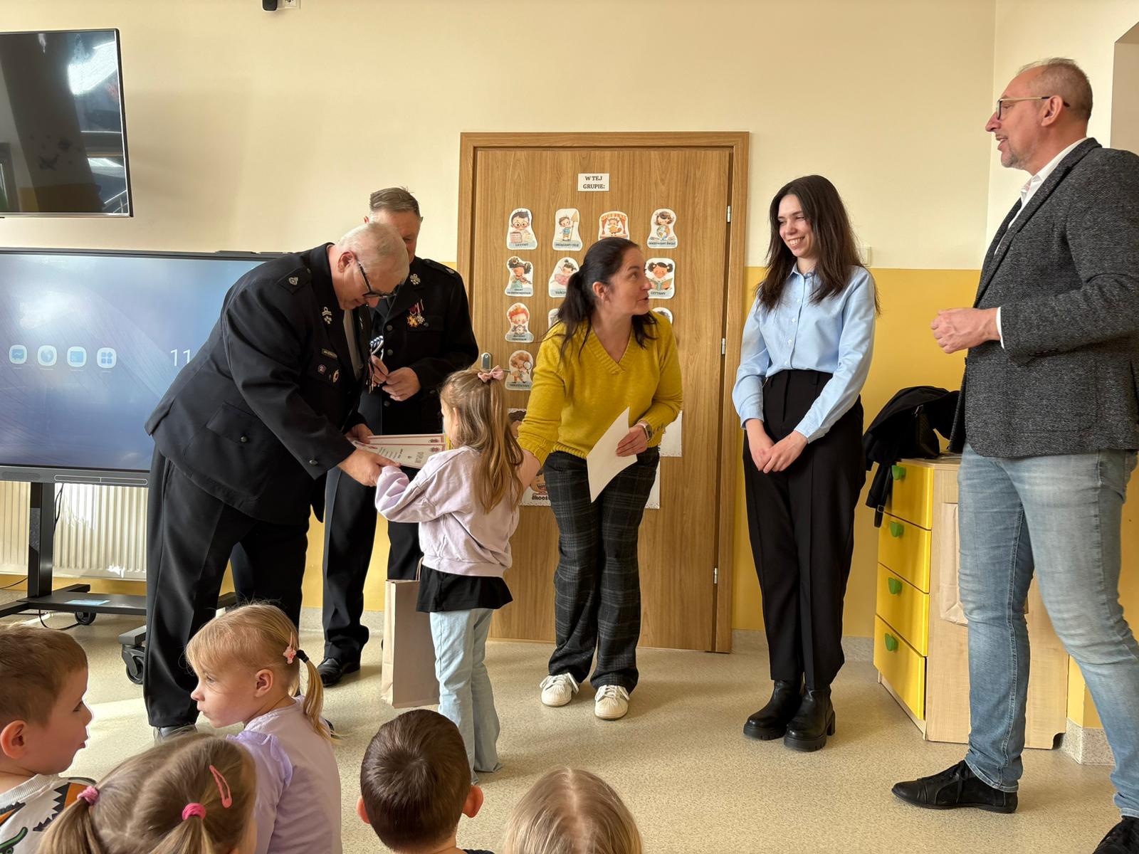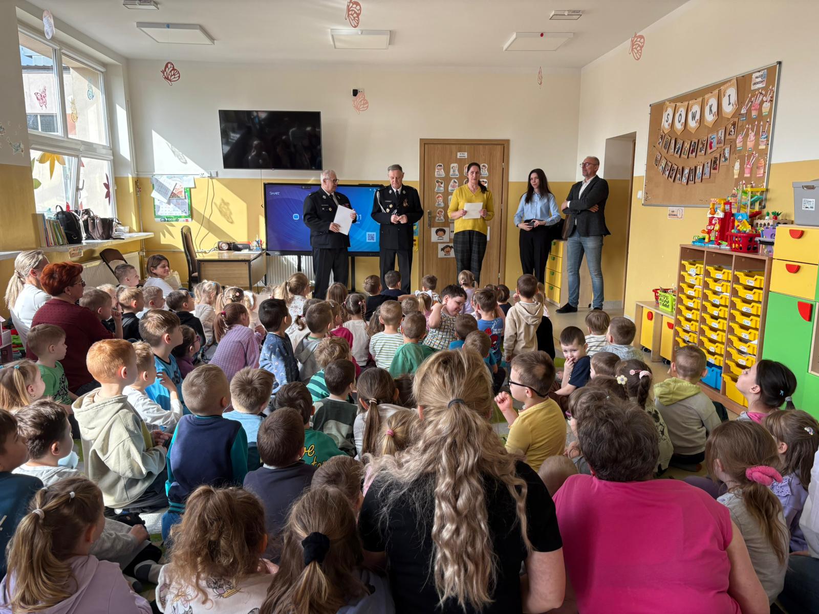 Z tej okazji odwiedzili nas Wójt Gminy Skrwilno- pan Dariusz Kolczyński, panowie strażacy oraz pani z Urzędu Gminy którzy wspólnie z Panią Dyrektor wręczyli dzieciom nagrody i wyróżnienia. Zostały one przyznane za prace plastyczne, które szczególnie wyróżniły się pomysłowością, kreatywnością oraz starannością wykonania.