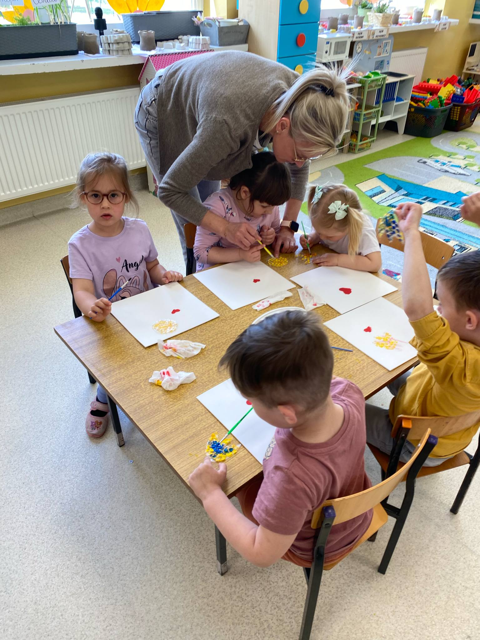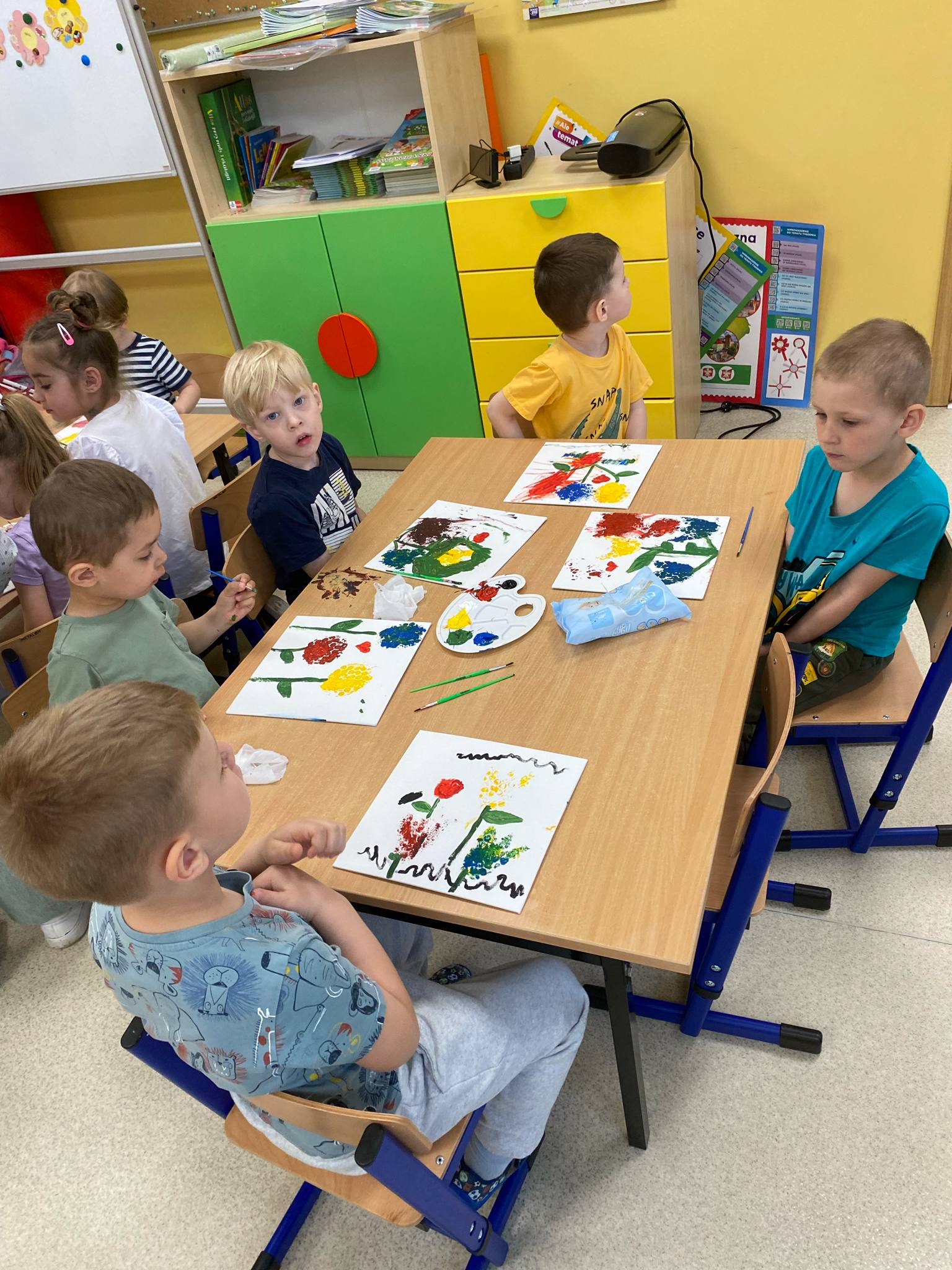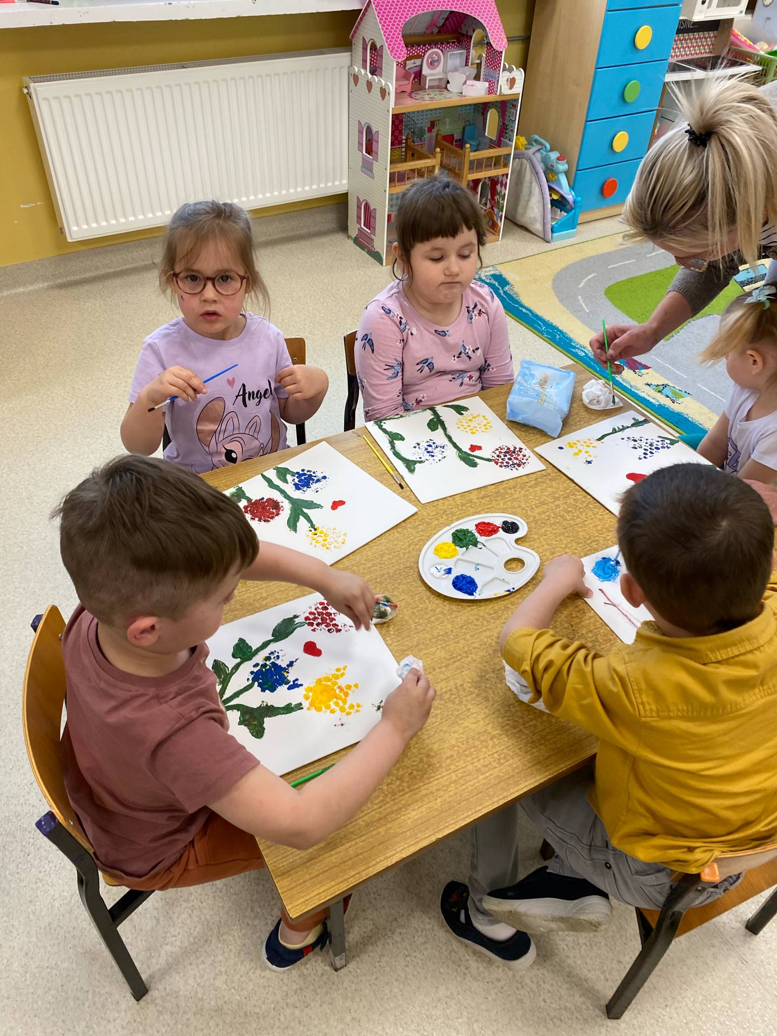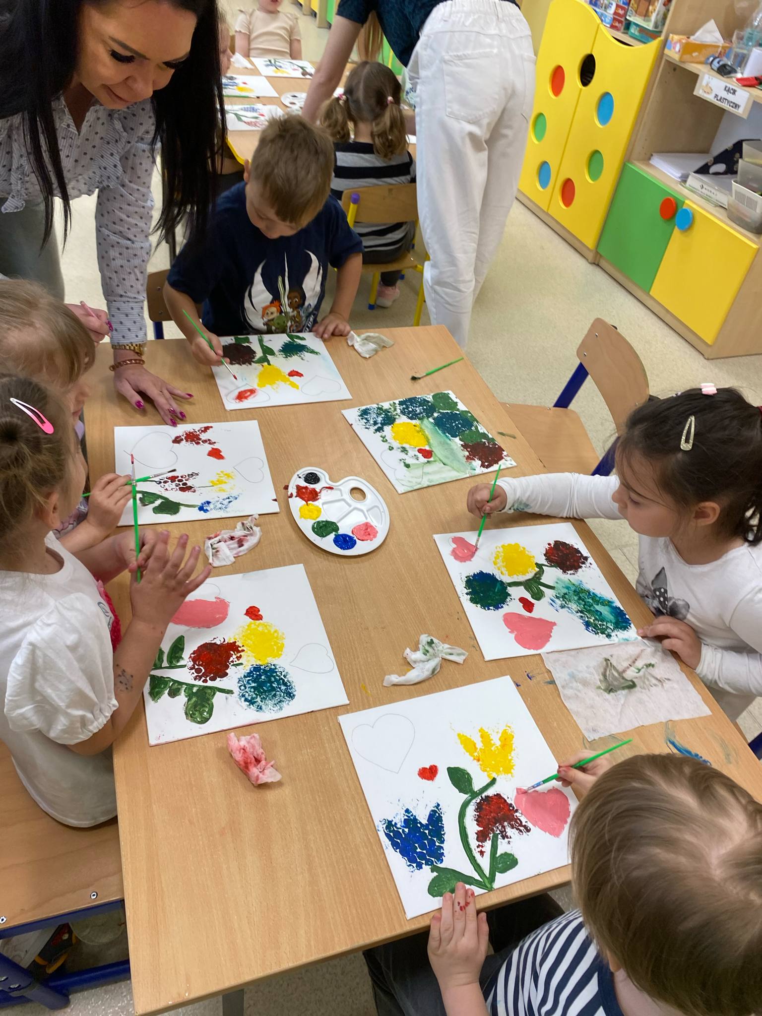 Przed świętem Mamy przedszkolaki z grup Sówki i Biedronki odbyły wyjątkowe spotkanie z panią malarką w czasie którego wspólnie przygotowywali upominek dla mamy. Dzieci malowały na płótnie zaproponowany przez Panią Iwonę wzór. Przedszkolaki świetnie się bawiły jako malarze, o czym świadczyły pełne zaangażowania miny i brudne rączki , a nawet twarze. Dumne dzieci wręczyły swoje dzieła podczas uroczystości uszczęśliwiając swoje Mamy.