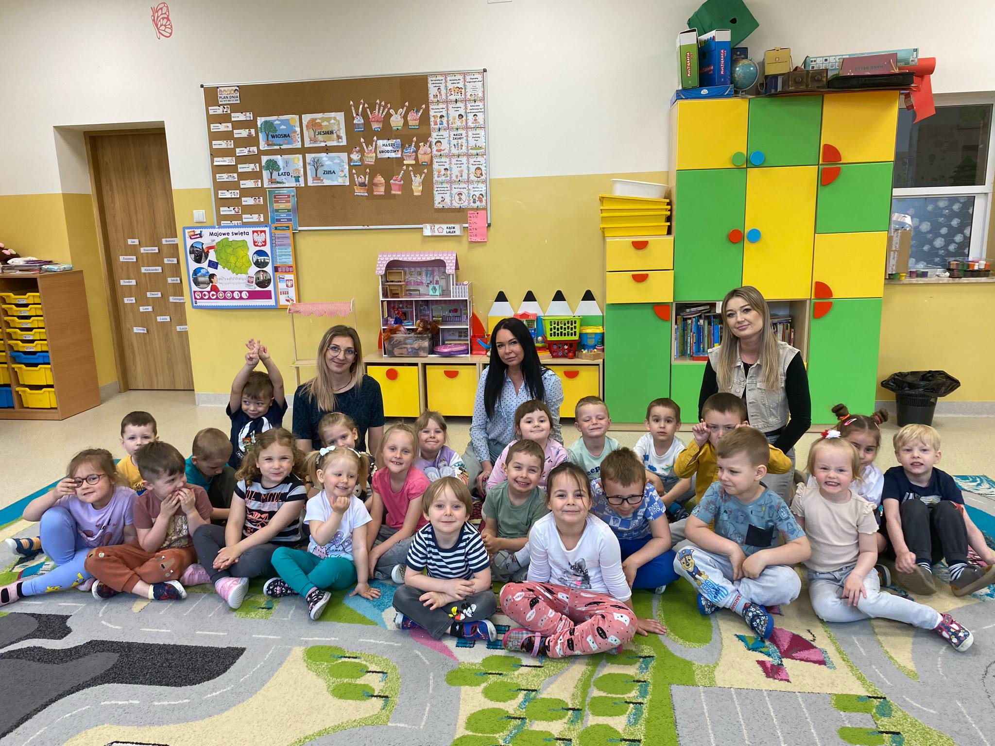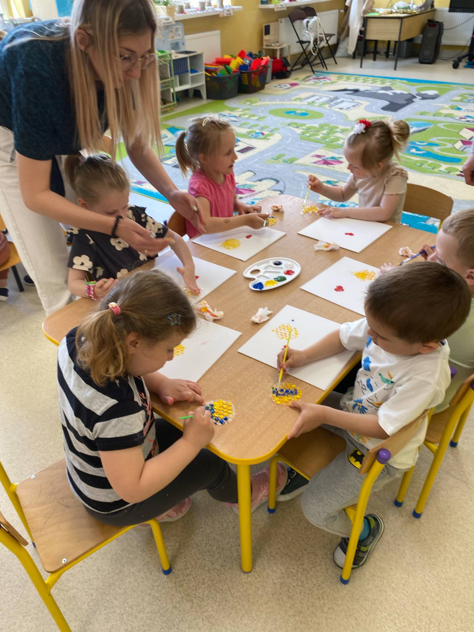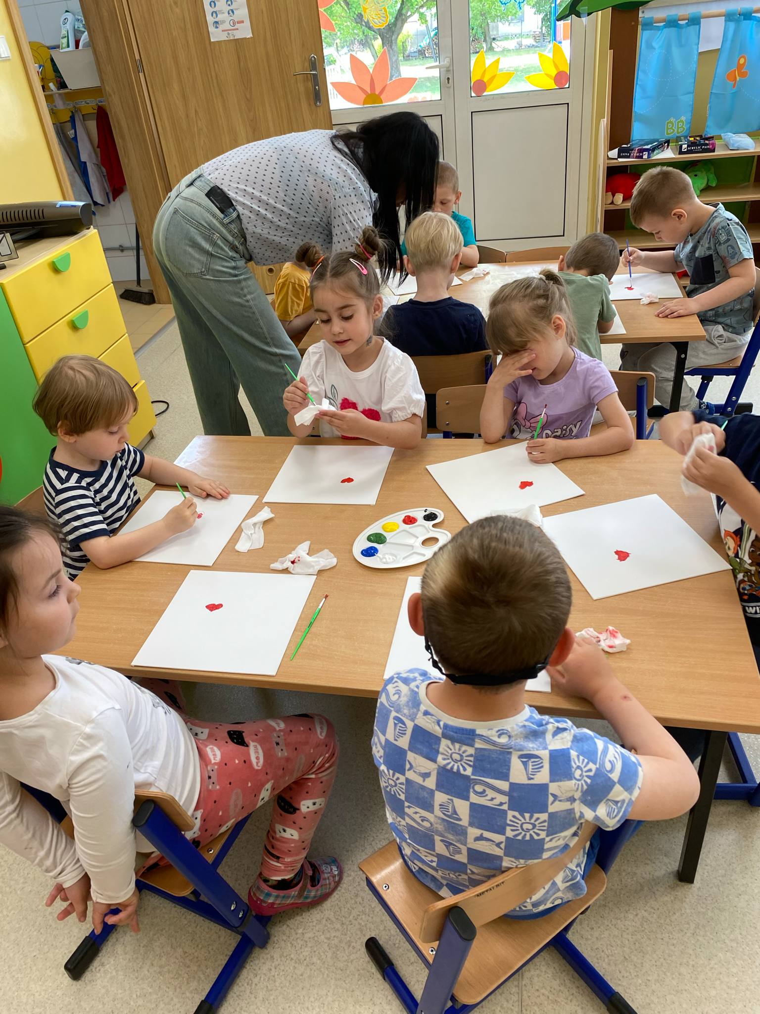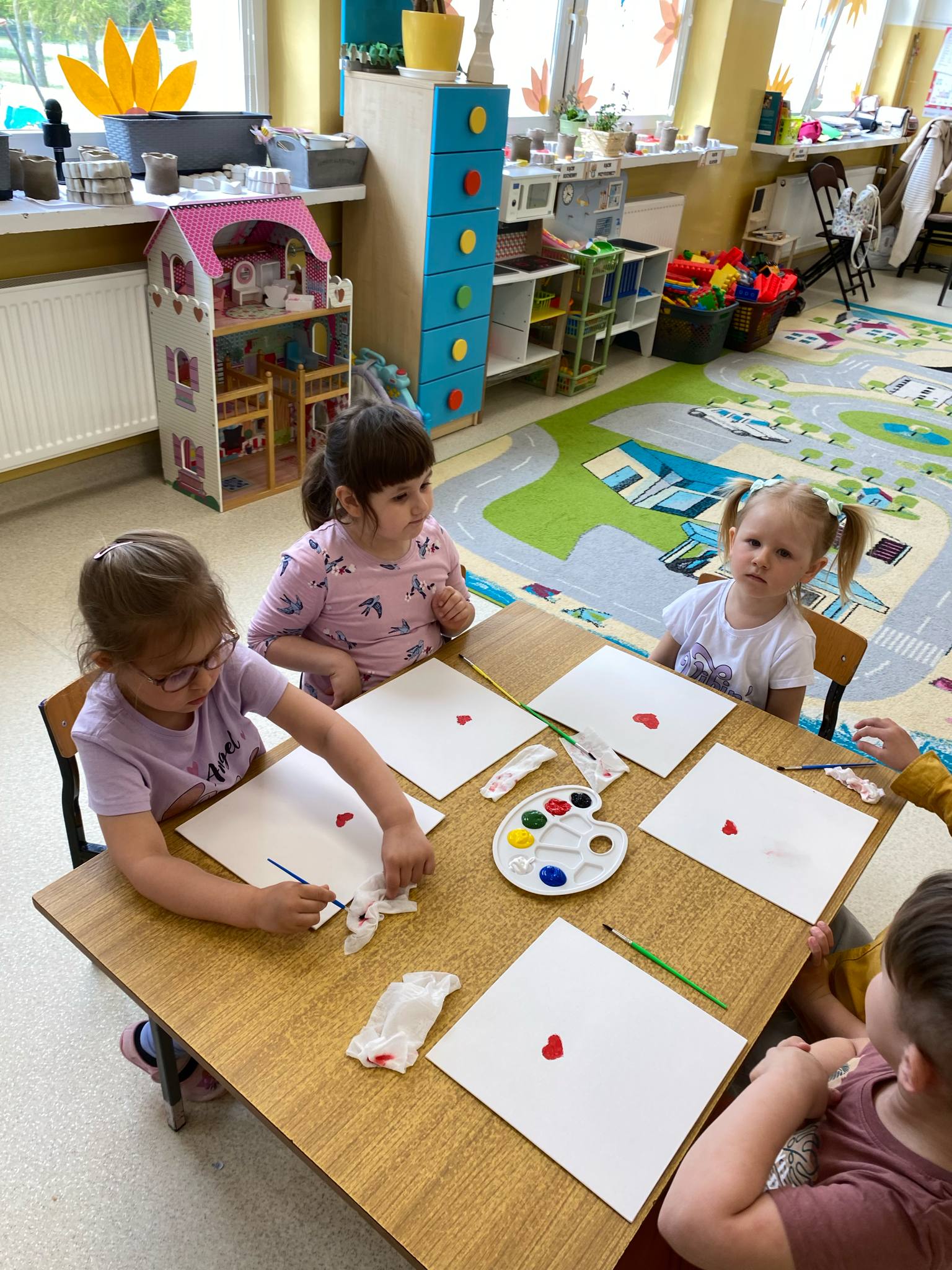Przed świętem Mamy przedszkolaki z grup Sówki i Biedronki odbyły wyjątkowe spotkanie z panią malarką w czasie którego wspólnie przygotowywali upominek dla mamy. Dzieci malowały na płótnie zaproponowany przez Panią Iwonę wzór. Przedszkolaki świetnie się bawiły jako malarze, o czym świadczyły pełne zaangażowania miny i brudne rączki , a nawet twarze. Dumne dzieci wręczyły swoje dzieła podczas uroczystości uszczęśliwiając swoje Mamy.