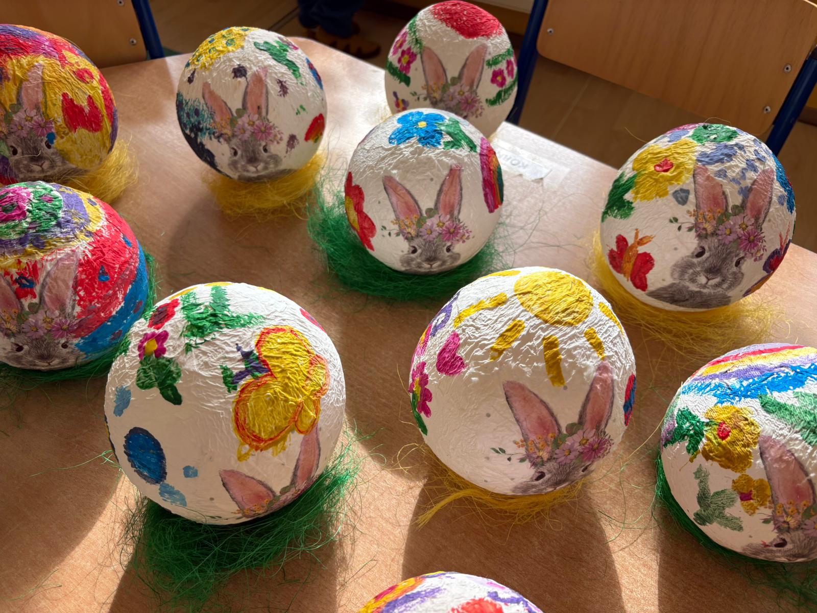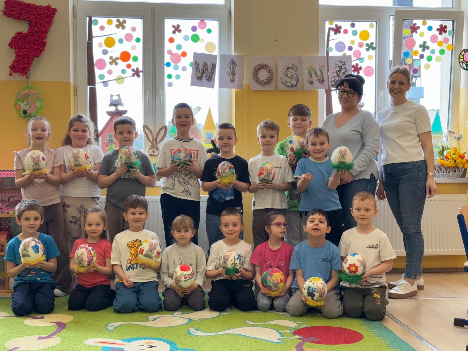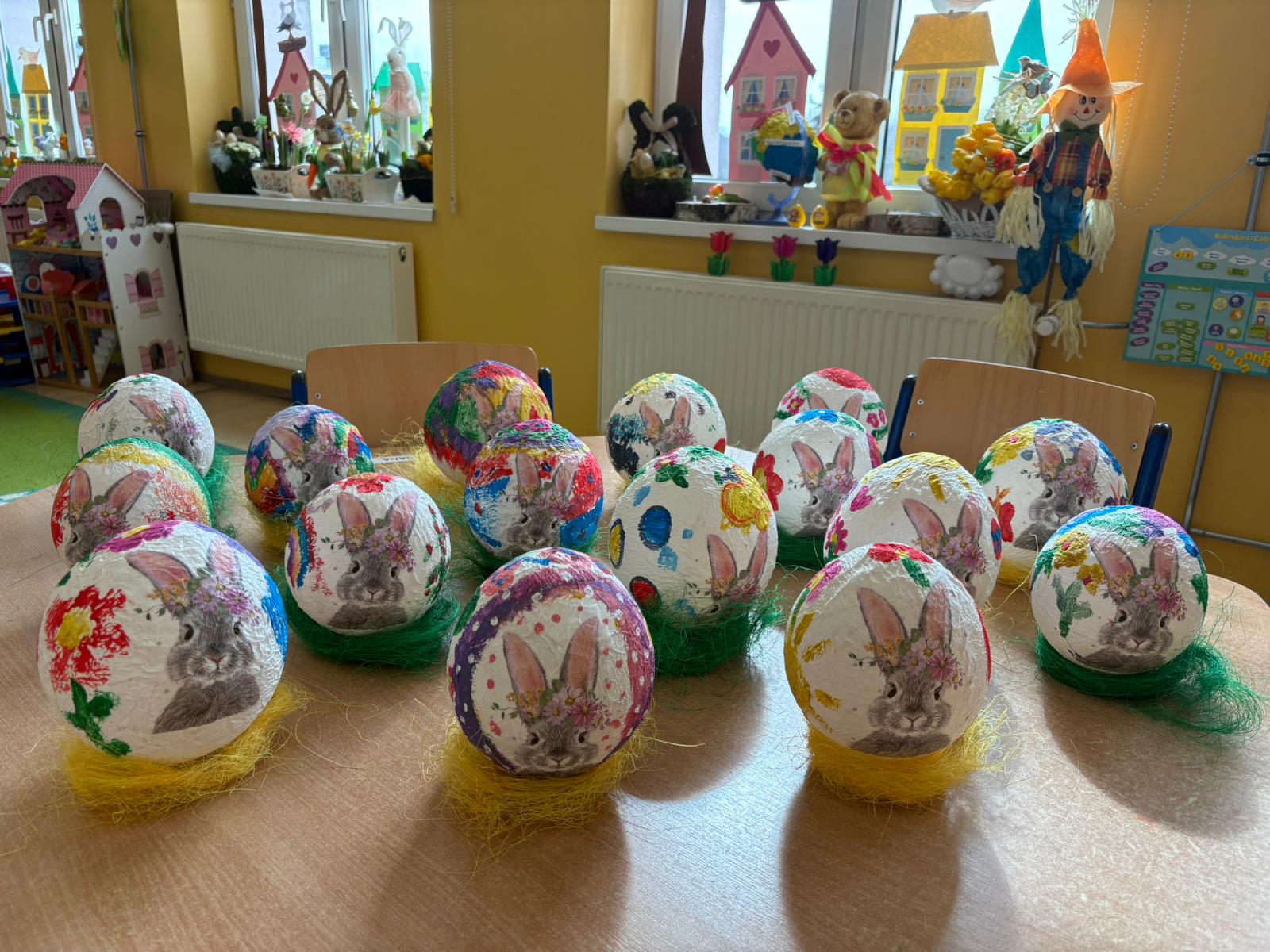 Efekty pracy dzieci są naprawdę zachwycające! Powstały piękne, kolorowe i bardzo pomysłowe ozdoby wielkanocne, które teraz zdobią naszą salę, tworząc radosną, świąteczną atmosferę.