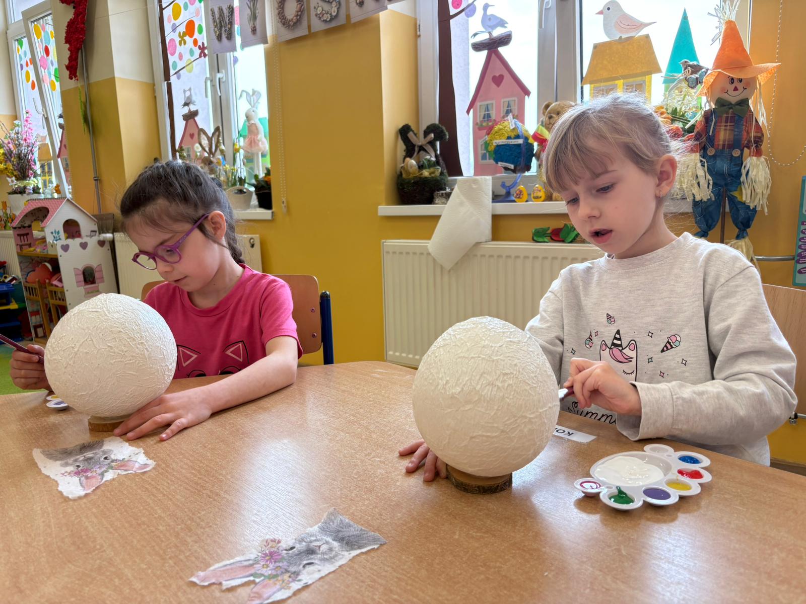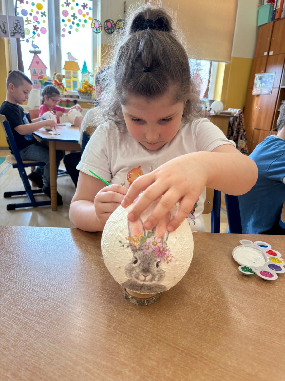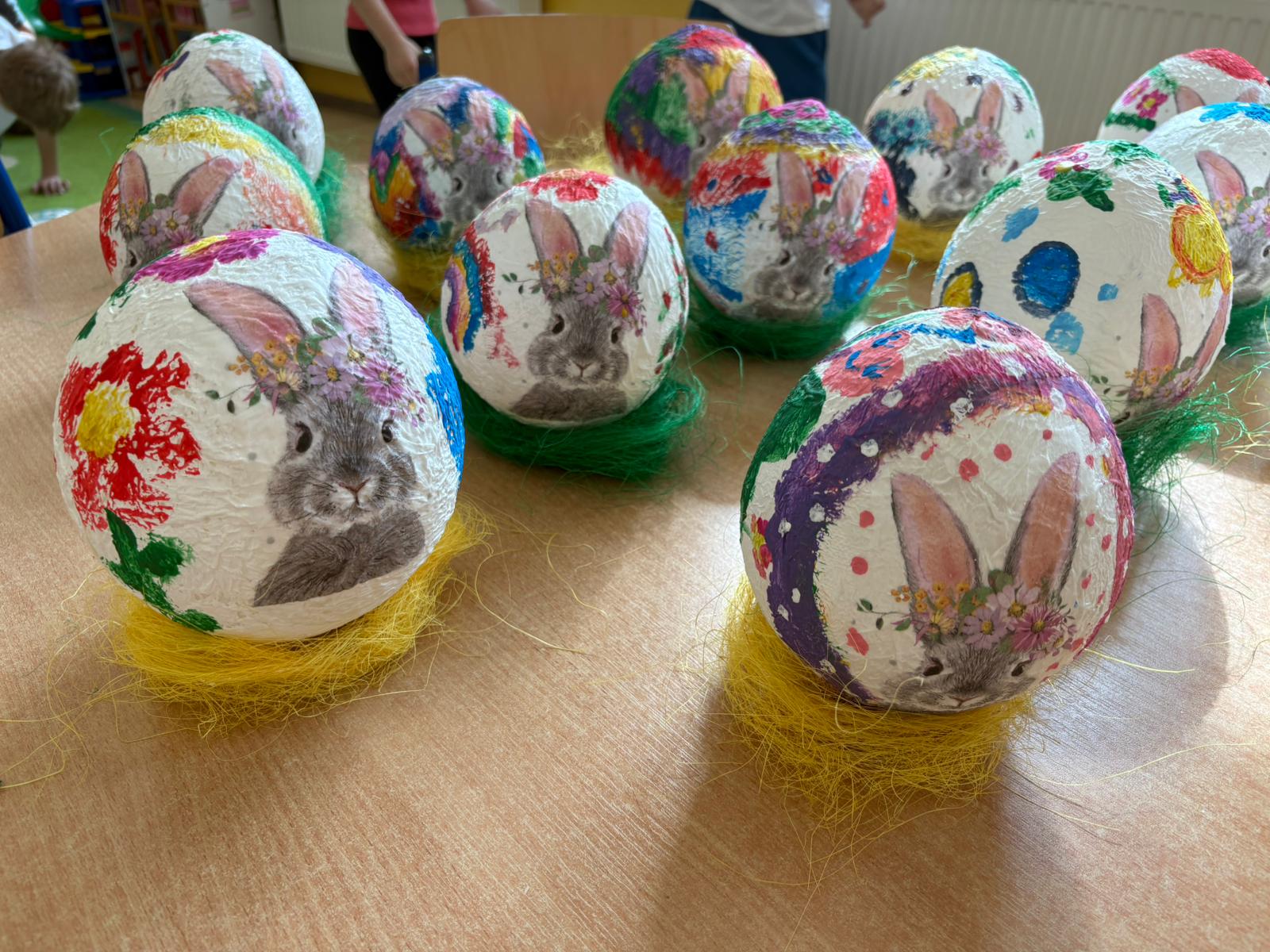 Podczas zajęć przedszkolaki tworzyły przestrzenne jajka wielkanocne. Dzieci zdobiły je fragmentami serwetek – była to technika decoupage – a także farbami, dzięki którym każde jajko nabrało wyjątkowego charakteru.